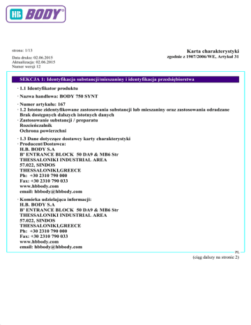 41.0 strona: 1/13 Data druku: 02.06.2015 Aktualizacja: 02.06.2015 Numer wersji 12 Karta charakterystyki zgodnie z 1907/2006/WE, Artykuł 31 SEKCJA 1: Identyfikacja substancji/mieszaniny i identyfikacja przedsiębiorstwa · 1.1 Identyfikator produktu · Nazwa handlowa: BODY 750 SYNT · Numer artykułu: 167 · 1.2 Istotne zidentyfikowane zastosowania substancji lub mieszaniny oraz zastosowania odradzane Brak dostępnych dalszych istotnych danych · Zastosowanie substancji / preparatu Rozcieńczalnik Ochrona powierzchni · 1.3 Dane dotyczące dostawcy karty charakterystyki · Producent/Dostawca: H.B. BODY S.A B' ENTRANCE BLOCK 50 DA9 & MB6 Str THESSALONIKI INDUSTRIAL AREA 57.022, SINDOS THESSALONIKI,GREECE Ph: +30 2310 790 000 Fax: +30 2310 790 033 www.hbbody.com email: [email protected] · Komórka udzielająca informacji: H.B. BODY S.A B' ENTRANCE BLOCK 50 DA9 & MB6 Str THESSALONIKI INDUSTRIAL AREA 57.022, SINDOS THESSALONIKI,GREECE Ph: +30 2310 790 000 Fax: +30 2310 790 033 www.hbbody.com email: [email protected] PL (ciąg dalszy na stronie 2) 41.0 strona: 2/13 Karta charakterystyki zgodnie z 1907/2006/WE, Artykuł 31 Data druku: 02.06.2015 Aktualizacja: 02.06.2015 Numer wersji 12 Nazwa handlowa: BODY 750 SYNT (ciąg dalszy od strony 1) SEKCJA 2: Identyfikacja zagrożeń · 2.1 Klasyfikacja substancji lub mieszaniny · Klasyfikacja zgodnie z rozporządzeniem (WE) nr 1272/2008 GHS02 płomień Flam. Liq. 3 H226 Łatwopalna ciecz i pary. GHS08 zagrożenie dla zdrowia STOT RE 1 Asp. Tox. 1 H372 Powoduje uszkodzenie ośrodkowego układu nerwowego poprzez długotrwałe lub powtarzane narażenie. H304 Połknięcie i dostanie się przez drogi oddechowe może grozić śmiercią. GHS09 środowisko Aquatic Chronic 2 H411 Działa toksycznie na organizmy wodne, powodując długotrwałe skutki. GHS07 STOT SE 3 H335 Może powodować podrażnienie dróg oddechowych. · 2.2 Elementy oznakowania · Oznakowanie zgodnie z rozporządzeniem (WE) nr 1272/2008 Produkt jest klasyfikowany i oznakowany zgodnie z przepisami CLP. · Piktogramy określające rodzaj zagrożenia GHS02 GHS07 GHS08 GHS09 · Hasło ostrzegawcze Niebezpieczeństwo · Składniki określające niebezpieczeństwo do etykietowania: Solwent nafta (ropa naftowa), węglowodory lekkie aromatyczne Benzyna ciężka hydroodsiarczona (ropa naftowa) · Zwroty wskazujące rodzaj zagrożenia H226 Łatwopalna ciecz i pary. H335 Może powodować podrażnienie dróg oddechowych. H372 Powoduje uszkodzenie ośrodkowego układu nerwowego poprzez długotrwałe lub powtarzane narażenie. H304 Połknięcie i dostanie się przez drogi oddechowe może grozić śmiercią. H411 Działa toksycznie na organizmy wodne, powodując długotrwałe skutki. (ciąg dalszy na stronie 3) PL 41.0 strona: 3/13 Data druku: 02.06.2015 Aktualizacja: 02.06.2015 Numer wersji 12 Karta charakterystyki zgodnie z 1907/2006/WE, Artykuł 31 Nazwa handlowa: BODY 750 SYNT (ciąg dalszy od strony 2) · Zwroty wskazujące środki ostrożności P210 Przechowywać z dala od źródeł ciepła, gorących powierzchni, iskrzenia, otwartego ognia i innych źródeł zapłonu. Palenie wzbronione. P241 Używać elektrycznego/wentylującego/oświetleniowego/przeciwwybuchowego sprzętu. P301+P310 W PRZYPADKU POŁKNIĘCIA: Natychmiast skontaktować się z OŚRODKIEM ZATRUĆ/lekarzem. P303+P361+P353 W PRZYPADKU KONTATKU ZE SKÓRĄ (lub z włosami): Natychmiast zdjąć całą zanieczyszczoną odzież. Spłukać skórę pod strumieniem wody/prysznicem. P405 Przechowywać pod zamknięciem. P501 Zawartość / pojemnik usuwać zgodnie z przepisami miejscowymi / regionalnymi / narodowymi / międzynarodowymi. · 2.3 Inne zagrożenia · Wyniki oceny właściwości PBT i vPvB · PBT: Nie nadający się do zastosowania. · vPvB: Nie nadający się do zastosowania. SEKCJA 3: Skład/informacja o składnikach · 3.2 Charakterystyka chemiczna: Mieszaniny · Opis: Mieszanka z niżej wymienionych składników z bezpiecznymi domieszkami. · Składniki niebezpieczne: CAS: 64742-95-6 Solwent nafta (ropa naftowa), węglowodory lekkie 45 - <50% EINECS: 265-199-0 aromatyczne Numer indeksu: 649-356-00-4 Flam. Liq. 3, H226 Reg.nr.: 01-2119455851-35-0001 Asp. Tox. 1, H304 Aquatic Chronic 2, H411 Acute Tox. 4, H332; STOT SE 3, H335 CAS: 64742-82-1 Benzyna ciężka hydroodsiarczona (ropa naftowa) 45 - <50% EINECS: 265-185-4 STOT RE 1, H372; Asp. Tox. 1, H304 Numer indeksu: 649-330-00-2 Reg.nr.: 01-2119458049-33-0002 · Wskazówki dodatkowe: Pełna treść przytoczonych wskazówek dotyczących zagrożeń znajduje się w rozdziale 16. SEKCJA 4: Środki pierwszej pomocy · 4.1 Opis środków pierwszej pomocy · Wskazówki ogólne: Symptomy zatrucia mogą wystąpić dopiero po kilku godzinach, dlatego kontrola lekarska niezbędna conajmniej przez 48 godzin po wypadku. · Po wdychaniu: Dostarczyć świeże powietrze, w razie dolegliwości wezwać lekarza. · Po styczności ze skórą: Natychmiast zmyć wodą. · Po styczności z okiem: Płukać oczy z otwartą powieką przez kilka minut pod bieżącą wodą. · Po przełknięciu: Przy trwałych dolegliwościach porozumieć się z lekarzem. (ciąg dalszy na stronie 4) PL 41.0 strona: 4/13 Data druku: 02.06.2015 Aktualizacja: 02.06.2015 Numer wersji 12 Karta charakterystyki zgodnie z 1907/2006/WE, Artykuł 31 Nazwa handlowa: BODY 750 SYNT (ciąg dalszy od strony 3) · 4.2 Najważniejsze ostre i opóźnione objawy oraz skutki narażenia Brak dostępnych dalszych istotnych danych · 4.3 Wskazania dotyczące wszelkiej natychmiastowej pomocy lekarskiej i szczególnego postępowania z poszkodowanym Brak dostępnych dalszych istotnych danych SEKCJA 5: Postępowanie w przypadku pożaru · 5.1 Środki gaśnicze · Przydatne środki gaśnicze: CO2, piasek, proszek gaśniczy. Nie stosować wody. · Środki gaśnicze nieprzydatne ze względów bezpieczeństwa: Woda pełnym strumieniem · 5.2 Szczególne zagrożenia związane z substancją lub mieszaniną Brak dostępnych dalszych istotnych danych · 5.3