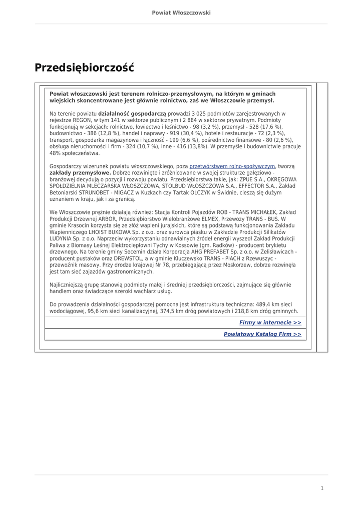 Powiat Włoszczowski Przedsiębiorczość Powiat włoszczowski jest terenem rolniczo-przemysłowym, na którym w gminach wiejskich skoncentrowane jest głównie rolnictwo, zaś we Włoszczowie przemysł. Na terenie powiatu działalność gospodarczą prowadzi 3 025 podmiotów zarejestrowanych w rejestrze REGON, w tym 141 w sektorze publicznym i 2 884 w sektorze prywatnym. Podmioty funkcjonują w sekcjach: rolnictwo, łowiectwo i leśnictwo - 98 (3,2 %), przemysł - 528 (17,6 %), budownictwo - 386 (12,8 %), handel i naprawy - 919 (30,4 %), hotele i restauracje - 72 (2,3 %), transport, gospodarka magazynowa i łączność - 199 (6,6 %), pośrednictwo finansowe - 80 (2,6 %), obsługa nieruchomości i firm - 324 (10,7 %), inne - 416 (13,8%). W przemyśle i budownictwie pracuje 48% społeczeństwa. Gospodarczy wizerunek powiatu włoszczowskiego, poza przetwórstwem rolno-spożywczym, tworzą zakłady przemysłowe. Dobrze rozwinięte i zróżnicowane w swojej strukturze gałęziowo branżowej decydują o pozycji i rozwoju powiatu. Przedsiębiorstwa takie, jak: ZPUE S.A., OKRĘGOWA SPÓŁDZIELNIA MLECZARSKA WŁOSZCZOWA, STOLBUD WŁOSZCZOWA S.A., EFFECTOR S.A., Zakład Betoniarski STRUNOBET - MIGACZ w Kuzkach czy Tartak OLCZYK w Świdnie, cieszą się dużym uznaniem w kraju, jak i za granicą. We Włoszczowie prężnie działają również: Stacja Kontroli Pojazdów ROB - TRANS MICHAŁEK, Zakład Produkcji Drzewnej ARBOR, Przedsiębiorstwo Wielobranżowe ELMEX, Przewozy TRANS - BUS. W gminie Krasocin korzysta się ze złóż wapieni jurajskich, które są podstawą funkcjonowania Zakładu Wapienniczego LHOIST BUKOWA Sp. z o.o. oraz surowca piasku w Zakładzie Produkcji Silikatów LUDYNIA Sp. z o.o. Naprzeciw wykorzystaniu odnawialnych źródeł energii wyszedł Zakład Produkcji Paliwa z Biomasy Leśnej Elektrociepłowni Tychy w Kossowie (gm. Radków) - producent brykietu drzewnego. Na terenie gminy Secemin działa Korporacja AHG PREFABET Sp. z o.o. w Żelisławicach producent pustaków oraz DREWSTOL, a w gminie Kluczewsko TRANS - PIACH z Rzewuszyc przewoźnik masowy. Przy drodze krajowej Nr 78, przebiegającą przez Moskorzew, dobrze rozwinęła jest tam sieć zajazdów gastronomicznych. Najliczniejszą grupę stanowią podmioty małej i średniej przedsiębiorczości, zajmujące się głównie handlem oraz świadczące szeroki wachlarz usług. Do prowadzenia działalności gospodarczej pomocna jest infrastruktura techniczna: 489,4 km sieci wodociągowej, 95,6 km sieci kanalizacyjnej, 374,5 km dróg powiatowych i 218,8 km dróg gminnych. Firmy w internecie >> Powiatowy Katalog Firm >> 1