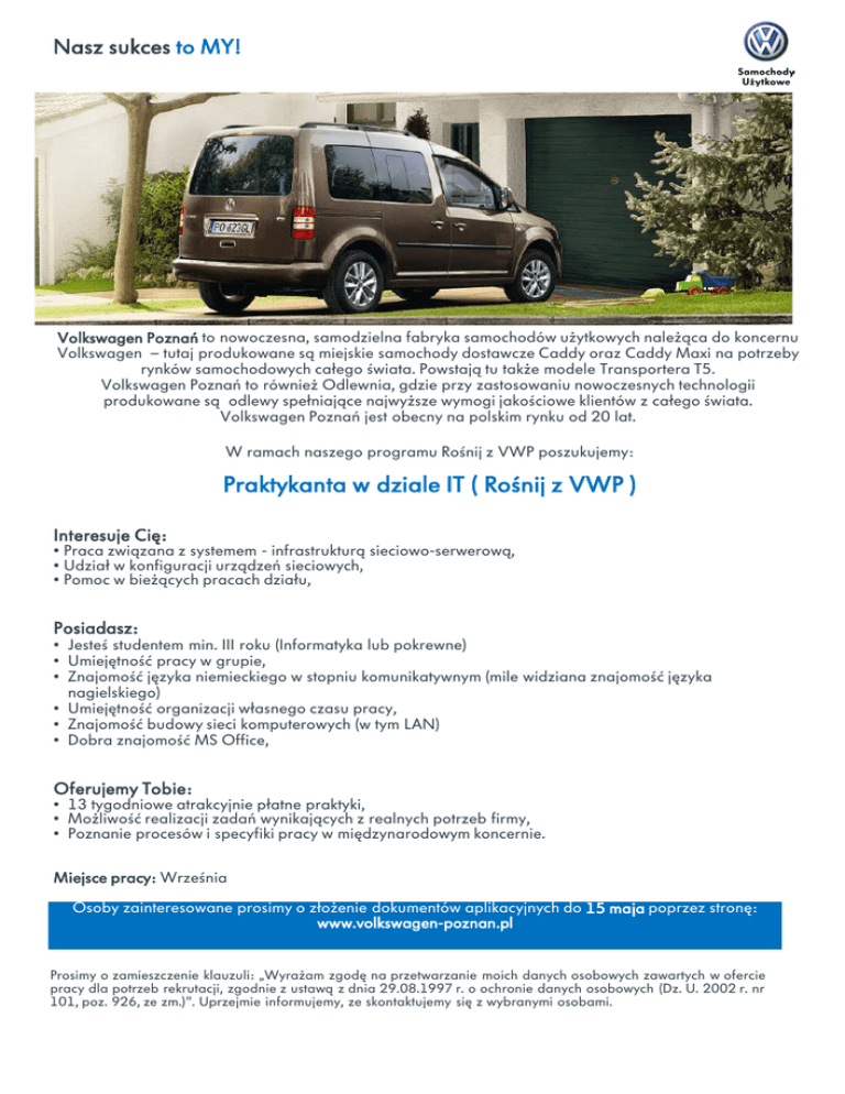 Nasz sukces to MY! Volkswagen Poznań to nowoczesna, samodzielna fabryka samochodów użytkowych należąca do koncernu Volkswagen – tutaj produkowane są miejskie samochody dostawcze Caddy oraz Caddy Maxi na potrzeby rynków samochodowych całego świata. Powstają tu także modele Transportera T5. Volkswagen Poznań to również Odlewnia, gdzie przy zastosowaniu nowoczesnych technologii produkowane są odlewy spełniające najwyższe wymogi jakościowe klientów z całego świata. Volkswagen Poznań jest obecny na polskim rynku od 20 lat. W ramach naszego programu Rośnij z VWP poszukujemy: Praktykanta w dziale IT ( Rośnij z VWP ) Interesuje Cię: • Praca związana z systemem - infrastrukturą sieciowo-serwerową, • Udział w konfiguracji urządzeń sieciowych, • Pomoc w bieżących pracach działu, Posiadasz: • Jesteś studentem min. III roku (Informatyka lub pokrewne) • Umiejętność pracy w grupie, • Znajomość języka niemieckiego w stopniu komunikatywnym (mile widziana znajomość języka nagielskiego) • Umiejętność organizacji własnego czasu pracy, • Znajomość budowy sieci komputerowych (w tym LAN) • Dobra znajomość MS Office, Oferujemy Tobie: • 13 tygodniowe atrakcyjnie płatne praktyki, • Możliwość realizacji zadań wynikających z realnych potrzeb firmy, • Poznanie procesów i specyfiki pracy w międzynarodowym koncernie. Miejsce pracy: Września Osoby zainteresowane prosimy o złożenie dokumentów aplikacyjnych do 15 maja poprzez stronę: Praktyki trwają od 06.07. –02.10.2015 www.volkswagen-poznan.pl Prosimy o zamieszczenie klauzuli: „Wyrażam zgodę na przetwarzanie moich danych osobowych zawartych w ofercie pracy dla potrzeb rekrutacji, zgodnie z ustawą z dnia 29.08.1997 r. o ochronie danych osobowych (Dz. U. 2002 r. nr 101, poz. 926, ze zm.)". Uprzejmie informujemy, ze skontaktujemy się z wybranymi osobami.