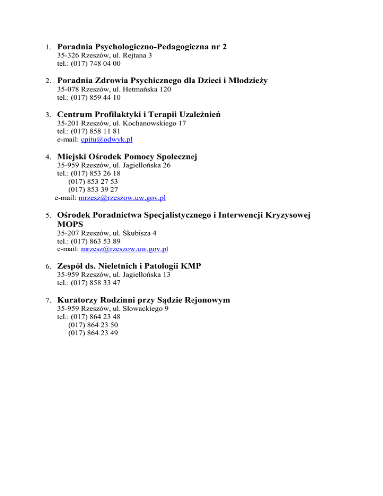 1. Poradnia Psychologiczno-Pedagogiczna nr 2 35-326 Rzeszów, ul. Rejtana 3 tel.: (017) 748 04 00 2. Poradnia Zdrowia Psychicznego dla Dzieci i Młodzieży 35-078 Rzeszów, ul. Hetmańska 120 tel.: (017) 859 44 10 3. Centrum Profilaktyki i Terapii Uzależnień 35-201 Rzeszów, ul. Kochanowskiego 17 tel.: (017) 858 11 81 e-mail: [email protected] 4. Miejski Ośrodek Pomocy Społecznej 35-959 Rzeszów, ul. Jagiellońska 26 tel.: (017) 853 26 18 (017) 853 27 53 (017) 853 39 27 e-mail: [email protected] 5. Ośrodek Poradnictwa Specjalistycznego i Interwencji Kryzysowej MOPS 35-207 Rzeszów, ul. Skubisza 4 tel.: (017) 863 53 89 e-mail: [email protected] 6. Zespół ds. Nieletnich i Patologii KMP 35-959 Rzeszów, ul. Jagiellońska 13 tel.: (017) 858 33 47 7. Kuratorzy Rodzinni przy Sądzie Rejonowym 35-959 Rzeszów, ul. Słowackiego 9 tel.: (017) 864 23 48 (017) 864 23 50 (017) 864 23 49