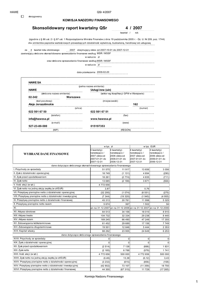 HAWE QSr 4/2007 skorygowany KOMISJA NADZORU FINANSOWEGO Skonsolidowany raport kwartalny QSr 4 / 2007 kwartał / rok (zgodnie z § 86 ust. 2 i § 87 ust. 1 Rozporządzenia Ministra Finansów z dnia 19 października 2005 r. - Dz. U. Nr 209, poz. 1744) dla emitentów papierów wartośc iowyc h prowadząc ych działalność wytwórczą, budowlaną, handlową lub usługową za 4 kwartał roku obrotowego 2007 obejmujący okres od 2007-10-01 do 2007-12-31 zawierając y skróc one skonsolidowane sprawozdanie finansowe według MSR / MSSF w walucie zł oraz skróc one sprawozdanie finansowe według MSR / MSSF w walucie zł data przekazania: 2008-02-20 HAWE SA (pełna nazwa emitenta) HAWE Usługi inne (uin) (skróc ona nazwa emitenta) 02-342 (sektor wg klasyfikac ji GPW w Warszawie) Warszawa (kod poc ztowy) (miejscowość) Aleje Jerozolimskie 162 (ulica) 022 501 67 50 (numer) 022 501 67 51 (telefon) (fax) [email protected] www.hawesa.pl (e-mail) (www) 527-23-80-580 015197353 (NIP) (REGON) w tys. zł WYBRANE DANE FINANSOWE 4 kwartał(y) narastająco / 2007 okres od 2007-01-01 do 2007-12-31 w tys. EUR 4 kwartał(y) narastając o / 2006 okres od 2006-01-01 do 2006-12-31 4 kwartał(y) narastając o / 2007 okres od 2007-01-01 do 2007-12-31 4 kwartał(y) narastająco / 2006 okres od 2006-01-01 do 2006-12-31 dane dotyczące skróc onego skonsolidowanego sprawozdania finansowego I. Przychody ze sprzedaŜy 51 575 11 917 13 656 3 056 II. Zysk z działalnośc i operacyjnej 18 749 (1 131) 4 694 (290) III. Zysk przed opodatkowaniem 18 261 (2 774) 4 835 (711) IV. Zysk netto 13 685 (2 198) 3 671 (564) (32 295) (1 074) (8 551) (275) VIII. Przepływy pienięŜne netto z działalnośc i inwestyc yjnej (7 344) (19 320) (1 945) (4 955) IX. Przepływy pienięŜne netto z działalności finansowej 45 313 20 761 11 998 5 325 5 674 367 1 502 94 V. Ilość akcji (w szt.) 4 772 656 VI. Zysk netto na jedną akcję zwykłą (w zł/EUR) VII. Przepływy pienięŜne netto z działalności operac yjnej X. Przepływy pienięŜne netto razem XI. 2,87 0,76 tan na 31.12.2007tan na 31.12.2006tan na 31.12.2007tan na 31.12.2006 XII. Aktywa obrotowe 64 513 34 156 18 010 XIII. Aktywa trwałe 104 732 32 334 29 238 8 915 8 440 XIV. Aktywa razem 169 245 66 490 47 249 17 355 XV. Zobowiązania krótkoterminowe 61 452 29 689 17 156 7 749 XVI. Zobowiązania długoterminowe 19 501 12 846 5 444 2 353 XVII. Kapitał własny 88 292 23 955 24 649 6 253 0 dane dotycząc e skróc onego sprawozdania finansowego XVIII. Przyc hody ze sprzedaŜy 0 0 0 XIX. Zysk z działalności operac yjnej 0 0 0 0 (2 514) 7 138 (666) 1 831 XX. Zysk przed opodatkowaniem XXI. Zysk netto XXII. Ilość akc ji (w szt.) XXIII. Zysk netto na jedną akc ję zwykłą (w zł/EUR) XXIV. Przepływy pienięŜne netto z działalności operacyjnej XXV. Przepływy pienięŜne netto z działalnośc i inwestyc yjnej XXVI. Przepływy pienięŜne netto z działalności finansowej (2 185) 6 788 (579) 1 741 4 772 656 500 000 4 772 656 500 000 (0,46) 13,38 (0,12) 3,43 (3 232) (615) (856) (158) (42 902) 73 107 (11 359) 18 750 44 300 (67 315) 11 729 (17 265) Komisja Nadzoru Finansowego 1 HAWE QSr 4/2007 XXVII. Przepływy pienięŜne netto razem (1 834) XXVIII. 5 177 (486) 1 328 tan na 31.12.2007tan na 31.12.2006tan na 31.12.2007tan na 31.12.2006 XXIX. Aktywa obrotowe 32 130 7 220 8 970 XXX. Aktywa trwałe 309 788 309 86 485 81 XXXI. Aktywa razem 341 919 7 529 95 454 1 965 30 961 97 8 643 25 327 129 91 34 310 631 7 303 86 720 1 906 XXXII. Zobowiązania krótkoterminowe XXXIII. Zobowiązania długoterminowe XXXIV. Kapitał własny 1 884 Raport powinien zostać przekazany do Komisji Nadzoru Finansowego, Giełdy Papierów Wartośc iowyc h w Warszawie S.A. oraz agencji informacyjnej zgodnie z przepisami prawa ZAWARTOŚĆ RAPORTU Plik Opis 2007QIV_Sprawozdanie_Finansowe.pdf Sprawozdanie Finansowe 2007QIV_informacje_dodatkowe.pdf Informacje Dodatkowe PODPISY OSÓB REPREZENTUJĄCYCH SPÓŁKĘ Data Imię i Nazwisko Stanowisko/Funkc ja 2008-02-20 Marek Rudziński Prezes Zarządu 2008-02-20 Andrzej Laskowski Członek Zarządu 2008-02-20 Aneta Oc hocka Główny Księgowy Podpis Komisja Nadzoru Finansowego 2