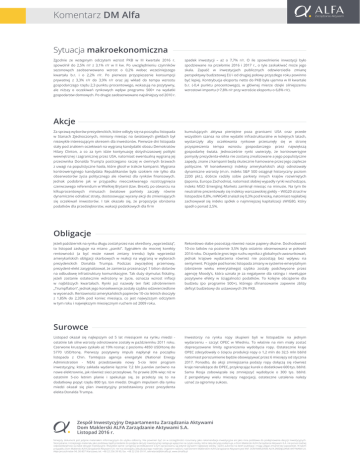 Komentarz DM Alfa Zarządzanie Aktywami Sytuacja makroekonomiczna Zgodnie ze wstępnym odczytem wzrost PKB w III kwartale 2016 r. spowolnił do 2,5% r/r z 3,1% r/r w II kw. Po uwzględnieniu czynników sezonowych zaobserwowano wzrost o 0,2% wobec wcześniejszego kwartału b.r. i o 2,2% r/r. Po pierwsze przyspieszenie konsumpcji prywatnej z 3,3% r/r do 3,9% r/r oraz jej wkład do tempa wzrostu gospodarczego rzędu 2,3 punktu procentowego, wskazują na pozytywny, ale niższy o oczekiwań rynkowych wpływ programu 500+ na wydatki gospodarstw domowych. Po drugie zaobserwowano najsilniejszy od 2010 r. spadek inwestycji – aż o 7,7% r/r. O ile spowolnienie inwestycji było spodziewane na przełomie 2016 i 2017 r., o tyle zaskakiwać może jego skala. Zapaść w inwestycjach publicznych odzwierciedla zmianę perspektywy budżetowej EU i od drugiej połowy przyszłego roku powinno być lepiej. Kontrybucja eksportu netto do PKB była ujemna w III kwartale b.r. (-0,4 punktu procentowego), w głównej mierze dzięki silniejszemu wzrostowi importu (+7,8% r/r przy wzroście eksportu o 6,8% r/r). Akcje Za sprawą wyborów prezydenckich, które odbyły się na początku listopada w Stanach Zjednoczonych, miniony miesiąc na światowych giełdach był niezwykle interesującym okresem dla inwestorów. Pierwsze dni listopada stały pod znakiem oczekiwań na wygraną kandydatki obozu Demokratów Hilary Clinton, a co za tym idzie kontynuację dotychczasowej polityki wewnętrznej i zagranicznej przez USA, natomiast ewentualną wygraną jej przeciwnika Donalda Trump’a postrzegano raczej w ciemnych brawach z uwagi na populistyczne hasła, które głosił w trakcie kampanii. Wygrana kontrowersyjnego kandydata Republikanów była szokiem nie tylko dla obserwatorów życia politycznego ale również dla rynków finansowych. Jednak podobnie jak w przypadku nieoczekiwanego rozstrzygnięcia czerwcowego referendum w Wielkiej Brytanii (tzw. Brexit), po otwarciu na kilkuprocentowych minusach światowe parkiety zaczęły równie dynamicznie odrabiać straty, dostosowując wyceny akcji do zmieniających się oczekiwań inwestorów. I tak okazało się, że propozycje obniżenia podatków dla przedsiębiorstw, wakacji podatkowych dla firm kumulujących aktywa pieniężne poza granicami USA oraz przede wszystkim szansa na silne wydatki infrastrukturalne w kolejnych latach, wystarczyły aby oczekiwania rynkowe przesunęły się w stronę przyspieszenia tempa wzrostu gospodarczego przez największą gospodarkę świata. Jednocześnie rynki uwierzyły, że kontrowersyjne pomysły prezydenta-elekta nie zostaną zrealizowane a jego populistyczne zapędy, znane z kampanii będą skutecznie hamowane przez jego zaplecze polityczne. W konsekwencji indeksy amerykańskich akcji odnotowały dynamiczne wzrosty (m.in. indeks S&P 500 osiągnął historyczny poziom 2200 pkt.), dobrze radziły sobie parkiety innych krajów rozwiniętych (Japonia, Europa Zachodnia), natomiast słabiej wypadły rynki wschodzące, indeks MSCI Emerging Markets zamknął miesiąc na minusie. Na tym tle neutralnie prezentowały się indeksy warszawskiej giełdy – WIG20 stracił w listopadzie 0,8%, mWIG40 znalazł się 0,3% pod kreską, natomiast najsłabiej zachowywał się indeks spółek o najmniejszej kapitalizacji sWIG80, który spadł o ponad 2,5%. Obligacje Jeżeli październik na rynku długu został przez nas określony „wyprzedażą”, to listopad zasługuje na miano „paniki”. Sygnałem do mocnej korekty rentowności (a być może nawet zmiany trendu) była wyprzedaż amerykańskich obligacji skarbowych w reakcji na wygraną w wyborach prezydenckich Donalda Trumpa. Podczas zwycięskiej przemowy, prezydent-elekt zasygnalizował, że zamierza przeznaczyć 1 bilion dolarów na odbudowę infrastruktury komunikacyjne. Tak duży stymulus fiskalny, jeżeli zostanie ostatecznie wdrożony w życie, oznacza wzrost inflacji w najbliższych kwartałach. Rynki już nazwały ten fakt zdrobnieniem „Trumpflation”, jednak jego konsekwencje zostały szybko odzwierciedlone w wycenach. Rentowności amerykańskich papierów 10-cio letnich skoczyły z 1,85% do 2,35% pod koniec miesiąca, co jest najwyższym odczytem w tym roku i największym miesięcznym ruchem od 2009 roku. Rekordowo słabe pozostają również nasze papiery dłużne. Dochodowość 10-cio latków na poziomie 3,5% była ostatnio obserwowana w połowie 2014 roku. Oczywiście gros tego ruchu wynika z globalnych uwarunkowań, jednak krajowe wydarzenia również nie pozostają bez wpływu na sentyment. Przyjęte pod koniec listopada zmiany w systemie emerytalnym (obniżenie wieku emerytalnego) szybko zostały podchwycone przez agencję Moody’s, która uznała je za negatywne dla ratingu i niwelujące pozytywne efekty w ściągalności podatków. To kolejne obciążenie dla budżetu (po programie 500+), którego sfinansowanie zapewne zbliży deficyt budżetowy do ustawowych 3% PKB. Surowce Listopad okazał się najlepszym od 5 lat miesiącem na rynku miedzi ostatnie tak silne wzrosty odnotowane zostały w październiku 2011 roku. Czerwone kruszywo zyskało aż 19% rosnąc z poziomu 4850 USD/tonę do 5770 USD/tonę. Pierwszy pozytywny impuls napłynął na początku listopada z Chin. Tamtejsza agencja energetyki (National Energy Administration - NEA) przedstawiała nowy 5-cio letni program inwestycyjny, który zakłada wydanie łącznie 7,2 bln juanów zarówno na nowe elektrownie, jak również sieci przesyłowe. To prawie 20% więc niż w ostatnim 5-cio letnim planie i spekuluje się, że przełoży się to na dodatkowy popyt rzędu 800 tys. ton miedzi. Drugim impulsem dla rynku miedzi okazał się plan inwestycyjny przedstawiony przez prezydenta elekta Donalda Trumpa. Inwestorzy na rynku ropy skupieni byli w listopadzie na jednym wydarzeniu – szczyt OPEC w Wiedniu. To właśnie na nim miały zostać doprecyzowane limity ograniczenia wydobycia ropy. Ostatecznie kraje OPEC zdecydowały o ści