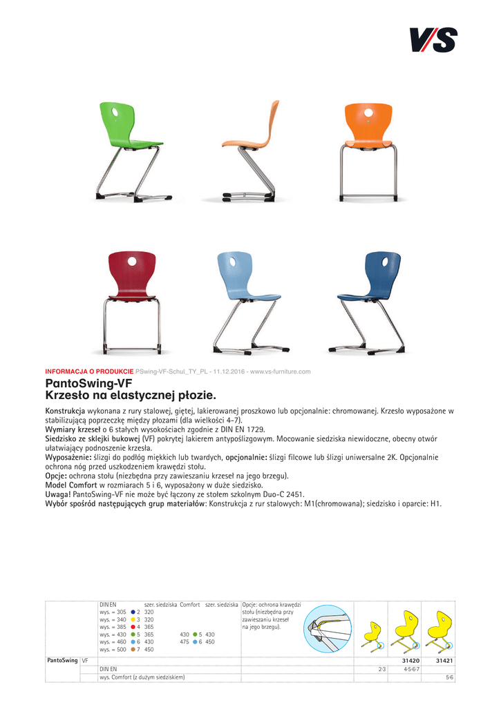 INFORMACJA O PRODUKCIE PSwing-VF-Schul_TY_PL - 11.12.2016 - www.vs-furniture.com PantoSwing-VF Krzesło na elastycznej płozie. Konstrukcja wykonana z rury stalowej, giętej, lakierowanej proszkowo lub opcjonalnie: chromowanej. Krzesło wyposażone w stabilizującą poprzeczkę między płozami (dla wielkości 4-7). Wymiary krzeseł o 6 stałych wysokościach zgodnie z DIN EN 1729. Siedzisko ze sklejki bukowej (VF) pokrytej lakierem antypoślizgowym. Mocowanie siedziska niewidoczne, obecny otwór ułatwiający podnoszenie krzesła. Wyposażenie: ślizgi do podłóg miękkich lub twardych, opcjonalnie: ślizgi filcowe lub ślizgi uniwersalne 2K. Opcjonalnie ochrona nóg przed uszkodzeniem krawędzi stołu. Opcje: ochrona stołu (niezbędna przy zawieszaniu krzeseł na jego brzegu). Model Comfort w rozmiarach 5 i 6, wyposażony w duże siedzisko. Uwaga! PantoSwing-VF nie może być łączony ze stołem szkolnym Duo-C 2451. Wybór spośród następujących grup materiałów: Konstrukcja z rur stalowych: M1(chromowana); siedzisko i oparcie: H1. DIN EN wys. = 305 wys. = 340 wys. = 385 wys. = 430 wys. = 460 wys. = 500 2 3 4 5 6 7 szer. siedziska Comfort szer. siedziska 320 320 365 365 430 5 430 430 475 6 450 450 Opcje: ochrona krawędzi stołu (niezbędna przy zawieszaniu krzeseł na jego brzegu). PantoSwing VF DIN EN wys. Comfort (z dużym siedziskiem) 2·3 31420 4·5·6·7 31421 5·6