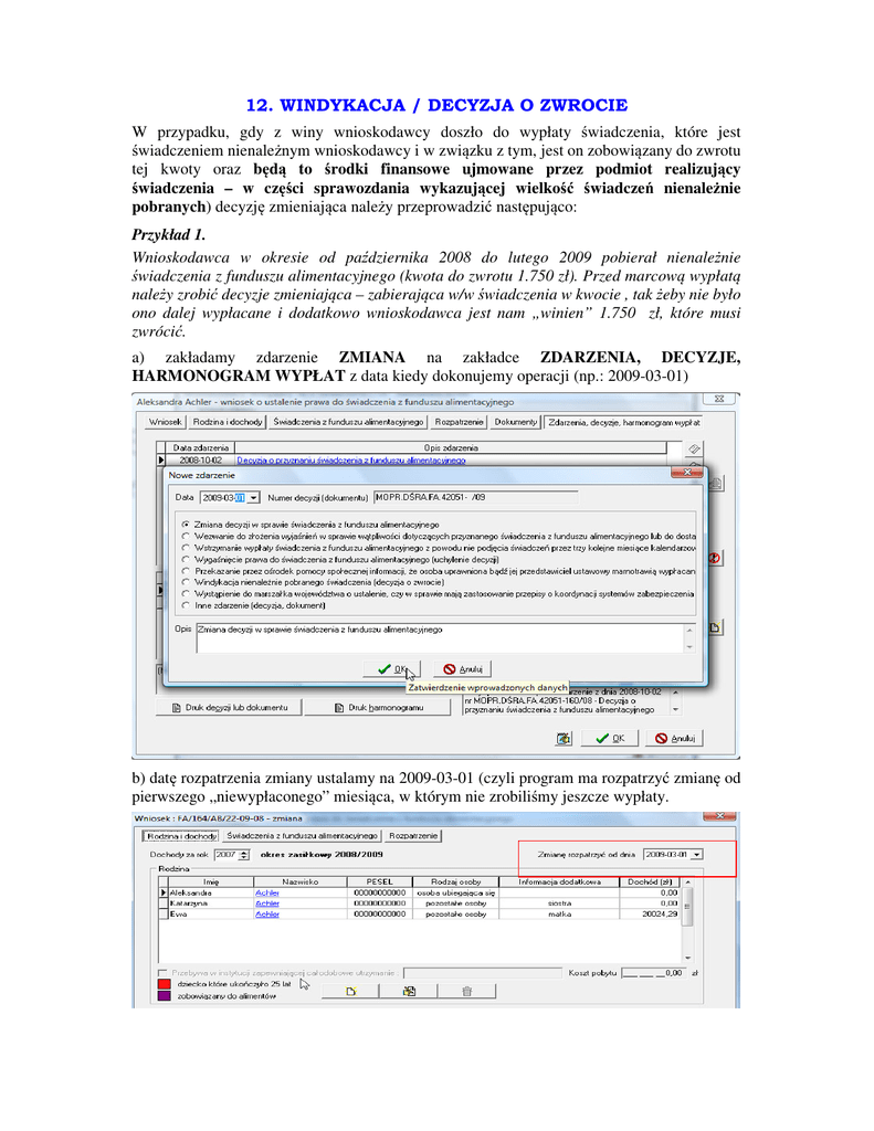 12. WINDYKACJA / DECYZJA O ZWROCIE W przypadku, gdy z winy wnioskodawcy doszło do wypłaty świadczenia, które jest świadczeniem nienależnym wnioskodawcy i w związku z tym, jest on zobowiązany do zwrotu tej kwoty oraz będą to środki finansowe ujmowane przez podmiot realizujący świadczenia – w części sprawozdania wykazującej wielkość świadczeń nienależnie pobranych) decyzję zmieniająca należy przeprowadzić następująco: Przykład 1. Wnioskodawca w okresie od października 2008 do lutego 2009 pobierał nienależnie świadczenia z funduszu alimentacyjnego (kwota do zwrotu 1.750 zł). Przed marcową wypłatą należy zrobić decyzje zmieniająca – zabierająca w/w świadczenia w kwocie , tak żeby nie było ono dalej wypłacane i dodatkowo wnioskodawca jest nam „winien” 1.750 zł, które musi zwrócić. a) zakładamy zdarzenie ZMIANA na zakładce ZDARZENIA, DECYZJE, HARMONOGRAM WYPŁAT z data kiedy dokonujemy operacji (np.: 2009-03-01) b) datę rozpatrzenia zmiany ustalamy na 2009-03-01 (czyli program ma rozpatrzyć zmianę od pierwszego „niewypłaconego” miesiąca, w którym nie zrobiliśmy jeszcze wypłaty. c) Po rozpatrzeniu i zapisaniu zmiany na zakładce ZDARZENIA, DECYZJE, HARMONOGRAM WYPŁA, zakładamy zdarzenie WINDYKACJA ŚWIADCZENIA: W związku z faktem, iż zgodnie z przepisami realizator świadczeń z FA ma możliwość potrącania z bieżących świadczeń kwot nienależnie pobranych wynikających zarówno z ustawy o FA jak i ustawy o zaliczce alimentacyjnej, program zapyta użytkownika: a następnie: UWAGA! Informacje te są bardzo istotne dla późniejszego przygotowania poprawnie sprawozdania z realizacji świadczeń z funduszu alimentacyjnego, dlatego też bardzo istotnym jest poprawne zaznaczanie danych. Po ustaleniu danych dotyczących windykowanej kwoty program zapyta jeszcze użytkownika o wysokość nienależnie pobranego świadczenia oraz, czy daną kwotę świadczenia chcemy windykować jednorazowo, czy też w ratach: po zatwierdzeniu wszystkich na ekranie pojawi się kolejne okno wskazujące wszystkie wypłacone wierzycielowi świadczenia – zgodnie z harmonogramem wypłat: Uwaga! Okno to jest BARDZO ISTOTNE dla poprawnego, późniejszego ustalenia poprawnej wielkości zadłużenia dłużnika alimentacyjnego! W tym miejscu zaznaczamy miesiące, które zostały nienależnie pobrane, korzystając z opcji ZAZNACZ AKTUALNĄ, lub ZAZNACZ WSZYSTKIE: UWAGA! W przypadku, gdy nie cała kwota wypłacona wierzycielowi jest świadczeniem nienależnie pobranym (np.: matka pobiera świadczenia na 2 dzieci i tylko jedno z nich przerwało naukę i tym samym tylko 100 zł z 350 jest nienależnie pobranym świadczeniem) należy, korzystając z opcji PODZIEL POZYCJĘ dokonać podziału kwoty a następnie zaznaczyć jako nienależnie pobraną (na czerwono) tylko odpowiednią kwotę: podczas potwierdzania operacji podziału program ostrzeże użytkownika, iż jest to operacja NIEODWRACALNA i należy dokonywać jej świadomie i w przemyślany sposób: po zatwierdzeniu pozycji na ekranie pojawi się harmonogram, z już podzieloną kwotą, i wtedy będzie można dokonać zaznaczenia tej właściwej kwoty: Tak zaznaczona część kwoty nie będzie powiększała długu dłużnika. Pozycje zaznaczone na czerwono, nie będą brane pod uwagę podczas naliczania długu dłużnika alimentacyjnego - dług dłużnika nie powiększy się w miesiącu, w którym powstało świadczenie nienależnie pobrane (np.: jeżeli zaznaczymy 350 zł za październik 2008 jako świadczenie nienależnie pobrane, dług dłużnika za październik 2008r będzie równy 0 zł). Poprawne zaznaczanie miesięcy nienależnie pobranych ma olbrzymi wpływ na poprawne naliczanie odsetek dłużnikowi oraz na poprawne ustalenie wysokości długu dłużnika. Jeżeli błędnie zaznaczyliśmy daną pozycję harmonogramu, jako nienależnie pobrane, możemy zmienić swoją decyzję podświetlając daną pozycję i klikając ponownie ikonę ZAZNACZ AKTUALNĄ lub ZAZANCZ WSZYSTKIE: Jeżeli nie zaznaczymy pozycji nienależnie pobranych w momencie zakładania decyzji o windykacji świadczenia możemy tego dokonać później korzystając z ikonki prawej strony harmonogramu wypłat: widocznej z Uwaga! Ikona ta widoczna jest TYLKO po podświetleniu zdarzenia Windykacja! Uwaga! Zmiana pozycji na nienależnie pobraną będzie skutkowała zmianą wysokości dłużnika TYLKO I WYŁĄCZNIE przed wydaniem dłużnikowi Decyzji w sprawie zwrotu przez dłużnika alimentacyjnego należności z tytułu otrzymanych przez osobę uprawnioną świadczeń z funduszu alimentacyjnego.