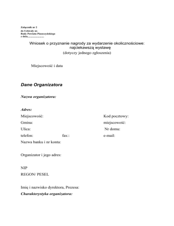 Załącznik nr 2 do Uchwały nr. Rady Powiatu Piaseczyńskiego z dnia......................... Wniosek o przyznanie nagrody za wydarzenie okolicznościowe: najciekawszą wystawę (dotyczy jednego zgłoszenia) Miejscowość i data Dane Organizatora Nazwa organizatora: Adres: Miejscowość: Kod pocztowy: Gmina: miejscowość: Ulica: Nr domu: telefon: fax:: Nazwa banku i nr konta: Organizator i jego adres: NIP REGON/ PESEL Imię i nazwisko dyrektora, Prezesa: Charakterystyka organizatora: e-mail: Wystawa zgłaszana do konkursu: Tytuł: Frekwencja: Data eksponowania wystawy: Źródła finansowania wystawy: środki własne Organizatora ...............% sponsorzy ...............% dotacje ...............% dotacje inne ...............% inne źródła ...............% Współorganizatorzy wystawy: Patronat honorowy: Pomysłodawca wystawy (koncepcja): Komisarz wystawy: Autor scenariusza: Oprawa plastyczna: Konsultacja naukowa: Opracowanie komputerowe:: Realizacja wystawy: Załączona dokumentacja wystawy: □ – scenariusz □ – katalog □ – folder □ – informator □ – plakat □ – zaproszenie □ – informacja o wystawie na własnej stronie internetowej Organizatora □ – billboard (lub inna reklama zewnętrzna-zdjęcie), □ – publikacje naukowe □ – fotografie (minimum 10 szt.) □ – pocztówki lub inne gadżety towarzyszące wystawie □ – materiały graficzne □ – dokumentacja video □ – CD □ – recenzje prasowe □ – inne □ – towarzyszące programy edukacyjno – oświatowe □ – towarzyszące koncerty □ – towarzyszące wykłady Opis wystawy – uzasadnienie zgłoszenia do nagrody (maksymalnie 3 strony) : ………………………………………. Pieczątka i podpis organizatora