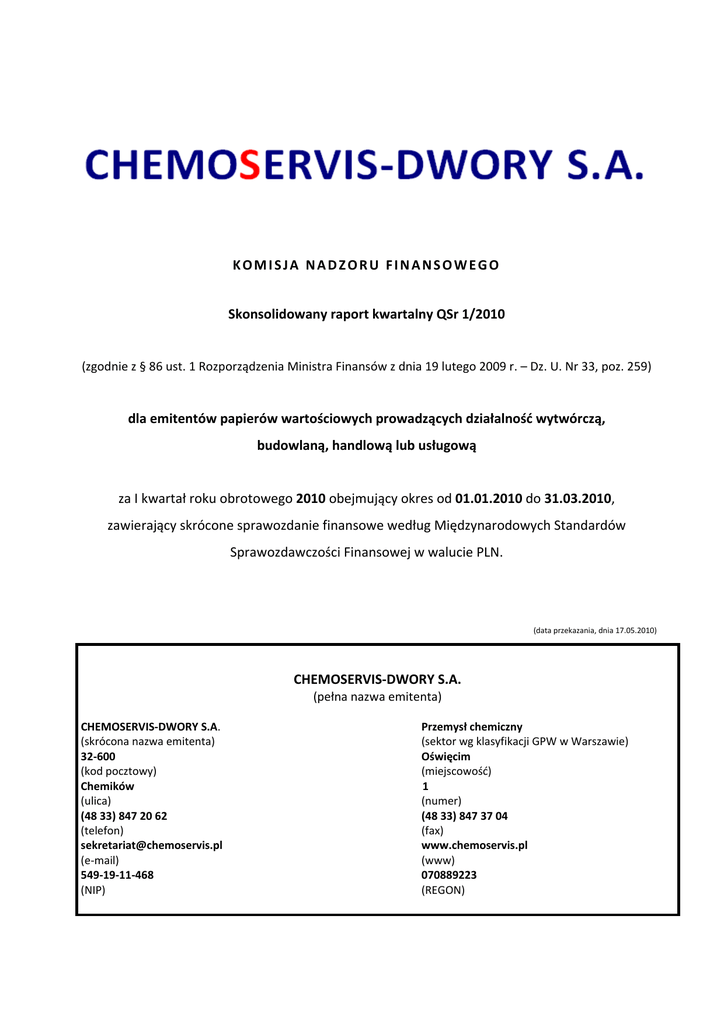 GRUPA CHEMOSERVIS-DWORY Skonsolidowany Raport Kwartalny za I kwartał 2010 roku zakończony 31 marca 2010 roku KOMISJA NADZORU FINANSOWEGO Skonsolidowany raport kwartalny QSr 1/2010 (zgodnie z § 86 ust. 1 Rozporządzenia Ministra Finansów z dnia 19 lutego 2009 r. – Dz. U. Nr 33, poz. 259) dla emitentów papierów wartościowych prowadzących działalność wytwórczą, budowlaną, handlową lub usługową za I kwartał roku obrotowego 2010 obejmujący okres od 01.01.2010 do 31.03.2010, zawierający skrócone sprawozdanie finansowe według Międzynarodowych Standardów Sprawozdawczości Finansowej w walucie PLN. (data przekazania, dnia 17.05.2010) CHEMOSERVIS-DWORY S.A. (pełna nazwa emitenta) CHEMOSERVIS-DWORY S.A. (skrócona nazwa emitenta) 32-600 (kod pocztowy) Chemików (ulica) (48 33) 847 20 62 (telefon) [email protected] (e-mail) 549-19-11-468 (NIP) Przemysł chemiczny (sektor wg klasyfikacji GPW w Warszawie) Oświęcim (miejscowość) 1 (numer) (48 33) 847 37 04 (fax) www.chemoservis.pl (www) 070889223 (REGON) GRUPA CHEMOSERVIS-DWORY Skonsolidowany Raport Kwartalny za I kwartał 2010 roku zakończony 31 marca 2010 roku SPIS TREŚCI CZĘŚĆ I DANE FINANSOWE .................................................................................................................. 4 1. 2. 3. Wybrane dane finansowe ......................................................................................................4 1.1 Dane dotyczące skróconego skonsolidowanego sprawozdania finansowego .......................................................................................4 1.2 Dane dotyczące skróconego sprawozdania finansowego Jednostki Dominującej – Spółki CHEMOSERVIS-DWORY S.A. ....................................5 Skrócone śródroczne skonsolidowane sprawozdanie finansowe .........................................6 2.1 Skonsolidowane sprawozdanie z sytuacji finansowej (bilans) ..................................6 2.2 Skonsolidowany rachunek zysków i strat ..................................................................7 2.3 Skonsolidowane sprawozdanie z całkowitych dochodów .........................................8 2.4 Skonsolidowane sprawozdanie ze zmian w kapitale własnym..................................9 2.5 Skonsolidowane sprawozdanie z przepływów pieniężnych ......................................10 Skrócone śródroczne jednostkowe sprawozdanie finansowe...............................................12 3.1 Jednostkowe sprawozdanie z sytuacji finansowej (bilans)........................................12 3.2 Jednostkowy rachunek zysków i strat .......................................................................13 3.3 Jednostkowe sprawozdanie z całkowitych dochodów ..............................................14 3.4 Jednostkowe sprawozdanie ze zmian w kapitale własnym .......................................15 3.5 Jednostkowe sprawozdanie z przepływów pieniężnych ...........................................16 CZĘŚĆ II INFORMACJE DODATKOWE DO SKRÓCONEGO SKONSOLIDOWANEGO RAPORTY KWARTALNEGO ..................................... 17 1. 2. 3. 4. Dane Jednostki Dominującej..................................................................................................17 Historia Jednostki Dominującej .............................................................................................17 Kapitał Zakładowy Jednostki Dominującej.............................................................................18 Zestawienie stanu posiadania akcji Jednostki Dominującej przez osoby zarządzające ......................................................................................................18 5. Struktura własności akcji Jednostki Dominującej ..................................................................19 6. Podstawowy przedmiot działalności Grupy CHEMOSERVIS-DWORY ....................................19 7. Skład organów Jednostki Dominującej ..................................................................................21 8. Opis organizacji Grupy CHEMOSERVIS-DWORY ....................................................................21 9. Oświadczenie o zgodności .....................................................................................................23 10. Zasady rachunkowości przyjęte przy sporządzaniu raportu ..................................................23 10.1 Zasady przyjęte do przeliczenia danych finansowych ............................................23 10.2 Najważniejsze zasady rachunkowości stosowane Spółkę ......................................25 10.3 Aktywa finansowe i rzeczowe .................................................................................50 10.4 Wybrane dodatkowe noty objaśniające do skonsolidowanego sprawozdania finansowego ................................................51 • Przychody ze sprzedaży .................................................................................51 • Koszty wg rodzaju ..........................................................................................53 2 GRUPA CHEMOSERVIS-DWORY Skonsolidowany Raport Kwartalny za I kwartał 2010 roku zakończony 31 marca 2010 roku Pozostałe przychody operacyjne ...................................................................53 Pozostałe koszty operacyjne ..........................................................................54 Przychody finansowe .....................................................................................54 Koszty finansowe ...........................................................................................55 Kredyty, pożyczki oraz zobowiązania z tytułu leasingu finansowego............56 Podatek dochodowy ......................................................................................57 Wpływy pieniężne z działalności operacyjnej ................................................58 Segmenty działalności Grupy CHEMOSERVIS-DWORY .........