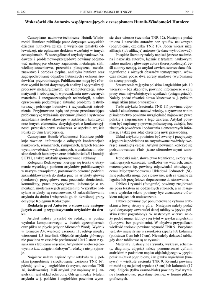Wskazówki dla Autorów współpracujących z czasopismem Hutnik