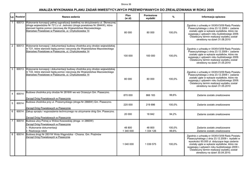 Strona 36 ANALIZA WYKONANIA PLANU ZADAŃ INWESTYCYJNYCH PRZEWIDYWANYCH DO ZREALIZOWANIA W ROKU 2009 Lp. Rozdział 1 2 Nazwa zadania 60013 Wykonanie koncepcji pełnej sygnalizacji świetlnej na skrzyżowaniu ul. Słonecznej (droga wojewódzka Nr 721) z ul. Jedności (droga powiatowa Nr 2844W), która stanowić będzie pomoc rzeczową dla Województwa Mazowieckiego. Starostwo Powiatowe w Piasecznie, ul. Chyliczkowska 14 Plan (w zł) 80 000 4 60014 Budowa chodnika przy drodze Nr 2816W we wsi Orzeszyn Gm. Piaseczno. 100 000 100,0% Zgodnie z uchwałą nr XXXIV/3/09 Rady Powiatu Piaseczyńskiego z dnia 23.12.2009 r. zadanie zostało ujęte w wykazie wydatków, które nie wygasają z upływem roku budżetowego 2009. Ostateczny termin realizacji wydatku został określony na dzień 31.08.2010 100,0% Zgodnie z uchwałą nr XXXIV/3/09 Rady Powiatu Piaseczyńskiego z dnia 23.12.2009 r. zadanie zostało ujęte w wykazie wydatków, które nie wygasają z upływem roku budżetowego 2009. Ostateczny termin realizacji wydatku został określony na dzień 31.05.2010 80 000 80 000 100,0% Zgodnie z uchwałą nr XXXIV/3/09 Rady Powiatu Piaseczyńskiego z dnia 23.12.2009 r. zadanie zostało ujęte w wykazie wydatków, które nie wygasają z upływem roku budżetowego 2009. Ostateczny termin realizacji wydatku został określony na dzień 31.05.2010 870 000 866 183 99,6% Zadanie zostało zrealizowane 220 000 219 896 100,0% Zadanie zostało zrealizowane 20 000 18 842 94,2% Zadanie zostało zrealizowane 48 800 1 340 000 48 800 1 334 126 100,0% 99,6% Zadanie zostało zrealizowane Zadanie zostało zrealizowane 100,0% Zgodnie z uchwałą nr XXXIV/3/09 Rady Powiatu Piaseczyńskiego z dnia 23.12.2009 r. wydatki w wysokości 93.000 zł. dotyczące tego zadania zostały ujęte w wykazie wydatków, które nie wygasają z upływem roku budżetowego 2009 r. Ostateczny termin realizacji wydatku został określony na dzień 30.04.2010. Zarząd Dróg Powiatowych w Piasecznie Budowa chodnika przy ul. Przesmyckiego (droga Nr 2866W) Gm. Piaseczno. 60014 6 Zarząd Dróg Powiatowych w Piasecznie 60014 Zakup sprzętu i wyposażenia technicznego na utrzymanie dróg Gm. Piaseczno. 8 Informacja opisowa 60013 Wykonanie koncepcji i dokumentacji budowy chodnika przy drodze wojewódzkiej nr 722, które stanowić będą pomoc rzeczową dla Województwa Mazowieckiego Starostwo Powiatowe w Piasecznie, ul. Chyliczkowska 14 5 7 80 000 % 60013 Wykonanie koncepcji i dokumentacji budowy chodnika przy drodze wojewódzkiej nr 721, które stanowić będą pomoc rzeczową dla Województwa Mazowieckiego Starostwo Powiatowe w Piasecznie, ul. Chyliczkowska 14 100 000 3 Poniesione wydatki Zarząd Dróg Powiatowych w Piasecznie 60014 Budowa ulicy Polnej w Wólce Kosowskiej (droga nr 2860W) Zarząd Dróg Powiatowych w Piasecznie 1. Wykonanie dokumentacji 2. Realizacja robót 60014 Budowa drogi Nr 2831W Wola Wągrodzka - Chosna. Gm. Prażmów Zarząd Dróg Powiatowych w Piasecznie 1 040 000 1 039 575 Strona 37 9 10 11 12 13 14 15 16 75020 Przebudowa budynku przy ul. Czajewicza 20 w Piasecznie dla potrzeb Biura Geodety Powiatowego i PODGiK Zadanie będzie dodatkowo finansowane ze środków PFGZGiK. 2009r -917 000 zł. Starostwo Powiatowe w Piasecznie, ul. Chyliczkowska 14 75020 Wprowadzenie systemu e-urząd i systemu zabezpieczeń Starostwo Powiatowe w Piasecznie, ul. Chyliczkowska 14 75020 Rozbudowa budynku Starostwa Powiatowego w Piasecznie Starostwo Powiatowe w Piasecznie, ul. Chyliczkowska 14 75020 Zakup sprzętu informatycznego wraz z oprogramowaniem dla potrzeb Terenowego Punktu Paszportowego Starostwo Powiatowe w Piasecznie, ul. Chyliczkowska 14 75020 Wykonanie oświetlenia nowo wybudowanego parkingu i terenu przyległego do budynku Starostwa Powiatowego w Piasecznie przy ul. Chyliczkowskiej 14 (w tym wyk. dokumentacji) Starostwo Powiatowe w Piasecznie, ul. Chyliczkowska 14 75020 Zakup sprzętu komputerowego i oprogramowania Starostwo Powiatowe w Piasecznie, ul. Chyliczkowska 14 75020 Wykonanie ogrodzenia przy posesji budynku Starostwa Powiatowego w Piasecznie Starostwo Powiatowe w Piasecznie, ul. Chyliczkowska 14 75020 Przebudowa budynku wraz z termomodernizacją, wymianą stolarki okiennej i drzwiowej, ul. Kościuszki 9 w Piasecznie Starostwo Powiatowe w Piasecznie, ul. Chyliczkowska 14 17 75411 Zakup i montaż masztu antenowego dla Komendy Powiatowej Państwowej Straży Pożarnej w Piasecznie, ul. Staszica 19 Komenda Powiatowa Państwowej Straży Pożarnej w Piasecznie, ul. Staszica 19 18 75411 Zakup lekkiego specjalnego samochodu dowodzenia i łączności oraz wsparcia ekologicznego dla Komendy Powiatowej Państwowej Straży Pożarnej w Piasecznie, ul. Staszica 19 Komenda Powiatowa Państwowej Straży Pożarnej w Piasecznie, ul. Staszica 19 19 300 000 297 692 99,2% Zadanie zostało zrealizowane 40 000 24 400 61,0% Zadanie zostało zrealizowane 228 810 0 0,0% Ze względu na stwierdzone usterki zadanie nie zostało zakończone. Zakończenie zadania nastąpi w 2010 r. 40 000 36 061 90,2% Zadanie zostało zrealizowane 65 000 64 400 99,1% Zadanie zostało zrealizowane 92 940 27 148 29,2% Zadanie zostało częściowo zrealizowane. W wyniku przeprowadzonego przetargu na wyposażenie serwerowni osiągnięto istotnie niższą cenę niż przewidywano. 40 000 33 437 83,6% Zadanie zostało zrealizowane Wykonano ekspertyzę techniczną oraz dokumentację kosztorysową na modernizację budynku. Zadanie zostało ujęte w planie na 2010 r. 40 000 17 000 42,5% 20 000 0 0,0% Zadanie nie zostało zrealizowane ze względu na nie uzyskanie zgody właściciela obiektu na umieszczenie masztu 130 433 130 433 100,0% Zadanie zostało zrealizowane 98,4% Zgodnie z uchwałą nr XXXIV/3/09 Rady Powiatu Piaseczyńskiego z dnia 23.12.2009 r. wydatki w wysokości 1.803.364 zł. dotyczące tego zadania zostały ujęte w wykazie wydatków, które nie wygasają z upływem roku budżetowego 2009 r. Ostateczny termin realizacji wydatku został określony na dzień 31.03.2010. 75421 
