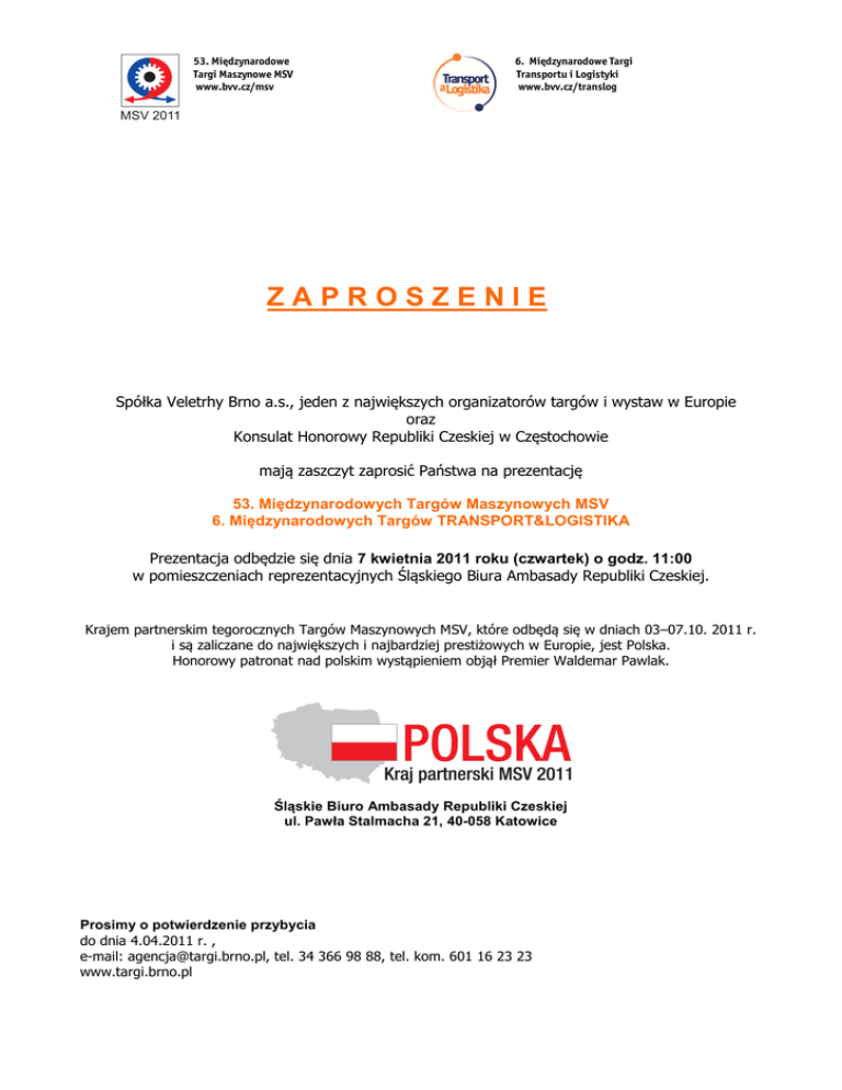 53. Międzynarodowe Targi Maszynowe MSV www.bvv.cz/msv 6. Międzynarodowe Targi Transportu i Logistyki www.bvv.cz/translog ZAPROSZENIE Spółka Veletrhy Brno a.s., jeden z największych organizatorów targów i wystaw w Europie oraz Konsulat Honorowy Republiki Czeskiej w Częstochowie mają zaszczyt zaprosić Państwa na prezentację 53. Międzynarodowych Targów Maszynowych MSV 6. Międzynarodowych Targów TRANSPORT&LOGISTIKA Prezentacja odbędzie się dnia 7 kwietnia 2011 roku (czwartek) o godz. 11:00 w pomieszczeniach reprezentacyjnych Śląskiego Biura Ambasady Republiki Czeskiej. Krajem partnerskim tegorocznych Targów Maszynowych MSV, które odbędą się w dniach 03–07.10. 2011 r. i są zaliczane do największych i najbardziej prestiżowych w Europie, jest Polska. Honorowy patronat nad polskim wystąpieniem objął Premier Waldemar Pawlak. Śląskie Biuro Ambasady Republiki Czeskiej ul. Pawła Stalmacha 21, 40-058 Katowice Prosimy o potwierdzenie przybycia do dnia 4.04.2011 r. , e-mail: [email protected], tel. 34 366 98 88, tel. kom. 601 16 23 23 www.targi.brno.pl