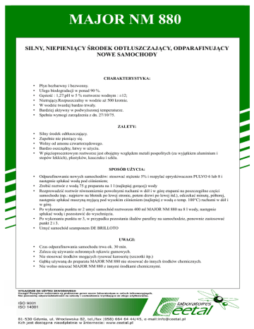 MAJOR NM 880 SILNY, NIEPIENIĄCY ŚRODEK ODTŁUSZCZAJĄCY, ODPARAFINUJĄCY NOWE SAMOCHODY CHARAKTERYSTYKA: • • • • • • • Płyn bezbarwny i bezwonny. Ulega biodegradacji w ponad 90 %. Gęstość : 1,27;pH w 5 % roztworze wodnym : ±12; Nietrujący.Rozpuszczalny w wodzie aż 500 krotnie. W wodzie twardej bardzo trwały. Bardziej aktywny w podwyższonej temperaturze. Spełnia wymogi zarządzenia z dn. 27/10/75. ZALETY: • • • • • Silny środek odtłuszczający. Zupełnie nie pieniący się. Wolny od amonu czwartorzędowego. Bardzo oszczędny, łatwy w użyciu. W pięcioprocentowym roztworze jest obojętny względem metali pospolitych (za wyjątkiem aluminium i stopów lekkich), plastyków, kauczuku i szkła. SPOSÓB UŻYCIA: • • • • • • Odparafinowanie nowych samochodów: stosować stężenie 5% i rozpylać opryskiwaczem PULVO 6 lub 8 i następnie spłukać wodą pod ciśnieniem; Zrobić roztwór z wodą 75 g preparatu na 1 l (najlepiej gorącej) wody Rozprowadzić roztwór równomiernie powolnymi ruchami w dół i w górę etapami na poszczególne części samochodu (np.: najpierw na błotnik po lewej stronie, potem drzwi po lewej itd.), odczekać minutę, półtorej, następnie spłukać maszyną myjącą pod wysokim ciśnieniem (najlepiej z wodą o temp. 100°C) ruchami w dół i w górę. Po wykonaniu punktu nr 2 umyć samochód roztworem 400 ml MAJOR NM 880 na 8 l wody, następnie spłukać wodą i pozostawić do wyschnięcia. Po wykonaniu punktu nr 3, w przypadku pozostania śladów parafiny na samochodzie, ponownie zastosować punkt 2 i 3. Umyć samochód szamponem DE BRILLOTO UWAGI: • • • • • Czas odparafinowania samochodu trwa ok. 30 min. Zaleca się używanie ochronnych rękawic gumowych. Nie stosować środków mogących rysować karoserię (szczotki itp.) Gąbkę używaną do preparatu MAJOR NM 880 nie stosować do innych środków chemicznych. Nie wolno mieszać MAJOR NM 880 z innymi środkami chemicznymi. ZASTOSOWANIE: • • • Rozkonserwowywanie nowych pojazdów Czyszczenie części mechanicznych, korpusów, podpór rurociągów, miseczek sprężyn, sprzętu transportowego, kadzi, cystern, zbiorników. Czyszczenie posadzek w przemyśle. BEZPIECZEŃSTWO: • • Tak jak każdy środek alkaliczny nie jest zalecany dla aluminium i stopów lekkich. Przy dłuższym używaniu zaleca się noszenie rękawic i okularów ochronnych.