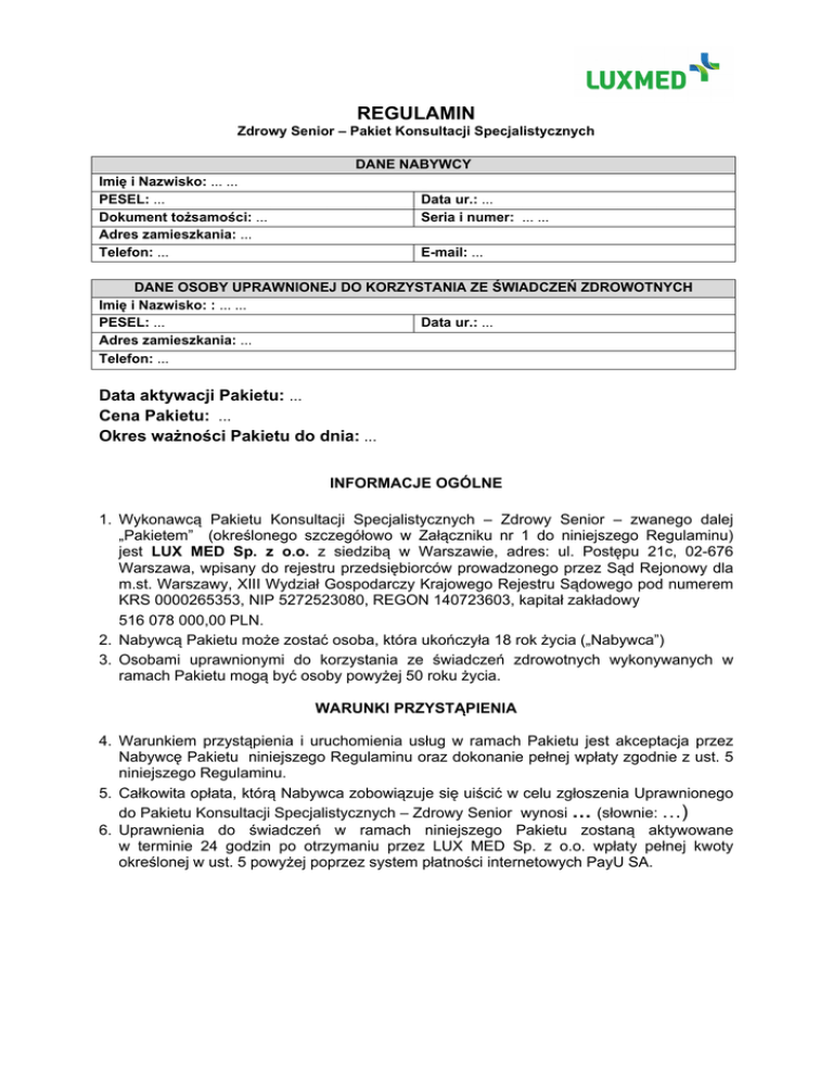 REGULAMIN Zdrowy Senior – Pakiet Konsultacji Specjalistycznych DANE NABYWCY Imię i Nazwisko: ... ... PESEL: ... Dokument tożsamości: ... Adres zamieszkania: ... Telefon: ... Data ur.: ... Seria i numer: ... ... E-mail: ... DANE OSOBY UPRAWNIONEJ DO KORZYSTANIA ZE ŚWIADCZEŃ ZDROWOTNYCH Imię i Nazwisko: : ... ... PESEL: ... Data ur.: ... Adres zamieszkania: ... Telefon: ... Data aktywacji Pakietu: ... Cena Pakietu: ... Okres ważności Pakietu do dnia: ... INFORMACJE OGÓLNE 1. Wykonawcą Pakietu Konsultacji Specjalistycznych – Zdrowy Senior – zwanego dalej „Pakietem” (określonego szczegółowo w Załączniku nr 1 do niniejszego Regulaminu) jest LUX MED Sp. z o.o. z siedzibą w Warszawie, adres: ul. Postępu 21c, 02-676 Warszawa, wpisany do rejestru przedsiębiorców prowadzonego przez Sąd Rejonowy dla m.st. Warszawy, XIII Wydział Gospodarczy Krajowego Rejestru Sądowego pod numerem KRS 0000265353, NIP 5272523080, REGON 140723603, kapitał zakładowy 516 078 000,00 PLN. 2. Nabywcą Pakietu może zostać osoba, która ukończyła 18 rok życia („Nabywca”) 3. Osobami uprawnionymi do korzystania ze świadczeń zdrowotnych wykonywanych w ramach Pakietu mogą być osoby powyżej 50 roku życia. WARUNKI PRZYSTĄPIENIA 4. Warunkiem przystąpienia i uruchomienia usług w ramach Pakietu jest akceptacja przez Nabywcę Pakietu niniejszego Regulaminu oraz dokonanie pełnej wpłaty zgodnie z ust. 5 niniejszego Regulaminu. 5. Całkowita opłata, którą Nabywca zobowiązuje się uiścić w celu zgłoszenia Uprawnionego do Pakietu Konsultacji Specjalistycznych – Zdrowy Senior wynosi … (słownie: …) 6. Uprawnienia do świadczeń w ramach niniejszego Pakietu zostaną aktywowane w terminie 24 godzin po otrzymaniu przez LUX MED Sp. z o.o. wpłaty pełnej kwoty określonej w ust. 5 powyżej poprzez system płatności internetowych PayU SA. ODSTĄPIENIE I REZYGNACJA Z PAKIETU 7. W ciągu 10 dni od dnia zaakceptowania niniejszego Regulaminu, Nabywca może odstąpić od Umowy o udzielanie świadczeń zdrowotnych na podstawie niniejszego Regulaminu bez podania przyczyny, składając LUX MED sp. z o.o. oświadczenie na piśmie i przesyłając je na adres: [email protected]. 8. Prawo odstąpienia od umowy zawartej na odległość nie przysługuje Nabywcy, który rozpoczął wykonywanie usług w ramach „Pakietu” przed upływem 10 dni od dnia zawarcia umowy. WARUNKI REALIZACJI PAKIETU 9. Udzielanie świadczeń zdrowotnych w ramach Pakietu odbywa się w placówkach własnych podmiotu leczniczego LUX MED sp. z o.o.. działających pod nazwą LUX MED i Medycyna Rodzinna wymienionych na stronie WWW.luxmed.pl. Możliwość realizacji usługi objętej „Pakietem”, jest uwarunkowana jej dostępnością w danej placówce. 10. Usługi w ramach Przeglądu można zrealizować w ciągu 6 miesięcy od dnia aktywowania uprawnień do Przeglądu. ODPOWIEDZIALNOŚĆ 11. LUX MED na zasadach ogólnych ponosi odpowiedzialność za szkody poniesione przez Osobę Uprawnioną, o ile szkody te pozostają w bezpośrednim związku z wykonywaniem Przeglądu. Jednakże LUX MED nie ponosi odpowiedzialności za poniesione przez Osobę Uprawnioną szkody pozostające w bezpośrednim związku z wykonywaniem Przeglądu, jeżeli do nich dojdzie: 1) na skutek działania siły wyższej, tj. zaistnienia zdarzenia o charakterze przypadkowym, także naturalnym, niemożliwym do przewidzenia i uniknięcia lub 2) na skutek niezastosowania się Osoby Uprawnionej do zaleceń personelu medycznego LUX MED lub 3) w razie nieotrzymania od Osoby Uprawnionej informacji potrzebnych do wykonania świadczenia zdrowotnego, zatajenia takich informacji, a także w przypadku, gdy podane przez Osobę Uprawnioną informacje okażą się nieprawdziwe; 4) w przypadkach, gdy nie można przypisać winy LUX MED i/lub nie można przypisać winy osobie, której LUX MED powierzył wykonanie czynności w swoim imieniu lub 5) z innych przyczyn niezależnych od LUX MED. KONTAKT I REKLAMACJE 12. Reklamacje przyjmowane są wyłącznie w formie pisemnej. 13. Reklamacje dotyczące obsługi rozpatrywane są w ciągu 5 dni roboczych, reklamacje dotyczące kwestii medycznych rozpatrywane są w ciągu 14 dni roboczych od daty wpływu wszystkich danych niezbędnych do rozpatrzenia reklamacji na adres: LUX MED Sp. z o.o. Departament Obsługi Klienta Dział Zarządzania Reklamacjami ul. Postępu 21c 02-676 Warszawa lub na adres poczty elektronicznej: [email protected] POSTANOWIENIA KOŃCOWE 14. Nie ma możliwości dokonania cesji uprawnień przysługujących w ramach Pakietu na inną osobę. 15. Zakup Pakietu oraz korzystanie ze świadczeń zdrowotnych w ramach Pakietu nie łączy się z żadnymi innymi promocjami ani rabatami na jakiekolwiek usługi 16. Integralną część Regulaminu stanowi Załącznik nr 1 . Załącznik nr 1 – Wykaz usług wchodzących w zakres Pakietu Konsultacji Specjalistycznych Zdrowy Senior: Panel badań laboratoryjnych – z limitem 1 wykonania na każde z poniższych badań: Morfologia + płytki + rozmaz OB./ESR Glukoza na czczo Mocz – badanie ogólne Dostęp do konsultacji lekarzy, przyjmujących w zakresie niżej wymienionych specjalizacji spośród niżej wymienionych - z limitem łącznym 4 konsultacji ( niezależnie od specjalizacji) do wykorzystania w ciągu 6 m-cy: chirurg naczyniowy, dermatolog, kardiolog, laryngolog. okulista, reumatolog, urolog, Dodatkowo Pakiet Konsultacji Specjalistycznych Zdrowy Senior obejmuje następujące konsultacyjne zabiegi i badania ambulatoryjne wykonywane w trakcie właściwych dla danej specjalizacji konsultacji (o ile zostaną wybrane ) w ramach posiadanego limitu. Zabiegi ambulatoryjne ogólnolekarskie: mierzenie RR/ciśnienia pomiar wzrostu i wagi ciała Zabiegi ambulatoryjne dermatologiczne: Dermatoskopia standardowa Zabiegi ambulatoryjne laryngologiczne: Badanie trąbek słuchowych przedmuchiwanie Kateteryzacja trąbki słuchowej Płukanie ucha Usunięcie ciała obcego z nosa/ ucha Pro