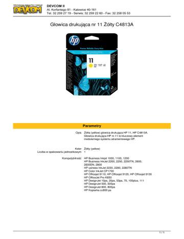 DEVCOM II Al. Korfantego 81 - Katowice 40-161 Tel. 32 259 27 19 - Serwis: 32 259 22 60 - Fax: 32 258 05 53 Głowica drukująca nr 11 Żółty C4813A Parametry Opis Żółta (yellow) głowica drukująca HP 11, HP C4813A. Głowica drukująca HP nr.11 to kluczowy element modularnego systemu atramentowego HP. Kolor Żółty (yellow) Liczba w opakowaniu jednostkowym 1 Kompatybilność HP Business Inkjet 1000, 1100, 1200 HP Business InkJet 2200, 2250, 2250TN, 2600, 2600DN, 2800 HP usiness InkJet 2230, 2280, 2280TN HP Color InkJet CP1700 HP Officejet 9110, HP Officejet 9120, HP Officejet 9130 HP OfficeJet Pro K850 HP DesignJet 10ps, 20ps, 50ps, 70, 100plus, 111 HP DesignJet 500, 500ps HP DesignJet 800, 800ps HP Kopiarka cc800 ps 1/1 Powered by TCPDF (www.tcpdf.org)