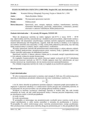 39OF_III_D KOOF Szczecin: www.of.szc.pl XXXIX OLIMPIADA FIZYCZNA (1989/1990). Stopień III, zad. doświadczalne – D. Źródło: Komitet Główny Olimpiady Fizycznej, Fizyka w Szkole Nr 1, 1991 Autor : Marta Kicińska-Habior Nazwa zadania: Wyznaczanie sprawności żarówki Działy: Elektryczność Słowa kluczowe: Sprawność, moc, energia, napięcie, zasilacz, transformator, żarówka, termometr laboratoryjny, przewody, amperomierz, woltomierz, promieniowanie w zakresie widzialnym, bliska podczerwień Zadanie doświadczalne – D, zawody III stopnia, XXXIX OF. Masz do dyspozycji żarówkę na niskie napięcie (do 24 V) o mocy 20 W ÷ 50 W (np. odpowiednią żarówkę samochodową) z dodatkowymi przewodami, odpowiedni zasilacz, transformator lub akumulator umożliwiający zasilanie żarówki napięciem nominalnym, termometr laboratoryjny lub fotograficzny, zegarek, słoik lub zlewkę (o średnicy 2 cm większej niż średnica żarówki) oraz menzurkę z wodą, czarną farbę plakatową (akwarelę, tusz lub inną farbę rozpuszczalną w wodzie), statyw, amperomierz, woltomierz. Wyznacz sprawność żarówki dla promieniowania emitowanego w całym zakresie widzialnym i bliskiej podczerwieni, przepuszczanym przez warstwę wody o grubości rzędu 1 cm. Omów zjawiska wpływające na dokładność pomiaru. Sprawność żarówki w danym zakresie widma jest to stosunek energii wypromieniowanej w tym zakresie widma do energii dostarczanej. Ze względów bezpieczeństwa nie należy stosować napięć wyższych niż 24 V (absolutnie nie można stosować żarówek na 220 V!). Źródło napięcia musi być odizolowane od sieci (można stosować np. transformator, ale nie można stosować autotransformatora). Nie wkładać rozgrzanej żarówki do wody ze względu na jej możliwość pęknięcia! Rozwiązanie Część doświadczalna W celu wyznaczenia sprawności η musimy znać energię Ee (lub moc Me) emitowaną przez żarówkę w określonym przedziale widmowym oraz moc wydzielaną w żarówce Mw: M η= e Mw o ile Mw łatwo określić na podstawie pomiaru napięcia i natężenia prądu (przyrządami dostępnymi w pracowni szkolnej) a w ostateczności można przyjąć moc nominalną żarówki, to wyznaczenie Me nie jest trywialne i na tym polega główna trudności zadania. Wielkość tę możemy wyznaczyć zanurzając żarówkę w wodzie (tak, aby całe światło wchodziło do wody, ale aby cokół pozostawał suchy) i mierząc przyrost temperatury wody po określonym czasie w dwóch przypadkach: a) wody czystej b) wody zaczernionej. W przypadku a) interesujące nas promieniowanie wychodzi przez warstwę wody na zewnątrz (pochłanianie w szkle można zaniedbać w stosunku do pochłaniania w wodzie). W przypadku b) całość emitowanego przez żarówkę promieniowania zostaje pochłonięta. Moc przekazywana wodzie przez żarówkę drogą nie promienistą jest w obu przypadkach taka PDFiA US, 2008 - 1/3 - www.dydaktyka.fizyka.szc.pl 390F_III_D KO OF Szczecin: www.of.szc.pl sama. Oznaczając przez t czas świecenia żarówki, a przez ΔTa oraz ΔTb przyrost temperatury wody – odpowiednio czystej (a) i zabarwionej (b) , ponadto przez m - masę wody i c - ciepło właściwe wody, mamy: E − E a mc (ΔTb − ΔTa ). Mc = b = t t Eb i Ea oznaczają tu wartości energii, jaka dostarczona została wodzie odpowiednio w przypadku b) i a) . Ostatecznie wyznaczamy sprawność jako: M mc (ΔTb − ΔTa ). η= c = (1) Mw Mw Doświadczenie wykonano stosując żarówkę od reflektora samochodowego – włókna świateł drogowych (12 V, 45 W). Do środkowej - niewykorzystanej końcówki przymocowano pręt z plexiglasu, który został zamocowany w statywie, do pozostałych końcówek były przylutowane przewody. Do zasilania żarówki użyto zasilacza stabilizowanego wyposażonego w miernik napięcia; natężenie prądu żarówki było zmierzone amperomierzem (klasy 0,5). Woda (wodociągowa) w ilości 250 cm3 była nalana do słoiczka po dżemie o pojemności ok. 0,3 dm3. W obu wersjach doświadczenia (a) i (b) (woda czysta i zaczerniona) początkowa temperatura wody T1 była zbliżona - nieco niższa od temperatury pokojowej Tp = 22,3ºC; podczas pomiaru termometrem laboratoryjnym (o podziałce 0,1 K) mieszano wodę. Układ doświadczalny przedstawia rys.1. Szczególną uwagę zwracano na powtarzalność Rys. 1 Ustawienia żarówki względem wody w wersji a) i b). Cała bańka żarówki była praktycznie zanurzona. Cokół znajdował się tuż nad powierzchnią wody. W wersji a) i b) żarówka była włączona na taki sam czas t = 300 s (włączenie następowało po umieszczeniu żarówki w wodzie). Po wyłączeniu żarówki była ona wyjmowana ze słoika, po czym następował pomiar temperatury wody (T2) po starannym mieszaniu, gdyż początkowy rozkład temperatury był silnie niejednorodny. Uzyskane wyniki: Użar = 12 V, Iżar = 3,75 A. mc = 1040 J/K, t = 300 s, Mw = 45 W Tb1 = 20,6°C Tb2 = 28,9°C ΔTb = 8,3 K Ta1 = 20,1°C Ta2 = 27,1°C ΔTa = 7,0 K. PDFiA US, 2008 - 2/3 - www.dydaktyka.fizyka.szc.pl 390F_III_D KO OF Szczecin: www.of.szc.pl Sprawność obliczona na podstawie wyprowadzonego wzoru (1) wynosi η=10%. Interesujące, że czarna woda pochłonęła ok. 64% energii wydzielonej w żarówce, pozostałe 36% energii zostało przekazane głównie powietrzu przez cokół żarówki. Uwaga: W obliczeniach zaniedbano pojemność cieplną słoiczka jako małą w porównaniu z pojemnością cieplną wody. Również zaniedbano wymianę ciepła między wodą a otoczeniem podczas świecenia żarówki i pomiaru temperatury, co jest uzasadnione niewielką różnicą temperatur między wodą a otoczeniem (woda o temp. 27°C stygła w tempie 0,06 K/min - znacznie niższym od szybkości grzania przez żarówkę). Dokładna analiza błędów byłaby bardzo trudna i dlatego ją w zadaniu pominięto. Dyskusja Woda przepuszcza światło widzialne praktycznie w 100%. W podczerwieni przepuszczalność wody maleje: 1cm w