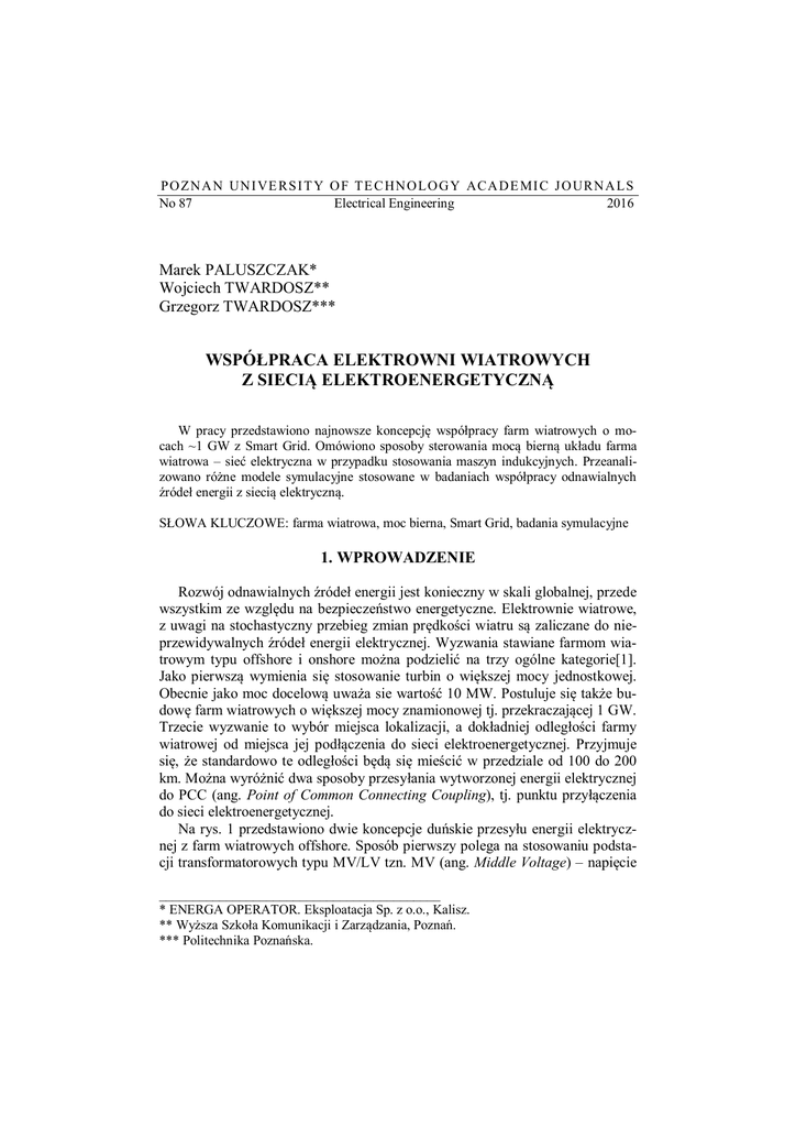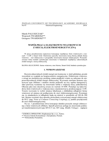 P O Z N A N UN I VE RS I T Y O F T E C HN O L O G Y ACA D E MI C J O URN A L S No 87 Electrical Engineering 2016 Marek PALUSZCZAK* Wojciech TWARDOSZ** Grzegorz TWARDOSZ*** WSPÓŁPRACA ELEKTROWNI WIATROWYCH Z SIECIĄ ELEKTROENERGETYCZNĄ W pracy przedstawiono najnowsze koncepcję współpracy farm wiatrowych o mocach ~1 GW z Smart Grid. Omówiono sposoby sterowania mocą bierną układu farma wiatrowa – sieć elektryczna w przypadku stosowania maszyn indukcyjnych. Przeanalizowano różne modele symulacyjne stosowane w badaniach współpracy odnawialnych źródeł energii z siecią elektryczną. SŁOWA KLUCZOWE: farma wiatrowa, moc bierna, Smart Grid, badania symulacyjne 1. WPROWADZENIE Rozwój odnawialnych źródeł energii jest konieczny w skali globalnej, przede wszystkim ze względu na bezpieczeństwo energetyczne. Elektrownie wiatrowe, z uwagi na stochastyczny przebieg zmian prędkości wiatru są zaliczane do nieprzewidywalnych źródeł energii elektrycznej. Wyzwania stawiane farmom wiatrowym typu offshore i onshore można podzielić na trzy ogólne kategorie[1]. Jako pierwszą wymienia się stosowanie turbin o większej mocy jednostkowej. Obecnie jako moc docelową uważa sie wartość 10 MW. Postuluje się także budowę farm wiatrowych o większej mocy znamionowej tj. przekraczającej 1 GW. Trzecie wyzwanie to wybór miejsca lokalizacji, a dokładniej odległości farmy wiatrowej od miejsca jej podłączenia do sieci elektroenergetycznej. Przyjmuje się, że standardowo te odległości będą się mieścić w przedziale od 100 do 200 km. Można wyróżnić dwa sposoby przesyłania wytworzonej energii elektrycznej do PCC (ang. Point of Common Connecting Coupling), tj. punktu przyłączenia do sieci elektroenergetycznej. Na rys. 1 przedstawiono dwie koncepcje duńskie przesyłu energii elektrycznej z farm wiatrowych offshore. Sposób pierwszy polega na stosowaniu podstacji transformatorowych typu MV/LV tzn. MV (ang. Middle Voltage) – napięcie __________________________________________ * ENERGA OPERATOR. Eksploatacja Sp. z o.o., Kalisz. ** Wyższa Szkoła Komunikacji i Zarządzania, Poznań. *** Politechnika Poznańska. 132 Marek Paluszczak, Wojciech Twardosz, Grzegorz Twardosz średnie, LV oznacza niskie napięcie (ang. Low Voltage), HV – oznacza wysokie napięcie (ang. High Volateg), skrót E–HV oznacza najwyższe napięcie (ang. Extra High Voltage). Wysokie zmienne napięcie jest przy pomocy falownika zamieniane na napięcie stałe i przesyłane kablem HVDC (ang. High Voltage Direct Current). Następnie napięcie stałe zamieniane jest na zmienne o wartości E-HV i przyłączany jest obwód w punkcie PCC. Sposób drugi polega na stosowaniu kabli HVAC (ang. High Voltage Alternating Current). Energia elektryczna jest na cały odcinku farma wiatrowa - PCC przesyłana napięciem zmiennym. Rys. 1 Przesył energii elektrycznej na drodze farma wiatrowa - PCC [1] W USA energia elektryczna z farm wiatrowych offshore przesyła sie na ląd wyłącznie kablami prdu stałego HVDC. System onshore w Europie, jak i w USA, jest realizowany w ten sam sposób. Na farmie wiatrowej napięcie niskie jest przekształcane na średnie, następnie kablem MV jest przesyłane do podstacji MV/HV, a następnie linią HV. Poziomy napięć są różne. Napięcie średnie w Europie to typowo 33 kV, w USA 34,5 kV. Wysokie napięcie w Europie ma wartość 220 kV, w USA jest to wartość 230 kV. Ważnym elementem współpracy odnawialnych źródeł energii (OZE) z siecią elektroenergetyczną SG (ang. Smart Grid) jest problem magazynów energii elektrycznej. Na rys. 2 pokazano obowiązujący obecnie model SG [2]. Współpraca elektrowni wiatrowych z siecią elektroenergetyczną 133 Rys. 2. Schemat inteligentnej sie elektrycznej [2] Ważnym i nierozwiązanym problemem jest proces sterowania mocą czynną i bierną układu odnawialne źródło energii - system elektroenergetyczny. 2. STEROWANIE MOCĄ BIERNĄ Generatory asynchroniczne są powszechnie stosowane w elektrowniach wiatrowych o mocy PN < 800 kW. W jednostkach o mocach 800 < PN < 1500 kW generatory asynchroniczne stosowane są w około 95%. W turbinach o mocach większych od 1,5 MW, generatory asynchroniczne stosuje się tylko w około 17% urządzeń. W pozostałych 83% stosuje się generatory synchroniczne wolnoobrotowe [3]. Układ regulacji generatora asynchronicznego ze sterowaną rezystancją w obwodzie wirnika wpływa na moment i moc generowaną wprowadzaną przez elektrownię wiatrową do systemu poprzez zmianę poślizgu wirnika. Różnica między mocą uzyskiwaną z wiatru a mocą wprowadzaną do systemu jest proporcjonalna do poślizgu wirnika. Zatem zmieniając poślizg, można wpłynąć na różnicę tych mocy i tym samym na charakter zmian mocy wprowadzanej do systemu elektroenergetycznego. W maszynach asynchronicznych z wirnikiem klatkowym zmiany poślizgu są niewielkie (zwykle poniżej 23%), a zatem zmiany mocy mechanicznej (wynik zmian prędkości wiatru) przenoszą się na stronę stojana niemal bezpośrednio. W maszynach asynchronicznych pierścieniowych dzięki dodaniu do obwodu wirnika rezystorów możliwe jest modyfikowanie charakterystyki mechanicznej maszyny. Zmieniając rezystancję, można zmieniać poślizg wirnika i jednocześnie, przy danym momencie, moc wprowadzaną do sieci. Jest to głównym celem stosowania takiego rozwiązania. Rozwią- 134 Marek Paluszczak, Wojciech Twardosz, Grzegorz Twardosz zanie to jednak powoduje zwiększenie strat mocy o straty na tej dodatkowej rezystancji. Aby wyeliminować to zjawisko stosuje się przekształtnik energoelektroniczny umożliwiający przepływ energii w kierunku od wirnika maszyny do sieci. System taki nazywa się kaskadą nadsynchroniczną, ponieważ przekształtnik umożliwia przepływ mocy tylko w jednym kierunku (od wirnika do sieci), a zatem generator może działać wyłącznie przy prędkościach przekraczających prędkość synchroniczną. Nie pozwala on również 