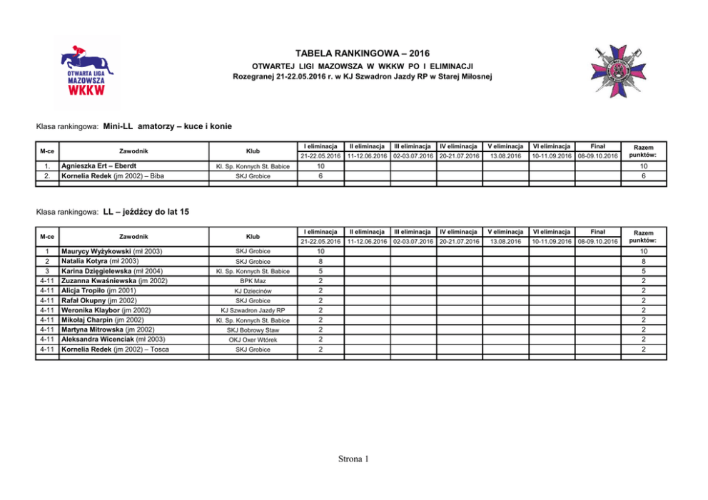 TABELA RANKINGOWA – 2016 OTWARTEJ LIGI MAZOWSZA W WKKW PO I ELIMINACJI Rozegranej 21-22.05.2016 r. w KJ Szwadron Jazdy RP w Starej Miłosnej Klasa rankingowa: Mini-LL amatorzy – kuce i konie M-ce 1. 2. Zawodnik Agnieszka Ert – Eberdt Kornelia Redek (jm 2002) – Biba Klub Kl. Sp. Konnych St. Babice SKJ Grobice I eliminacja II eliminacja III eliminacja IV eliminacja V eliminacja VI eliminacja Finał 21-22.05.2016 11-12.06.2016 02-03.07.2016 20-21.07.2016 13.08.2016 10-11.09.2016 08-09.10.2016 10 6 Razem punktów: 10 6 Klasa rankingowa: LL – jeźdźcy do lat 15 M-ce 1 2 3 4-11 4-11 4-11 4-11 4-11 4-11 4-11 4-11 Zawodnik Maurycy Wyżykowski (mł 2003) Natalia Kotyra (mł 2003) Karina Dzięgielewska (mł 2004) Zuzanna Kwaśniewska (jm 2002) Alicja Tropiło (jm 2001) Rafał Okupny (jm 2002) Weronika Klaybor (jm 2002) Mikołaj Charpin (jm 2002) Martyna Mitrowska (jm 2002) Aleksandra Wicenciak (mł 2003) Kornelia Redek (jm 2002) – Tosca Klub SKJ Grobice SKJ Grobice Kl. Sp. Konnych St. Babice BPK Maz KJ Dziecinów SKJ Grobice KJ Szwadron Jazdy RP Kl. Sp. Konnych St. Babice SKJ Bobrowy Staw OKJ Oxer Wtórek SKJ Grobice I eliminacja II eliminacja III eliminacja IV eliminacja V eliminacja VI eliminacja Finał 21-22.05.2016 11-12.06.2016 02-03.07.2016 20-21.07.2016 13.08.2016 10-11.09.2016 08-09.10.2016 10 8 5 2 2 2 2 2 2 2 2 Razem punktów: 10 8 5 2 2 2 2 2 2 2 2 Strona 1 Klasa rankingowa: LL – jeźdźcy lat 16 i starsi M-ce 1 2 3 4 5 6 7 8 9-21 9-21 9-21 9-21 9-21 9-21 9-21 9-21 9-21 9-21 9-21 9-21 9-21 Zawodnik Natalie Wojtak Marek Wajda (Charlie Regent) Marcel Ważyński Dariusz Sulowski (Brave Heart S) Anna Zielińska (j 2000) Aleksander Kadłubowski (mj 1995) Marta Dziak – Gierlicz (Aszanti) Katarzyna Bekiesz (Wicherek) Bogusław Kondek Magdalena Litaszewska Dariusz Sopiński Aleksandra Bartkiewicz Anna Kuligowsa Magdalena Niesłuchowska Joanna Mazurek (mj 1995) Marta Polkowska Natalia Wieczorek (j 2000) Anna Kibler - Matysiak Marta Jaroszewska (Rositas) Alicja Mizak Anna Królikowska (Sunny Boy) Klub SKJ Grobice KJ Dworek Okuniew WKJ Gabon Walewice WKJ Lublin Polski Polo Klub Warszawa KJ Strzała Krubiczew KJ Janów Podlaski WKJ Lublin KJ Aromer BPK Maz KJ Dziecinów UKS Akademia J. BPK Maz KJ Aldragho KU AZS UW Warszawa BPK Maz UKS Military BPK Maz UKS Military Kl. Sp. Konnych St. Babice SKJ Beckersport I eliminacja II eliminacja III eliminacja IV eliminacja V eliminacja VI eliminacja Finał 21-22.05.2016 11-12.06.2016 02-03.07.2016 20-21.07.2016 13.08.2016 10-11.09.2016 08-09.10.2016 16 14 12 9 7 6 4 3 2 2 2 2 2 2 2 2 2 2 2 2 2 Razem punktów: 16 14 12 9 7 6 4 3 2 2 2 2 2 2 2 2 2 2 2 2 2 Klasa rankingowa: L – jeźdźcy do lat 18 M-ce 1 2 3-5 3-5 3-5 Zawodnik Michalina Prowotorow (jm 2001) Anna Przysada (jm 2001) Helena Grabowska (j 2000) Dominika Siek (j 1998) Julia Witkowska (mł 2005) Klub UKS Akademia J. OKJ Oxer Wtórek SKJ Legia Kozielska WKJ Lublin SKJ Beckersport I eliminacja II eliminacja III eliminacja IV eliminacja V eliminacja VI eliminacja Finał 21-22.05.2016 11-12.06.2016 02-03.07.2016 20-21.07.2016 13.08.2016 10-11.09.2016 08-09.10.2016 10 8 4 4 4 Razem punktów: 10 8 4 4 4 Strona 2 Klasa rankingowa: L – jeźdźcy lat 19 i starsi M-ce 1 2 3 4 5 6 7 8 9 10-14 10-14 10-14 10-14 10-14 Zawodnik Katarzyna Kokowska – Chico Z Marta Dziak – Gierlicz (Ligol) Georg Koch (Merlin 1442) Weronika Krzyśpiak (j 1997) Justyna Kopko (Iwan) Aleksander Kadłubowski (mj 1995 – Sentido) Dariusz Sulowski (Ksena) Andrzej Gadaś (Harry Poter) Konstancja Szymacha (mj 1995) Włodzimierz Gieryszewski (Havana Alex.) Ewelina Rutkowska Sylwester Piotrowski Ewa Pogodzińska Albertas Smitas Klub SKJ Sopot KJ Janów Podlaski Niemcy KJ Dziecinów Pom. Liga Jeźdz. Dziemiany KJ Strzała Krubiczew WKJ Lublin SKJ Bobrowy Staw KJ Szwadron Jazdy RP Kl. Sp. Konnych St. Babice BPK Maz UKS Military UKS Akademia J. Litwa I eliminacja II eliminacja III eliminacja IV eliminacja V eliminacja VI eliminacja Finał 21-22.05.2016 11-12.06.2016 02-03.07.2016 20-21.07.2016 13.08.2016 10-11.09.2016 08-09.10.2016 22 20 18 16 14 12 9 6 5 4 4 4 4 4 Razem punktów: 22 20 18 16 14 12 9 6 5 4 4 4 4 4 Klasa rankingowa: P – jeźdźcy od lat 12 M-ce 1 2 3 4 5 6 7 7 8 9 Zawodnik Piotr Piasecki – Desert General Zyndrunas Noreika Sylwia Zarzycka-Cybulska Michał Bekiesz – Hawana Włodzimierz Gieryszewski (Dina) Tomasz Olszewski (Bakalia J) Anna Królikowska (Wiagra) Kamila Kozon (j 1999) Marek Wajda (Mequini) Sandra Miszta Klub KJ Aromer Litwa JKS Sokóle WKJ Lublin Kl. Sp. Konnych St. Babice Kl. Sp. Konnych St. Babice SKJ Beckersport Kl. Sp. Konnych St. Babice KJ Dworek Okuniew SKJ Grobice I eliminacja II eliminacja III eliminacja IV eliminacja V eliminacja VI eliminacja Finał 21-22.05.2016 11-12.06.2016 02-03.07.2016 20-21.07.2016 13.08.2016 10-11.09.2016 08-09.10.2016 28 25 22 20 18 16 14 12 10 7 Razem punktów: 28 25 22 20 18 16 14 12 10 7 Strona 3 Klasa rankingowa: OPEN – jeźdźcy od lat 12 – od LL do C* M-ce 1 2 3 4-5 4-5 6 7 8 9 10-11 10-11 12-13 12-13 15-17 15-17 15-17 18-20 18-20 18-20 21-23 21-23 21-23 24-25 24-25 26-27 26-27 Zawodnik Georg Koch (Lux 147) Zofia Pogodzińska Katarzyna Kokowska – Rosalie Hanna Pogodzińska Piotr Piasecki – Desert General Dangis Rakauskas Zyndrunas Noreika Michał Bekiesz (Romina) Sylwia Zarzycka-Cybulska Albertas Smitas (Wakat) Marta Dziak – Gierlicz (Ligol) Wiesław Bako Włodzimierz Gieryszewski (Dina) Tomasz Olszewski (Bakalia J) Weronika Krzyśpiak (j 1997) Natalie Wojtak Anna Królikowska (Wiagra) Justyna Kopko (Iwan) Marek Wajda (Charlie Regent) Aleksander Kadłubowski (mj 1995 – Sentido) Marcel Ważyński Kamila Kozon (j 1999) Michalina Prowotorow (jm 2001) Maurycy Wyżykowski (mł 2003) Anna Przysada (jm 2001) Natalia Kotyra (mł 2003) Klub Niemcy UKS Akademia J. SKJ Sopot UKS Akademia J. KJ Aromer Litwa Litwa WKJ Lublin JKS Sokóle Litwa KJ Janów Podlaski UKS Military Kl. Sp. Konnych St. Babice Kl. Sp. Konnych St. Babice KJ Dziecinów SKJ Grobic