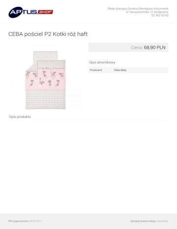 Sklep dziecięcy Smykuś Remigiusz Kaczmarek ul. Nowotoruńska 12, Bydgoszcz 52 362 02 63 CEBA pościel P2 Kotki róż haft Cena: 68,90 PLN Opis słownikowy Producent Ceba Baby Opis produktu Plik wygenerowano: 08-03-2017 Powered by TCPDF (www.tcpdf.org) Oprogramowanie sklepu: AptusShop