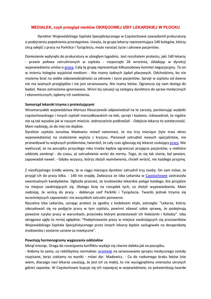 MEDIALEK, czyli przegląd mediów OKRĘGOWEJ IZBY LEKARSKIEJ W PŁOCKU Dyrektor Wojewódzkiego Szpitala Specjalistycznego w Częstochowie zawiadomił prokuraturę o podejrzeniu popełnienia przestępstwa. Uważa, że grupa lekarzy reprezentująca 140 kolegów, którzy chcą odejść z pracy na Parkitce i Tysiącleciu, może narażać życie i zdrowie pacjentów. Doniesienie wpłynęło do prokuratury w ubiegłym tygodniu. Jest rezultatem protestu, jaki 140 lekarzy - prawie połowa zatrudnionych w szpitalu - rozpoczęło 26 września, składając w dyrekcji wypowiedzenia umów o pracę. Całą tę grupę reprezentuje kilkuosobowy komitet negocjacyjny. To on w imieniu kolegów wyjaśniał mediom: - Nie mamy żadnych żądań płacowych. Odchodzimy, bo nie możemy brać na siebie odpowiedzialności za zdrowie i życie pacjentów. Sprzęt w szpitalu od dawna nie ma ważnych przeglądów i nie jest serwisowany. Nie mamy leków. Ogranicza się nam dostęp do badań. Nasze ostrzeżenia ignorowano. Winni tej sytuacji są zastępcy dyrektora do spraw medycznych i ekonomicznych; żądamy ich zwolnienia. Samorząd lekarski trzyma z protestującymi Wicemarszałek województwa Mariusz Kleszczewski odpowiedział na te zarzuty, porównując wydatki częstochowskiego i innych szpitali marszałkowskich na leki, sprzęt i badania. Udowadniał, że nigdzie nie są tak wysokie jak w naszym mieście. Jednocześnie podkreślał: - Odejście lekarzy to ostateczność. Mam nadzieję, że do niej nie dojdzie. Dyrektor szpitala Jarosław Madowicz mówił natomiast, że ma trzy miesiące (tyle trwa okres wypowiedzenia) na znalezienie wyjścia z kryzysu. Planował zatrudnić nowych specjalistów, nie przewidywał tu większych problemów, twierdził, że cały czas zgłaszają się lekarze szukający pracy. Nie wykluczał, że na początku przyszłego roku trzeba będzie ograniczyć przyjęcia pacjentów, a niektóre oddziały zamknąć - do czasu, aż zatrudnienie wróci do normy. Tego, że się tak stanie, był pewien, zapowiadał nawet: - Gdyby wszyscy, którzy złożyli wymówienia, chcieli wrócić, nie każdego przyjmę. Z nieoficjalnego źródła wiemy, że w ciągu miesiąca dyrektor zatrudnił trzy osoby. On sam mówi, że przyjął ich do pracy kilka. - 140 nie znajdę. Zwłaszcza że Izba Lekarska w Częstochowie zastraszyła ewentualnych kandydatów. Ogłosiła przecież, że środowisko lekarskie potępi każdego, kto przyjdzie na miejsce zwalniających się. Dlatego liczę na rozsądek tych, co złożyli wypowiedzenia. Mam nadzieję, że wrócą do pracy - deklaruje szef Parkitki i Tysiąclecia. Twardo jednak trzyma się wcześniejszych zapowiedzi: nie wszystkich zatrudni ponownie. Naczelna Izba Lekarska, uznając protest za zgodny z kodeksem etyki, ostrzegła: "Lekarze, którzy zdecydowali się na podjęcie pracy w tym szpitalu, powinni zdawać sobie sprawę, że podejmują poważne ryzyko pracy w warunkach, przeciwko którym protestowali ich Koleżanki i Koledzy". Izba okręgowa ujęła to mniej oględnie: "Podejmowanie pracy w miejsce zwalniających się pracowników Wojewódzkiego Szpitala Specjalistycznego przez innych lekarzy będzie zasługiwało na dezaprobatę środowiska i zostanie uznane za nieetyczne". Powstają harmonogramy wygaszania oddziałów Minął miesiąc. Droga do rozwiązania konfliktu wydaje się równie daleka jak na początku. - Robimy to samo, co robilibyśmy normalnie: przetargi na serwisowanie sprzętu medycznego zostały rozpisane, teraz czekamy na wyniki - mówi dyr. Madowicz. - Co do rzekomego braku leków (nie wiem, dlaczego nasi lekarze uważają, że jest ich za mało), to nie wyciągnęliśmy znienacka ukrytych gdzieś zapasów. W Częstochowie kupuje się ich najwięcej w województwie, co potwierdzają twarde dane ze wszystkich szpitali marszałkowskich. Sprawę omówiłem z komitetem terapeutycznym, który ustala, jakie leki ma kupić szpital. Ustaliliśmy, że komitet będzie się spotykał częściej, lekarze przekazali mu swoje uwagi (w pewnym sensie uderzają tu w samych siebie, bo komitet terapeutyczny składa się właśnie z lekarzy). Zakładam więc, że te najważniejsze postulaty zostały spełnione. Co do moich zastępców, to konkurs na wicedyrektora do spraw medycznych został rozpisany - tak jak miał być (Urząd Marszałkowski właśnie powołał komisję konkursową). Na stanowisku pozostaje mój zastępca do spraw ekonomicznych. Po pierwsze, nie mam podstaw, by uważać, że źle wypełnia swoje obowiązki, a po drugie, nie może być tak, że grupa pracowników dyktuje, kto ma być zatrudniony na danym stanowisku, a kto nie i - gdy się jej nie spodoba - wymuszać jego zwolnienie. Z drugiej strony dyr. Madowicz zobowiązał ordynatorów, by przygotowali harmonogram wygaszania tych oddziałów, z których odchodzi większość lekarzy (to prawie cała Parkitka - poza ginekologią i położnictwem, kardiologią, neurologią, udarami i rehabilitacją neurologiczną; z Tysiąclecia chce odejść personel OIOM-u, laryngologii, rentgena oraz część ludzi z interny). Dyrektor tłumaczy, że to przyjęta w takich wypadkach procedura, trzeba przecież uprzedzić Wydział Zarządzania Kryzysowego. Z przedstawionych mu dokumentów wynika, że np. na intensywnej terapii już w połowie grudnia trzeba będzie całkowicie wstrzymać przyjęcia nowych pacjentów, bo nie wiadomo, czy po 1 stycznia będzie się miał nimi kto zająć. - W sytuacji awaryjnej spróbuję uratować część oddziałów, powierzając ich prowadzenie zewnętrznym podmiotom - zdradza dyrektor. - Będą to firmy prywatne, być może nawet spółki założone przez lekarzy zatrudnionych w naszym szpitalu. Zainteresowanych dzierżawą tego typu nie brakuje. Na początek wybrałem dwa oddziały, ale na razie nie chcę ujawniać, które. Z nieoficjalnego źródła dowiadujemy się, że chodzi o stację dializ i radiologię. Prokuratura na decyzję ma 30 dni Przede wszystkim zaś dyr. Mad