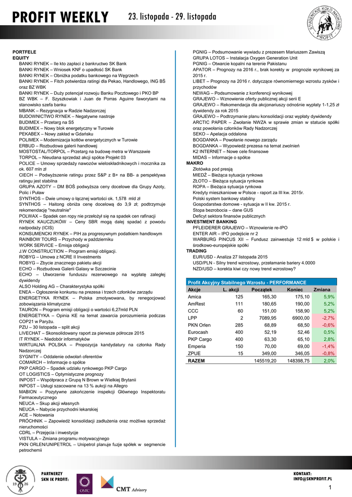 PROFIT WEEKLY 23. listopada - 29. listopada PORTFELE EQUITY BANKI RYNEK – Ile kto zapłaci z bankructwo SK Bank BANKI RYNEK – Wniosek KNF o upadłość SK Bank BANKI RYNEK – Obniżka podatku bankowego na Węgrzech BANKI RYNEK – Fitch potwierdza ratingi dla Pekao, Handlowego, ING BŚ oraz BZ WBK BANKI RYNEK – Duży potencjał rozwoju Banku Pocztowego i PKO BP BZ WBK – F. Szyszkowiak i Juan de Porras Aguirre faworytami na stanowisko szefa banku MBANK – Rezygnacja w Radzie Nadzorczej BUDOWNICTWO RYNEK – Negatywne nastroje BUDIMEX – Przetarg na S5 BUDIMEX – Nowy blok energetyczny w Turowie PEKABEX – Nowy zakład w Gdańsku POLIMEX – Modernizacja kotłów energetycznych w Turowie ERBUD – Rozbudowa galerii handlowej MOSTOSTAL/TORPOL – Przetarg na budowę metra w Warszawie TORPOL – Nieudana sprzedaż akcji spółce Projekt 03 POLICE – Umowy sprzedaży nawozów wieloskładnikowych i mocznika za ok. 607 mln zł CIECH – Podwyższenie ratingu przez S&P z B+ na BB- a perspektywa ratingu jest stabilna GRUPA AZOTY – DM BOŚ podwyższa ceny docelowe dla Grupy Azoty, Polic i Puław SYNTHOS – Dwie umowy o łącznej wartości ok. 1,578 mld zł SYNTHOS – Haitong obniża cenę docelową do 3,9 zł; podtrzymuje rekomendację "neutralnie" POLWAX – Spadek cen ropy nie przełożył się na spadek cen rafinacji RYNEK KAUCZUKÓW – Ceny SBR mogą dalej spadać z powodu nadpodaży (ICIS) KONSUMENCKI RYNEK – PIH za progresywnym podatkiem handlowym RAINBOW TOURS – Przychody w październiku WORK SERVICE – Emisja obligacji J.W CONSTRUCTION – Program emisji obligacji. ROBYG – Umowa z NCRE II Investments ROBYG – Zbycie znacznego pakietu akcji ECHO – Rozbudowa Galerii Galaxy w Szczecinie ECHO – Utworzenie funduszu rezerwowego na wypłatę zaległej dywidendy ALSO Holding AG – Charakterystyka spółki ENEA – Ogłoszenie konkursu na prezesa i trzech członków zarządu ENERGETYKA RYNEK – Polska zmotywowana, by renegocjować zobowiązania klimatyczne TAURON – Program emisji obligacji o wartości 6,27mld PLN ENERGETYKA – Opinia KE na temat zawarcia porozumienia podczas COP21 w Paryżu. PZU – 30 listopada – split akcji LIVECHAT – Skonsolidowany raport za pierwsze półrocze 2015 IT RYNEK – Niedobór informatyków WIRTUALNA POLSKA – Propozycja kandydatury na członka Rady Nadzorczej SYGNITY – Oddalenie odwołań oferentów COMARCH – Informacje o spółce PKP CARGO – Spadek udziału rynkowego PKP Cargo OT LOGISTICS – Optymistyczne prognozy INPOST – Współpraca z Grupą N Brown w Wielkiej Brytanii INPOST – Usługi szacowane na 13 % aukcji na Allegro MABION – Pozytywne zakończenie inspekcji Głównego Inspektoratu Farmaceutycznego NEUCA – Skup akcji własnych NEUCA – Nabycie przychodni lekarskiej ACE – Notowania PRÓCHNIK – Zapowiedź konsolidacji zadłużenia oraz możliwa sprzedaż nieruchomości CDRL – Przejęcia i inwestycje VISTULA – Zmiana programu motywacyjnego PKN ORLEN/UNIPETROL – Unipetrol planuje fuzje spółek w segmencie petrochemii PARTNERZY SKN IK PROFIT: PGNIG – Podsumowanie wywiadu z prezesem Mariuszem Zawiszą GRUPA LOTOS – Instalacja Oxygen Generation Unit PGNIG – Otwarcie kopalni na terenie Pakistanu APATOR – Prognozy na 2016 r., brak korekty w prognozie wynikowej za 2015 r. LIBET – Prognozy na 2016 r. dotyczące równomiernego wzrostu zysków i przychodów NEWAG – Podsumowanie z konferencji wynikowej GRAJEWO – Wznowienie oferty publicznej akcji serii E GRAJEWO – Rekomendacja dla akcjonariuszy odnośnie wypłaty 1-1,25 zł dywidendy za rok 2015 GRAJEWO – Podtrzymanie planu konsolidacji oraz wypłaty dywidendy ARCTIC PAPER – Zwołanie NWZA w sprawie zmian w statucie spółki oraz powołania członków Rady Nadzorczej SEKO – Apelacja oddalona BOGDANKA – Powołanie nowego zarządu BOGDANKA – Wypowiedź prezesa na temat zwolnień K2 INTERNET – Nowe cele finansowe MIDAS – Informacje o spółce MAKRO Złotówka pod presją MIEDŹ – Bieżąca sytuacja rynkowa ZŁOTO – Bieżąca sytuacja rynkowa ROPA – Bieżąca sytuacja rynkowa Kredyty mieszkaniowe w Polsce - raport za III kw. 2015r. Polski system bankowy stabilny Gospodarstwa domowe - sytuacja w II kw. 2015 r. Stopa bezrobocia – dane GUS Deficyt sektora finansów publicznych INVESTMENT BANKING PFLEIDERER GRAJEWO – Wznowienie re-IPO ENTER AIR – IPO podejście nr 2 WARBURG PINCUS XII – Fundusz zainwestuje 12 mld $ w polskie i środkowo-europejskie spółki TRADING EUR/USD - Analiza 27 listopada 2015 USD/PLN - Silny trend wzrostowy, przełamanie bariery 4.0000 NZD/USD – korekta kiwi czy nowy trend wzrostowy? Profit Akcyjny Stabilnego Wzrostu - PERFORMANCE Akcje L. akcji Początek Koniec Amica AmRest CCC LPP PKN Orlen Eurocash PKP Cargo Emperia ZPUE RAZEM 125 111 60 2 285 400 400 150 15 Zmiana 165,30 180,65 151,00 7089,95 68,89 52,19 63,30 70,00 349,00 175,10 190,00 158,90 6900,00 68,50 52,46 65,10 69,00 346,05 5,9% 5,2% 5,2% -2,7% -0,6% 0,5% 2,8% -1,4% -0,8% 145519,20 148398,75 2,0% KONTAKT: [email protected] 1 PROFIT WEEKLY 23. listopada - 29. listopada PORTFELE Profit Akcyjny Stabilnego Wzrostu UPDATE: 20 listopad Akcje L. akcji Agora Eurocash PKP Cargo Emperia PKN Orlen CCC LPP ZPUE 1850 400 400 150 285 60 2 15 Początek Stop loss 13,84 52,19 63,3 70 68,89 151 7089,95 349 12,5 46 57 63 62 135 6350 315 PROFIT AKCYJNY STABILNEGO WZROSTU Stopa dochodowości portfela wyniosła 2%, co jest wartością o 1,7 p.p. niższą od wyniku w poprzednim tygodniu. Najbardziej dochodową spółką jest CCC (5,2%), co potwierdza trafność decyzji o doborze spółki. Kolejną zyskowną spółką jest PKP Cargo ze stopą zwrotu równą 2,8%. Jednak zgodnie z przewidywaniami analizy technicznej jej trend ulega odwróceniu, dlatego akcje spółki zostaną sprzedane. Dodatnią stopą zwrotu charakteryzuje się także spółka Eurocash - zwrot na poziomie 0,5%. Do portfela postanowiliśmy dobrać akcje spółki Agora. Spółka ta dobrze