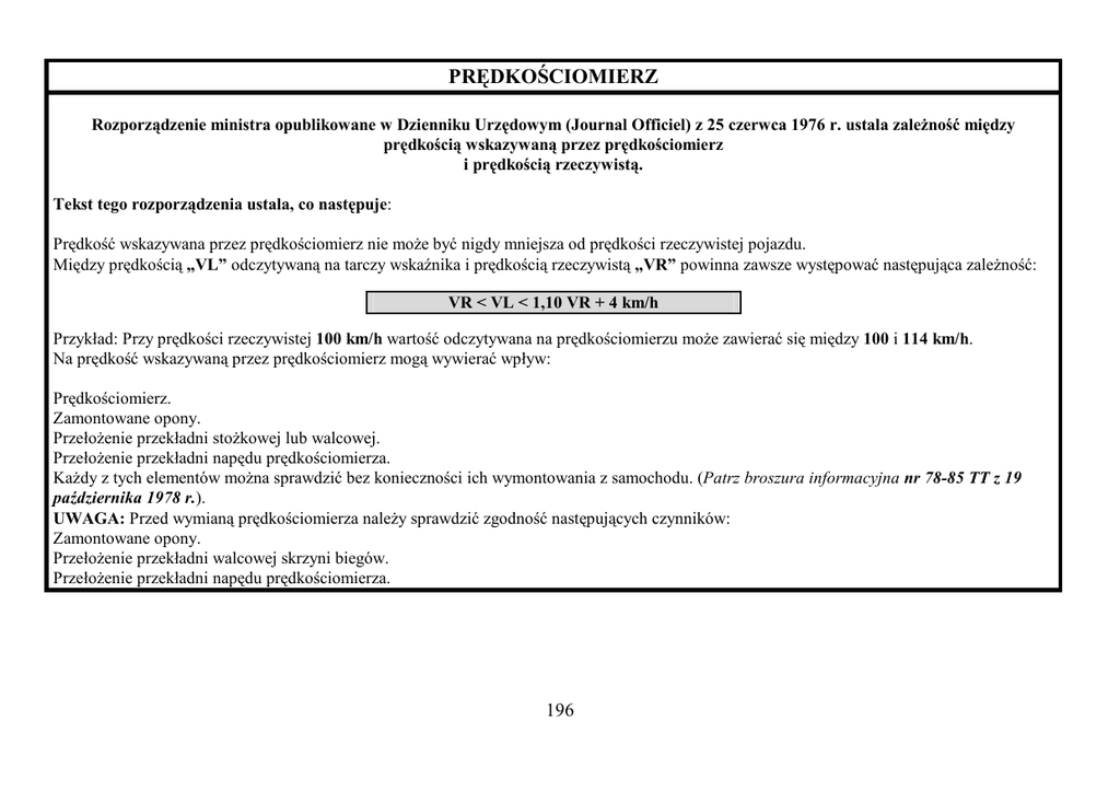 PRĘDKOŚCIOMIERZ Rozporządzenie ministra opublikowane w Dzienniku Urzędowym (Journal Officiel) z 25 czerwca 1976 r. ustala zaleŜność między prędkością wskazywaną przez prędkościomierz i prędkością rzeczywistą. Tekst tego rozporządzenia ustala, co następuje: Prędkość wskazywana przez prędkościomierz nie moŜe być nigdy mniejsza od prędkości rzeczywistej pojazdu. Między prędkością „VL” odczytywaną na tarczy wskaźnika i prędkością rzeczywistą „VR” powinna zawsze występować następująca zaleŜność: VR < VL < 1,10 VR + 4 km/h Przykład: Przy prędkości rzeczywistej 100 km/h wartość odczytywana na prędkościomierzu moŜe zawierać się między 100 i 114 km/h. Na prędkość wskazywaną przez prędkościomierz mogą wywierać wpływ: Prędkościomierz. Zamontowane opony. PrzełoŜenie przekładni stoŜkowej lub walcowej. PrzełoŜenie przekładni napędu prędkościomierza. KaŜdy z tych elementów moŜna sprawdzić bez konieczności ich wymontowania z samochodu. (Patrz broszura informacyjna nr 78-85 TT z 19 października 1978 r.). UWAGA: Przed wymianą prędkościomierza naleŜy sprawdzić zgodność następujących czynników: Zamontowane opony. PrzełoŜenie przekładni walcowej skrzyni biegów. PrzełoŜenie przekładni napędu prędkościomierza. 196