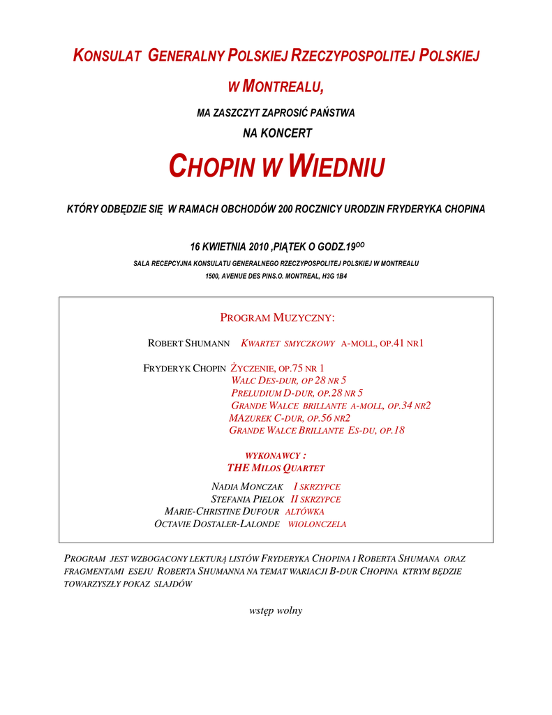 KONSULAT GENERALNY POLSKIEJ RZECZYPOSPOLITEJ POLSKIEJ W MONTREALU, MA ZASZCZYT ZAPROSIĆ PAŃSTWA NA KONCERT CHOPIN W WIEDNIU KTÓRY ODBĘDZIE SIĘ W RAMACH OBCHODÓW 200 ROCZNICY URODZIN FRYDERYKA CHOPINA 16 KWIETNIA 2010 ,PIĄTEK O GODZ.19OO SALA RECEPCYJNA KONSULATU GENERALNEGO RZECZYPOSPOLITEJ POLSKIEJ W MONTREALU 1500, AVENUE DES PINS.O. MONTREAL, H3G 1B4 PROGRAM MUZYCZNY: ROBERT SHUMANN KWARTET SMYCZKOWY A-MOLL, OP.41 NR1 FRYDERYK CHOPIN ŻYCZENIE, OP.75 NR 1 WALC DES-DUR, OP 28 NR 5 PRELUDIUM D-DUR, OP.28 NR 5 GRANDE WALCE BRILLANTE A-MOLL, OP.34 NR2 MAZUREK C-DUR, OP.56 NR2 GRANDE WALCE BRILLANTE ES-DU, OP.18 WYKONAWCY : THE MILOS QUARTET NADIA MONCZAK I SKRZYPCE STEFANIA PIELOK II SKRZYPCE MARIE-CHRISTINE DUFOUR ALTÓWKA OCTAVIE DOSTALER-LALONDE WIOLONCZELA PROGRAM JEST WZBOGACONY LEKTURĄ LISTÓW FRYDERYKA CHOPINA I ROBERTA SHUMANA ORAZ FRAGMENTAMI ESEJU ROBERTA SHUMANNA NA TEMAT WARIACJI B-DUR CHOPINA KTRYM BĘDZIE TOWARZYSZŁY POKAZ SLAJDÓW wstęp wolny