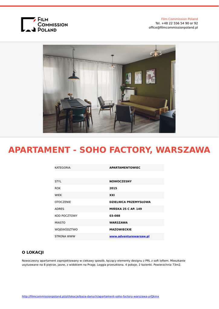Film Commission Poland Tel. +48 22 556 54 90 or 92 office@filmcommissionpoland.pl APARTAMENT - SOHO FACTORY, WARSZAWA KATEGORIA APARTAMENTOWIEC STYL NOWOCZESNY ROK 2015 WIEK XXI OTOCZENIE DZIELNICA PRZEMYSŁOWA ADRES MIŃSKA 25 C AP. 149 KOD POCZTOWY 03-088 MIASTO WARSZAWA WOJEWÓDZTWO MAZOWIECKIE STRONA WWW www.adventurewarsaw.pl O LOKACJI Nowoczesny apartament zaprojektowany w ciekawy sposób, łączący elementy designu z PRL z soft loftem. Mieszkanie usytuowane na 8 piętrze, jasne, z widokiem na Pragę. Loggia przeszklona. 4 pokoje, 2 łazienki. Powierzchnia 73m2. http://filmcommissionpoland.pl/pl/lokacje/baza-danych/apartament-soho-factory-warszawa-yrQkmx