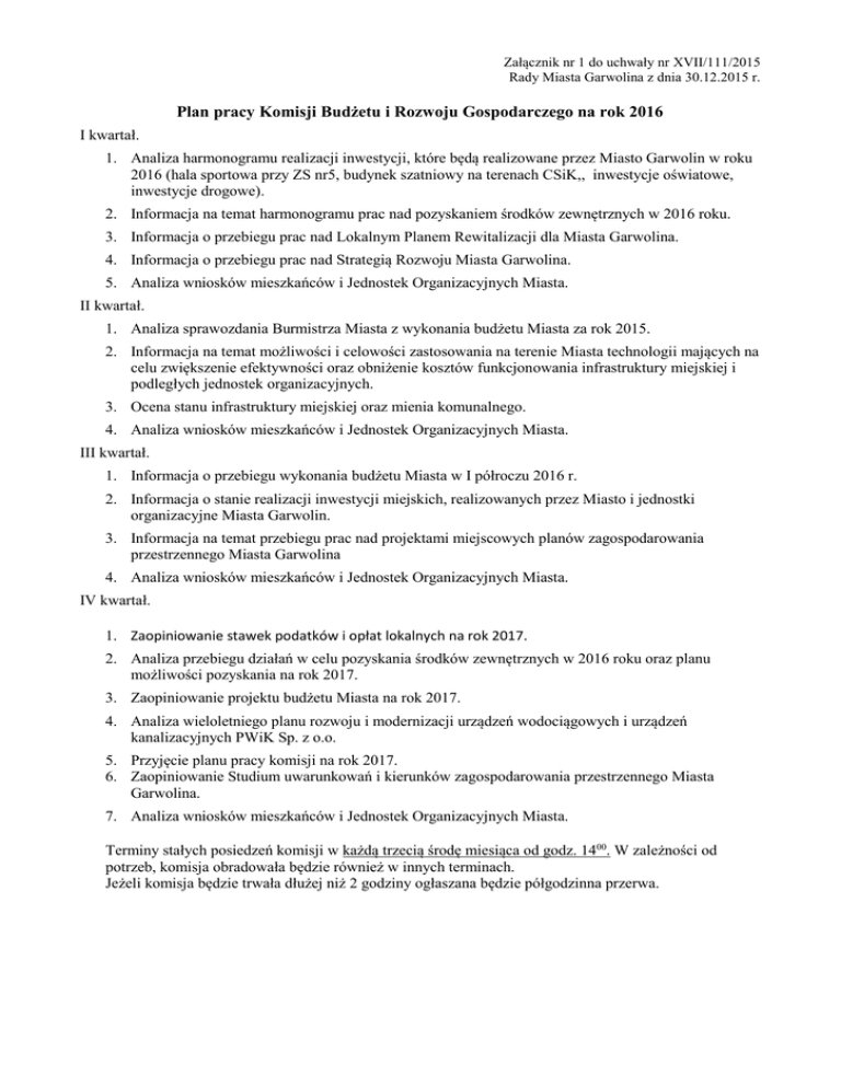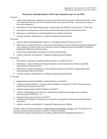Załącznik nr 1 do uchwały nr XVII/111/2015 Rady Miasta Garwolina z dnia 30.12.2015 r. Plan pracy Komisji Budżetu i Rozwoju Gospodarczego na rok 2016 I kwartał. 1. Analiza harmonogramu realizacji inwestycji, które będą realizowane przez Miasto Garwolin w roku 2016 (hala sportowa przy ZS nr5, budynek szatniowy na terenach CSiK,, inwestycje oświatowe, inwestycje drogowe). 2. Informacja na temat harmonogramu prac nad pozyskaniem środków zewnętrznych w 2016 roku. 3. Informacja o przebiegu prac nad Lokalnym Planem Rewitalizacji dla Miasta Garwolina. 4. Informacja o przebiegu prac nad Strategią Rozwoju Miasta Garwolina. 5. Analiza wniosków mieszkańców i Jednostek Organizacyjnych Miasta. II kwartał. 1. Analiza sprawozdania Burmistrza Miasta z wykonania budżetu Miasta za rok 2015. 2. Informacja na temat możliwości i celowości zastosowania na terenie Miasta technologii mających na celu zwiększenie efektywności oraz obniżenie kosztów funkcjonowania infrastruktury miejskiej i podległych jednostek organizacyjnych. 3. Ocena stanu infrastruktury miejskiej oraz mienia komunalnego. 4. Analiza wniosków mieszkańców i Jednostek Organizacyjnych Miasta. III kwartał. 1. Informacja o przebiegu wykonania budżetu Miasta w I półroczu 2016 r. 2. Informacja o stanie realizacji inwestycji miejskich, realizowanych przez Miasto i jednostki organizacyjne Miasta Garwolin. 3. Informacja na temat przebiegu prac nad projektami miejscowych planów zagospodarowania przestrzennego Miasta Garwolina 4. Analiza wniosków mieszkańców i Jednostek Organizacyjnych Miasta. IV kwartał. 1. Zaopiniowanie stawek podatków i opłat lokalnych na rok 2017. 2. Analiza przebiegu działań w celu pozyskania środków zewnętrznych w 2016 roku oraz planu możliwości pozyskania na rok 2017. 3. Zaopiniowanie projektu budżetu Miasta na rok 2017. 4. Analiza wieloletniego planu rozwoju i modernizacji urządzeń wodociągowych i urządzeń kanalizacyjnych PWiK Sp. z o.o. 5. Przyjęcie planu pracy komisji na rok 2017. 6. Zaopiniowanie Studium uwarunkowań i kierunków zagospodarowania przestrzennego Miasta Garwolina. 7. Analiza wniosków mieszkańców i Jednostek Organizacyjnych Miasta. Terminy stałych posiedzeń komisji w każdą trzecią środę miesiąca od godz. 1400. W zależności od potrzeb, komisja obradowała będzie również w innych terminach. Jeżeli komisja będzie trwała dłużej niż 2 godziny ogłaszana będzie półgodzinna przerwa.