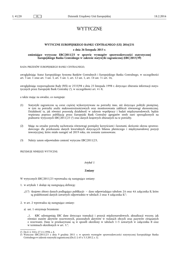 L 41/28 Dziennik Urzędowy Unii Europejskiej PL 18.2.2016 WYTYCZNE WYTYCZNE EUROPEJSKIEGO BANKU CENTRALNEGO (UE) 2016/231 z dnia 26 listopada 2015 r. zmieniające wytyczne EBC/2011/23 w sprawie wymogów sprawozdawczości statystycznej Europejskiego Banku Centralnego w zakresie statystyki zagranicznej (EBC/2015/39) RADA PREZESÓW EUROPEJSKIEGO BANKU CENTRALNEGO, uwzględniając Statut Europejskiego Systemu Banków Centralnych i Europejskiego Banku Centralnego, w szczególności art. 3 ust. 1 oraz art. 3 ust. 3, art. 5 ust. 1, art. 12 ust. 1, art. 14 ust. 3 i art. 16, uwzględniając rozporządzenie Rady (WE) nr 2533/98 z dnia 23 listopada 1998 r. dotyczące zbierania informacji statys tycznych przez Europejski Bank Centralny (1), w szczególności art. 4 i 8, a także mając na uwadze, co następuje: (1) Statystyki zagraniczne są coraz częściej wykorzystywane na potrzeby inne, niż dotyczące polityki pieniężnej, w tym na potrzeby analiz makroostrożnościowych oraz monitorowania zakłóceń równowagi ekonomicznej. Działalność ta, jak również pozostałą działalność w zakresie współpracy i badań międzynarodowych, będzie wspierana poprzez publikację przez Europejski Bank Centralny agregatów strefy euro sporządzonych na podstawie wytycznych EBC/2011/23 (2) oraz danych krajowych zbieranych na te potrzeby. (2) Mając na uwadze potrzebę zachowania równowagi pomiędzy korzyściami i kosztami, skrócenie okresu sprawoz dawczego dla przekazania danych kwartalnych dotyczących bilansu płatniczego i międzynarodowej pozycji inwestycyjnej, które miało nastąpić od 2019 roku, nie zostanie zastosowane. (3) Należy zatem odpowiednio zmienić wytyczne EBC/2011/23, PRZYJMUJE NINIEJSZE WYTYCZNE: Artykuł 1 Zmiany W wytycznych EBC/2011/23 wprowadza się następujące zmiany: 1. w artykule 1 dodaje się następującą definicję: „(17) »krajowe zbiory danych podlegające publikacji« – dane odpowiadające tabelom 2A oraz 4A załącznika II, które są podzbiorami danych zawartych odpowiednio w tabelach 2 oraz 4 załącznika II.”; 2. w art. 2 wprowadza się następujące zmiany: a) ust. 1 otrzymuje brzmienie: „1. KBC udostępniają EBC dane dotyczące transakcji i pozycji międzynarodowych, aktualizacji wyceny, jak również stanów aktywów rezerwowych, pozostałych aktywów w walutach obcych oraz pasywów związanych z rezerwami. Dane te przekazywane są w sposób określony w tabelach 1–5 zawartych w załączniku II oraz w terminach określonych w art. 3.”; (1) Dz.U. L 318 z 27.11.1998, s. 8. (2) Wytyczne EBC/2011/23 z dnia 9 grudnia 2011 r. w sprawie wymogów sprawozdawczości statystycznej Europejskiego Banku Centralnego w zakresie statystyki zagranicznej (Dz.U. L 65 z 3.3.2012, s. 1). 18.2.2016 PL Dziennik Urzędowy Unii Europejskiej L 41/29 b) dodaje się ust. 1a w brzmieniu: „1a. Podzbiory zawarte w tabelach 2A oraz 4A załącznika II udostępniane są EBC wraz z przekazaniem danych zawartych odpowiednio w tabelach 2 i 4 tego samego załącznika. Powyższe obejmuje kwartalne transakcje międzynarodowe oraz pozycje, które podlegają przekazaniu w terminach ustalonych dla kwartalnej statystyki bilansu płatniczego i międzynarodowej pozycji inwestycyjnej, określonych w art. 3.”; 3. w art. 3 ust. 2 wprowadza się następujące zmiany: a) lit. b) otrzymuje brzmienie: „b) w 82. dniu kalendarzowym po upływie kwartału, którego dane dotyczą – od 2017 r.”; b) skreśla się lit. c; 4. dodaje się art. 3a w brzmieniu: „Artykuł 3a Przekazanie i publikacja danych przez EBC 1. EBC przekazuje KBC publikowane przez siebie agregaty strefy euro oraz krajowe zbiory danych podlegające publikacji zbierane na podstawie art. 2. 2. EBC może opublikować krajowe zbiory danych podlegające publikacji po publikacji odpowiednich agregatów strefy euro.”; 5. artykuł 6 ust. 3 otrzymuje brzmienie: „3. Jeśli wartość danych dotyczących pozycji określonych w tabelach 1–5 załącznika II jest nieistotna lub nieznacząca dla strefy euro i statystyk krajowych lub jeśli danych takich nie da się zebrać przy zachowaniu racjonalnych kosztów, wówczas zezwala się na przekazywanie najlepszych szacunków opartych o odpowiednie metodologie statystyczne, pod warunkiem że nie ucierpi na tym analityczna wartość statystyki. Dodatkowo, dopuszcza się zastosowanie najlepszych szacunków dla następujących podziałów określonych w tabelach 1, 2, 2A i 6 załącznika II: a) podział dochodów pierwotnych z innych inwestycji; b) podział dochodów pierwotnych i dochodów wtórnych; c) podział transferów kapitałowych w rachunku kapitałowym; d) podział geograficzny zobowiązań z tytułu instrumentów pochodnych; e) saldo dodatnie reinwestowanych zysków z tytułu jednostek uczestnictwa funduszy inwestycyjnych nieposiada jących kodu ISIN; f) saldo dodatnie dochodów z inwestycji z tytułu jednostek uczestnictwa funduszy inwestycyjnych posiadających kod ISIN (do momentu w którym scentralizowana baza danych papierów wartościowych będzie gotowa do wyliczenia tej pozycji); g) podział transgranicznego przewozu banknotów euro według ich nominałów.”; 6. załączniki I i II podlegają zmianom zgodnie z załącznikiem do niniejszych wytycznych. Artykuł 2 Skuteczność i implementacja 1. Niniejsze wytyczne stają się skuteczne z dniem zawiadomienia o nich krajowych banków centralnych państw członkowskich, których walutą jest euro. 2. Banki centralne Eurosystemu stosują się do postanowień niniejszych wytycznych od dnia 1 czerwca 2016 r. L 41/30 PL Dziennik Urzędowy Unii Europejskiej 18.2.2016 Artykuł 3 Adresaci Niniejsze wytyczne adresowane są do banków centralnych Eurosystemu. Sporządzono we Frankfurcie nad Menem dnia 26 listopada 2015 r. W imieniu Rady Prezesów EBC Mario DRAGHI Prezes EBC 18.2.2016 PL Dziennik Urzędowy Unii Europejskiej L 41/31 ZAŁĄCZNIK W załącznikach I i II do wytycznych EBC/2011/23 wprowadza się następujące zmiany: 1. w 