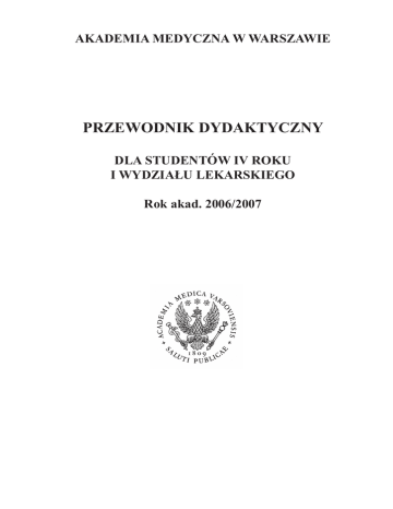 AKADEMIA MEDYCZNA W WARSZAWIE PRZEWODNIK DYDAKTYCZNY DLA STUDENTÓW IV ROKU I WYDZIAŁU LEKARSKIEGO Rok akad. 2006/2007 Opracowanie edytorskie: Oficyna Wydawnicza Akademii Medycznej w Warszawie Wydrukowano w Oficynie Wydawniczej Akademii Medycznej w Warszawie Zam. 226/2006 nakład 330 egz. tel. (022) 572 03 27 e– mail: [email protected] SPIS TREŚCI 1. WŁADZE UCZELNI 3 2. FARMAKOLOGIA I TOKSYKOLOGIA 7 3. CHOROBY WEWNĘTRZNE 9 4. PEDIATRIA 13 5. DERMATOLOGIA I WENEROLOGIA 16 6. PSYCHIATRIA 19 7. PSYCHIATRIA DZIECIĘCA 21 8. DIAGNOSTYKA LABORATORYJNA 23 9. HIGIENA 25 10. EPIDEMIOLOGIA 27 11. 29 GENETYKA KLINICZNA 12. MEDYCYNA NUKLEARNA 31 13. IMMUNOLOGIA KLINICZNA 33 14. MEDYCYNA RODZINNA 35 15. OTOLARYNGOLOGIA DZIECIĘCA 37 16. PLAN STUDIÓW 38 WŁADZE AKADEMII MEDYCZNEJ W WARSZAWIE REKTOR – prof. dr hab. LESZEK PĄCZEK PROREKTOR ds. DYDAKTYCZNO–WYCHOWAWCZYCH – prof. dr hab. PIOTR ZABOROWSKI PROREKTOR ds. NAUKI I WSPÓŁPRACY Z ZAGRANICĄ – prof. dr hab. RYSZARDA CHAZAN PROREKTOR ds. KLINICZNYCH I INWESTYCJI – prof. dr hab. WIESŁAW GLIŃSKI PROREKTOR ds. KADRY NAUKOWEJ – prof. dr hab. JERZY STELMACHÓW DZIEKAN I WYDZIAŁU LEKARSKIEGO – prof. dr hab. MAREK KRAWCZYK Prodziekan ds. I/II r. – prof. nadzw. dr hab. MAREK KULUS Prodziekan ds. III/IV r. – prof. dr hab. KAZIMIERZ WARDYN Prodziekan ds. V/VI r. – prof. dr hab. IRENEUSZ W. KRASNODĘBSKI Prodziekan ds. przewodów doktorskich – prof. nadzw. dr hab. ANNA KAMIŃSKA Prodziekan ds. studiów doktoranckich – prof. dr hab. PIOTR PRUSZCZYK Prodziekan ds. Oddziału Stomatologicznego – prof. dr hab. RENATA GÓRSKA Pełnomocnik Dziekana ds. nauczania Elektroradiologii – prof. dr hab. MAREK GOŁĘBIOWSKI Pełnomocnik Dziekana ds. nauczania Higieny Stomatologicznej dr hab. Sylwia Słotwińska Pełnomocnik Dziekana ds. nauczania Technik Dentystycznych dr hab. Leopold Wagner Przewodniczący Rady Pedagogicznej IV r. – dr hab. Teresa Jackowska Kierownik dziekanatu – p. Grażyna Wyglądacz tel. (022) 572 02 08 fax (022) 572 02 66 pok. 208 SEKRETARIAT I WYDZIAŁU LEKARSKIEGO Sprawy studenckie IV r. studiów p. mgr Krystyna Kijewska, pok. 212, codziennie w godz. 1030–1500 tel. (022) 5720 212, fax: (022) 5720 266 SEKCJA SPRAW BYTOWYCH STUDENTÓW tel. (022) 572 08 14 (022) 572 08 15 WŁADZE UCZELNI urzędują na ul. Żwirki i Wigury 61 Przychodnia dla studentów AM: ul. Oczki 6, tel. (022) 502 12 27 RAMOWY PROGRAM PRAKTYK STUDENTÓW IV ROKU I WYDZIAŁU LEKARSKIEGO Po IV roku studiów obowiązuje studentów 4-tygodniowa praktyka (20 dni roboczych)- 140 godzin z Pediatrii do wyboru w Klinice (Oddziale) – 2 tygodnie i 2 tygodnie z Medycyny Rodzinnej w praktyce lekarza rodzinnego. Kierownik Kliniki (Ordynator) lub wyznaczony przez niego opiekun ustala szczegółowy zakres obowiązków i harmonogram praktyk oraz sprawuje kontrolę nad pracą studenta. Opiekunem praktyki studenckiej powinien być lekarz o odpowiednim przygotowaniu zawodowym i ogólnym. Nieobecność studenta w pracy może być usprawiedliwiona jedynie formalnym zwolnieniem lekarskim. Choroba dłuższa niż 1 dzień powoduje konieczność przedłużenia praktyki o odpowiedni okres. W miarę możliwości student pod nadzorem opiekuna winien wykonywać wszystkie czynności lekarskie. Odbycie praktyki potwierdza opiekun, a praktykę zalicza Kierownik Kliniki lub Ordynator Oddziału. W czasie 2 – tygodniowej praktyki w Zakładzie Medycyny Rodzinnej lub na Oddziale Pediatrycznym student obowiązany jest odbyć 2 całodobowe dyżury, w czasie których towarzyszy lekarzowi dyżurnemu we wszystkich czynnościach lekarskich (przyjmowanie chorych w izbie przyjęć, wykonywanie zabiegów koniecznych dla ratowania życia, udział w popołudniowych wizytach lekarskich). Celem praktyki w Oddziale Pediatrycznym jest: 1. Uzupełnienie wiadomości o organizacji Oddziału Dziecięcego (Kliniki) i powiązaniach organizacyjnych Oddziału z lecznictwem otwartym. 2. Ocena stanu dziecka i jego rozwoju psychofizycznego. 3. Zapoznanie się z pielęgnacją niemowlęcia. 4. Poznanie zasad żywienia zdrowego i chorego niemowlęcia i dziecka. 5. Doskonalenie umiejętności badania fizycznego dziecka. 6. Zapoznanie się z zasadami udzielania pierwszej pomocy. 7. Pogłębienie umiejętności właściwego rozpoznawania i różnicowania podstawowych jednostek chorobowych ze szczególnym uwzględnieniem przypadków ostrych. 8. Poznanie właściwej interpretacji wyników badań pracowniczych, radiologicznych i patomorfologicznych. 9. Udział w wizytach lekarskich i zapoznanie się z zasadami prowadzenia dokumentacji choroby. 10.Ocena stopnia nawodnienia niemowlęcia z ustaleniem wskazań do leczenia nawadniającego (ilość i skład płynu infuzyjnego). 11.Ocena równowagi kwasowo-zasadowej u chorego dziecka, zwłaszcza niemowlęcia. 12.Wykonywanie pod nadzorem zabiegów: pobieranie treści żołądkowej i dwunastniczej, płukanie żołądka, podłączanie wlewu kroplowego i wykonywanie wstrzyknięć. 13.Poznanie przepisów sanitarno-epidemiologicznych w Oddziale Niemowlęcym i Dziecięcym oraz metod zapobiegania zakażeniom szpitalnym. 14.Uczestniczenie w konsultacjach wielospecjalistycznych. Celem praktyki w zakresie Medycyny Rodzinnej jest: 1. Zapoznanie studentów z zakresem przedmiotowym oraz metodami działania w zakresie medycyny rodzinnej. 2. Udoskonalenie umiejętności komunikacji z pacjentem (przekazy niewerbalne, asertywność, empatia). 3. Motywacja do wyboru kariery zawodowej lekarza rodzinnego. Elementami praktyki w Poradni Medycyny Rodzinnej będą: a) praca z lekarzem rodzinnym w zakresie opieki nad osobami dorosłymi – 4 dni b) praca z lekarzem rodzinnym w zakresie opieki nad dzieckiem – 2 dni c) praca z lekarzem rodzinnym i pielęgniarką w zakresie profilaktyki pediatrycznej – 2 dni d) praca z lekarzem ginekologiem w poradni dla kobiet – 1 dzień e) udział w wizytach domowych u chorych dzieci i osób dorosłych – min. 1, 2 wizyty w ramach punktów a i b f) pra