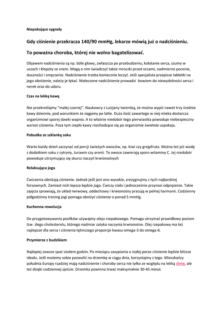Niepokojące sygnały Gdy ciśnienie przekracza 140/90 mmHg, lekarze mówią już o nadciśnieniu. To poważna choroba, której nie wolno bagatelizowad. Objawem nadciśnienia są np. bóle głowy, zwłaszcza po przebudzeniu, kołatanie serca, szumy w uszach i kłopoty ze snem. Mogą o nim świadczyd także mroczki przed oczami, nadmierne pocenie, duszności i zmęczenie. Nadciśnienie trzeba koniecznie leczyd. Jeśli specjalista przepisze tabletki na jego obniżenie, należy je łykad. Nieleczone nadciśnienie prowadzi bowiem do niewydolności serca i nerek oraz do udaru. Czas na lekką kawę Nie przekreślajmy "małej czarnej". Naukowcy z Luizjany twierdzą, że można wypid nawet trzy średnie kawy dziennie, pod warunkiem że sięgamy po latte. Duża ilośd zawartego w niej mleka dostarcza organizmowi sporej dawki wapnia. A to właśnie niedobór tego pierwiastka powoduje niebezpieczny wzrost ciśnienia. Poza tym ciepło kawy rozchodzące się po organizmie świetnie uspokaja. Pobudka ze szklanką soku Warto każdy dzieo zaczynad od porcji świeżych owoców, np. kiwi czy grejpfruta. Można też pid wodę z dodatkiem soku z cytryny, żurawin czy aronii. Te owoce zawierają sporo witaminy C. Jej niedobór powoduje utrzymujący się skurcz naczyo krwionośnych Relaksująca joga Dwiczenia obniżają ciśnienie. Jednak jeśli jest ono wysokie, zrezygnujmy z tych najbardziej forsownych. Zamiast nich lepsza będzie joga. Dwiczy ciało i jednocześnie przynosi odprężenie. Takie zajęcia sprawiają, że układ nerwowy, oddechowy i krwionośny pracują w pełnej harmonii. Codzienny półgodzinny trening jogi pomaga obniżyd ciśnienie o ponad 5 mmHg. Kuchenna rewolucja Do przygotowywania posiłków używajmy oleju rzepakowego. Pomaga utrzymad prawidłowy poziom tzw. złego cholesterolu, którego nadmiar zatyka naczynia krwionośne. Olej rzepakowy ma też najlepsze dla serca i ciśnienia tętniczego proporcje kwasu omega-3 do omega-6. Przymierze z budzikiem Najlepiej zawsze spad siedem godzin. Po miesiącu zasypiania o stałej porze ciśnienie będzie bliższe ideału. Jeśli możemy sobie pozwolid na drzemkę w ciągu dnia, korzystajmy z tego. Mieszkaocy południa Europy rzadziej mają nadciśnienie i choroby serca nie tylko ze względu na lekką dietę, ale też dzięki codziennej sjeście. Drzemka powinna trwad maksymalnie 30-45 minut. Kwadrans na śmiech Według badao osoby ponure częściej chorują m.in. na nadciśnienie. Przewlekły stres przyczynia się do bowiem do zwężania tętnic. Śmiech obniża poziom hormonów stresu, zmniejsza napięcie mięśni i stabilizuje tempo pracy serca. Powoduje też wydzielanie endorfin, poprawiających nastrój i działających przeciwbólowo. Głośny, chodby krótkotrwały śmiech, uruchamia przeponę, co ułatwia oddychanie. Rozsądna dawka słooca Bez niego organizm nie potrafi wytworzyd witaminy D, która wpływa na przyswajanie wapnia. Gdy brak tego pierwiastka, ciśnienie skacze. Dlatego warto spędzad na powietrzu chociaż pół godziny dziennie. Nie zapominaj wtedy o okularach przeciwsłonecznych, które chronią przed groźnymi promieniami UV. Krótki spacer poprawia kondycję psychiczną i pomaga się odstresowad, co też reguluje ciśnienie. Zioła w roli głównej Nie powinno ich zabraknąd w naszej kuchni. Korzystnie działa napar z owoców głogu, który wzmacnia serce i obniża ciśnienie. Jeśli naszym problemem jest stres, sięgajmy z kolei po uspokajające zioła, np. melisę lub lipę. Napary pijmy ciepłe, dwa razy dziennie po pół szklanki. Przerwa od soli Wędliny, sery i pieczywo mają w sobie sporo soli. Jej nadmiar z kolei powoduje zatrzymywanie wody i wpływa na wzrost ciśnienia. Dosalanie potraw nie ma więc sensu. Zamiast tego warto dodawad do nich świeżą natkę. Listki pietruszki regulują ciśnienie, dzięki zawartości kumaryny. Jego wartośd można także obniżyd, zjadając codziennie ząbek czosnku. Poprawne oddychanie Specjaliści od muzykoterapii zalecają, by robid to w rytm muzyki indyjskiej czy celtyckiej. Warto usiąśd lub położyd się wygodnie na podłodze i oddychad głęboko przy jej dźwiękach. Podczas wdechu unosimy ramiona, a opuszczamy je, wydychając powietrze. Taki odprężający seans powinien trwad od 15 do 30 min dziennie. Ważne pierwiastki Jednym z nich jest potas, który przyspiesza usuwanie nadmiaru sodu z organizmu i obniża ciśnienie. Najwięcej tego pierwiastka znajduje się w bananach, ziemniakach, szpinaku, dyni i arbuzie. Ciśnienie regulują też przekąski z magnezem, np. orzechy i suszone owoce. Można je więc łatwo obniżyd. Wystarczy regularnie dwiczyd i zmienid dietę. Gdy ciśnienie się unormuje, od razu poczujemy się lepiej.