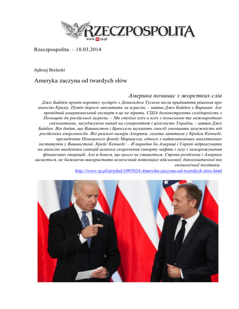 Rzeczpospolita. – 18.03.2014 Jędrzej Bielecki Ameryka zaczyna od twardych słów Америка починає з жорстких слів Джо Байден провів коротку зустріч з Дональдом Туском після прийняття рішення про анексію Криму. Путін дорого заплатить за агресію, - заявив Джо Байден у Варшаві. Але провідний американський експерт в це не вірить. США демонструють солідарність з Польщею до російської загрози. – Ми стоїмо пліч о пліч з польською та міжнародною спільнотами, засуджуючи напад на суверенітет і цілісність України, - заявив Джо Байден. Він додав, що Вашингтон і Брюссель шукають спосіб зменшити залежність від російських енергоносіїв. Які реальні наміри Америки, газета запитала у Крейга Кеннеді, президента Німецького фонду Маршалла, одного з найвпливовіших аналітичних інститутів у Вашингтоні. Крейг Кеннеді: – Я порадив би Америці і Європі відреагувати на анексію введенням санкцій шляхом скорочення імпорту нафти і газу і заморожування фінансових операцій. Але я боюся, що цього не станеться. Європа розділена і Америка вагається, не бажаючи використати величезний потенціал військової, дипломатичної та економічної політики. http://www.rp.pl/artykul/1095024-Ameryka-zaczyna-od-twardych-slow.html Joe Biden spotkał się z Donaldem Tuskiem kilkadziesiąt minut po decyzji o aneksji Krymu Джо Байден провів коротку зустріч з Дональдом Туском після прийняття рішення про анексію Криму źródło: Fotorzepa autor: Jerzy Dudek Polska – USA. Putin drogo zapłaci za agresję – mówi Joe Biden w Warszawie. Ale czołowy amerykański ekspert w to nie wierzy. USA demonstrują solidarność z Polską wobec rosyjskiego zagrożenia. Dlatego z kilkugodzinną wizytą do Warszawy przyleciał wiceprezydent USA Joe Biden. Spotkał się z Donaldem Tuskiem i Bronisławem Komorowskim, a także osobno z prezydentem Estonii Toomasem Hendrikiem Ilvesem. Potem poleciał do Wilna na rozmowy z przywódcami Litwy i Łotwy. – Nie miejcie wątpliwości: USA wykonają zobowiązania, zawsze się z nich wywiązujemy – oświadczył Biden, nawiązując do art. 5 traktatu waszyngtońskiego. Podkreślił, że do 2018 r. w Polsce powstaną elementy tarczy antyrakietowej. – Stajemy ramię w ramię z Polską i społecznością międzynarodową, potępiając napaść na suwerenność i integralność Ukrainy – dodał. Zapowiedział, że Waszyngton i Bruksela będą szukać sposobu na ograniczenie uzależnienia od rosyjskich surowców energetycznych. Według Tuska ocena polityki Putina przez polskie i amerykańskie władze jest identyczna. – Polacy i Amerykanie zdają sobie sprawę, że na naszych oczach zmienia się historia regionu i że ta zmiana ma wymiar i kontekst globalny. Jeśli mówimy o głębokim zaniepokojeniu Polski, to mówimy z przekonaniem, że to zaniepokojenie podziela cała wspólnota Zachodu – dodał premier. Komorowski przypomniał, jak skuteczna okazała się w latach 80. XX wieku twarda polityka USA w doprowadzeniu do rozpadu ZSRR. Dał do zrozumienia, że taką samą strategię Waszyngton powinien przyjąć także teraz. Zdaniem dyplomatów Biden chciał wysondować reakcję Polski na kolejne sankcje, jakie Barack Obama może ogłosić w przyszłym tygodniu w czasie podróży do Europy. Craig Kennedy specjalnie dla „Rz" Jakie są rzeczywiście zamiary Ameryki, ujawnił Craig Kennedy, prezes German Marshall Fund, jednego z najbardziej wpływowych instytutów analitycznych w Waszyngtonie. Rz: Rosja anektowała Krym. Ujdzie jej to na sucho? Craig Kennedy: Bardzo bym chciał, aby Ameryka i Europa zareagowały na tę grabież, wprowadzając sankcje tam, gdzie Rosję boli najbardziej: przez ograniczenie importu ropy i gazu oraz zamrożenie transakcji finansowych. Ale obawiam się, że tak się nie stanie. Europa jest podzielona, a Ameryka się waha, nie chce użyć ogromnego potencjału militarnego, dyplomatycznego i ekonomicznego. Nie jestem optymistą. To wina Baracka Obamy? Problem jest szerszy. Stany Zjednoczone nie wygrały ani jednej wojny od 1945 r. Traumą były bardzo drogie i złożone konflikty w Afganistanie i Iraku. Do tego dochodzi kryzys finansowy z 2008 r., który bardzo podważył ufność Amerykanów. Gdy w latach 1997–1998 Bill Clinton prowadził kampanię na rzecz poszerzenia NATO, Stany Zjednoczone miały kwitnącą gospodarkę. To była zupełnie inna sytuacja. Dziś prezydent bardzo sceptycznie odnosi się do wszelkich działań wojskowych, a priorytetów w polityce zagranicznej ma niewiele. Jednak po wejściu w 1978 r. Rosjan do Afganistanu nawet tak słaby prezydent jak Jimmy Carter radykalnie zmienił politykę wobec ZSRR. Mamy już inny świat. Rosja nie jest dla Ameryki tak straszna, jak wydawał się Związek Radziecki. Ameryka musi się natomiast liczyć z innymi zagrożeniami, przede wszystkim w Azji. Takiej reakcji jak w 1978 r. więc nie będzie. Kongres nie wymusi na Białym Domu bardziej zdecydowanego działania? Ted Cruz czy John McCain będą forsowali takie inicjatywy, jak powrót do koncepcji budowy tarczy antyrakietowej sprzed 2009 r. Ale 