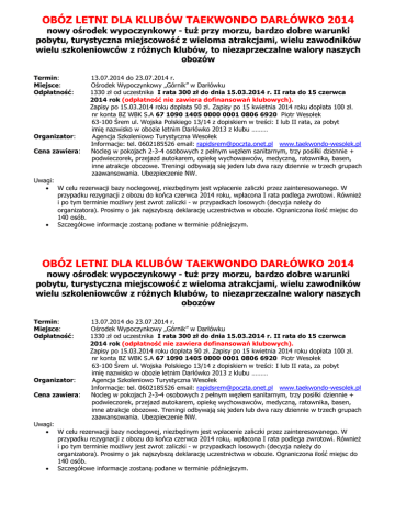 OBÓZ LETNI DLA KLUBÓW TAEKWONDO DARŁÓWKO 2014 nowy ośrodek wypoczynkowy - tuż przy morzu, bardzo dobre warunki pobytu, turystyczna miejscowość z wieloma atrakcjami, wielu zawodników wielu szkoleniowców z różnych klubów, to niezaprzeczalne walory naszych obozów Termin: Miejsce: Odpłatność: Organizator: Cena zawiera: 13.07.2014 do 23.07.2014 r. Ośrodek Wypoczynkowy „Górnik” w Darłówku 1330 zł od uczestnika I rata 300 zł do dnia 15.03.2014 r. II rata do 15 czerwca 2014 rok (odpłatność nie zawiera dofinansowań klubowych). Zapisy po 15.03.2014 roku dopłata 50 zł. Zapisy po 15 kwietnia 2014 roku dopłata 100 zł. nr konta BZ WBK S.A 67 1090 1405 0000 0001 0806 6920 Piotr Wesołek 63-100 Śrem ul. Wojska Polskiego 13/14 z dopiskiem w treści: I lub II rata, za pobyt imię nazwisko w obozie letnim Darłówko 2013 z klubu ……… Agencja Szkoleniowo Turystyczna Wesołek Informacje: tel. 0602185526 email: [email protected] www.taekwondo-wesolek.pl Nocleg w pokojach 2-3-4 osobowych z pełnym węzłem sanitarnym, trzy posiłki dziennie + podwieczorek, przejazd autokarem, opiekę wychowawców, medyczną, ratownika, basen, inne atrakcje obozowe. Treningi odbywają się jeden lub dwa razy dziennie w trzech grupach zaawansowania. Ubezpieczenie NW. Uwagi: W celu rezerwacji bazy noclegowej, niezbędnym jest wpłacenie zaliczki przez zainteresowanego. W przypadku rezygnacji z obozu do końca czerwca 2014 roku, wpłacona I rata podlega zwrotowi. Również i po tym terminie możliwy jest zwrot zaliczki - w przypadkach losowych (decyzja należy do organizatora). Prosimy o jak najszybszą deklarację uczestnictwa w obozie. Ograniczona ilość miejsc do 140 osób. Szczegółowe informacje zostaną podane w terminie późniejszym. OBÓZ LETNI DLA KLUBÓW TAEKWONDO DARŁÓWKO 2014 nowy ośrodek wypoczynkowy - tuż przy morzu, bardzo dobre warunki pobytu, turystyczna miejscowość z wieloma atrakcjami, wielu zawodników wielu szkoleniowców z różnych klubów, to niezaprzeczalne walory naszych obozów Termin: Miejsce: Odpłatność: Organizator: Cena zawiera: 13.07.2014 do 23.07.2014 r. Ośrodek Wypoczynkowy „Górnik” w Darłówku 1330 zł od uczestnika I rata 300 zł do dnia 15.03.2014 r. II rata do 15 czerwca 2014 rok (odpłatność nie zawiera dofinansowań klubowych). Zapisy po 15.03.2014 roku dopłata 50 zł. Zapisy po 15 kwietnia 2014 roku dopłata 100 zł. nr konta BZ WBK S.A 67 1090 1405 0000 0001 0806 6920 Piotr Wesołek 63-100 Śrem ul. Wojska Polskiego 13/14 z dopiskiem w treści: I lub II rata, za pobyt imię nazwisko w obozie letnim Darłówko 2013 z klubu ……… Agencja Szkoleniowo Turystyczna Wesołek Informacje: tel. 0602185526 email: [email protected] www.taekwondo-wesolek.pl Nocleg w pokojach 2-3-4 osobowych z pełnym węzłem sanitarnym, trzy posiłki dziennie + podwieczorek, przejazd autokarem, opiekę wychowawców, medyczną, ratownika, basen, inne atrakcje obozowe. Treningi odbywają się jeden lub dwa razy dziennie w trzech grupach zaawansowania. Ubezpieczenie NW. Uwagi: W celu rezerwacji bazy noclegowej, niezbędnym jest wpłacenie zaliczki przez zainteresowanego. W przypadku rezygnacji z obozu do końca czerwca 2014 roku, wpłacona I rata podlega zwrotowi. Również i po tym terminie możliwy jest zwrot zaliczki - w przypadkach losowych (decyzja należy do organizatora). Prosimy o jak najszybszą deklarację uczestnictwa w obozie. Ograniczona ilość miejsc do 140 osób. Szczegółowe informacje zostaną podane w terminie późniejszym.