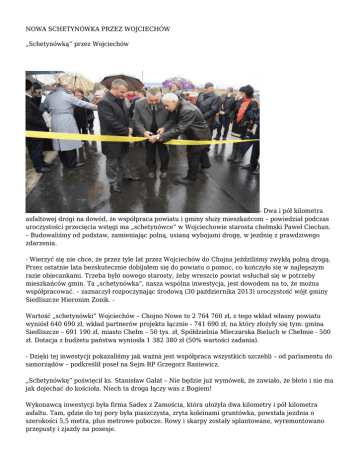 NOWA SCHETYNÓWKA PRZEZ WOJCIECHÓW „Schetynówką” przez Wojciechów - Dwa i pół kilometra asfaltowej drogi na dowód, że współpraca powiatu i gminy służy mieszkańcom – powiedział podczas uroczystości przecięcia wstęgi ma „schetynówce” w Wojciechowie starosta chełmski Paweł Ciechan. – Budowaliśmy od podstaw, zamieniając polną, usianą wybojami drogę, w jezdnię z prawdziwego zdarzenia. - Wierzyć się nie chce, że przez tyle lat przez Wojciechów do Chojna jeździliśmy zwykłą polną drogą. Przez ostatnie lata bezskutecznie dobijałem się do powiatu o pomoc, co kończyło się w najlepszym razie obiecankami. Trzeba było nowego starosty, żeby wreszcie powiat wsłuchał się w potrzeby mieszkańców gmin. Ta „schetynówka”, nasza wspólna inwestycja, jest dowodem na to, że można współpracować. – zaznaczył rozpoczynając środową (30 października 2013) uroczystość wójt gminy Siedliszcze Hieronim Zonik. Wartość „schetynówki” Wojciechów – Chojno Nowe to 2 764 760 zł, z tego wkład własny powiatu wyniósł 640 690 zł, wkład partnerów projektu łącznie - 741 690 zł, na który złożyły się tym: gmina Siedliszcze – 691 190 zł, miasto Chełm – 50 tys. zł, Spółdzielnia Mleczarska Bieluch w Chełmie - 500 zł. Dotacja z budżetu państwa wyniosła 1 382 380 zł (50% wartości zadania). - Dzięki tej inwestycji pokazaliśmy jak ważna jest współpraca wszystkich szczebli – od parlamentu do samorządów – podkreślił poseł na Sejm RP Grzegorz Raniewicz. „Schetynówkę” poświęcił ks. Stanisław Gałat – Nie będzie już wymówek, że zawiało, że błoto i nie ma jak dojechać do kościoła. Niech ta droga łączy was z Bogiem! Wykonawcą inwestycji była firma Sadex z Zamościa, która ułożyła dwa kilometry i pół kilometra asfaltu. Tam, gdzie do tej pory była piaszczysta, zryta koleinami gruntówka, powstała jezdnia o szerokości 5,5 metra, plus metrowe pobocze. Rowy i skarpy zostały splantowane, wyremontowano przepusty i zjazdy na posesje. Pamiętano także o bezpieczeństwie – ostre łuki zyskały nowe oznakowanie. Przejście dla pieszych przy szkole w Chojnie Nowym Pierwszym oznakowano lampami diodowymi, podobnie jak wjazd na drogę krajową w Wojciechowie. -To wszystko udało się nam dlatego, że nie oglądaliśmy się na to, kto jest z jakiej partii, tylko pracowaliśmy, żeby mieszkańcom żyło się lepiej – podsumowuje starosta chełmski Paweł Ciechan. – Zgoda i współpraca buduje i widać to w naszym powiecie.