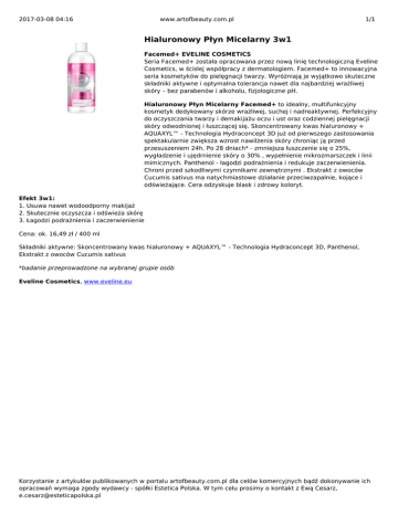 2017-03-08 04:16 www.artofbeauty.com.pl 1/1 Hialuronowy Płyn Micelarny 3w1 Facemed+ EVELINE COSMETICS Seria Facemed+ została opracowana przez nową linię technologiczną Eveline Cosmetics, w ścisłej współpracy z dermatologiem. Facemed+ to innowacyjna seria kosmetyków do pielęgnacji twarzy. Wyróżniają je wyjątkowo skuteczne składniki aktywne i optymalna tolerancja nawet dla najbardziej wrażliwej skóry – bez parabenów i alkoholu, fizjologiczne pH. Hialuronowy Płyn Micelarny Facemed+ to idealny, multifunkcyjny kosmetyk dedykowany skórze wrażliwej, suchej i nadreaktywnej. Perfekcyjny do oczyszczania twarzy i demakijażu oczu i ust oraz codziennej pielęgnacji skóry odwodnionej i łuszczącej się. Skoncentrowany kwas hialuronowy + AQUAXYL™ - Technologia Hydraconcept 3D już od pierwszego zastosowania spektakularnie zwiększa wzrost nawilżenia skóry chroniąc ją przed przesuszeniem 24h. Po 28 dniach* - zmniejsza łuszczenie się o 25%, wygładzenie i ujędrnienie skóry o 30% , wypełnienie mikrozmarszczek i linii mimicznych. Panthenol - łagodzi podrażnienia i redukuje zaczerwienienia. Chroni przed szkodliwymi czynnikami zewnętrznymi . Ekstrakt z owoców Cucumis sativus ma natychmiastowe działanie przeciwzapalnie, kojące i odświeżające. Cera odzyskuje blask i zdrowy koloryt. Efekt 3w1: 1. Usuwa nawet wodoodporny makijaż 2. Skutecznie oczyszcza i odświeża skórę 3. Łagodzi podrażnienia i zaczerwienienie Cena: ok. 16,49 zł / 400 ml Składniki aktywne: Skoncentrowany kwas hialuronowy + AQUAXYL™ - Technologia Hydraconcept 3D, Panthenol, Ekstrakt z owoców Cucumis sativus *badanie przeprowadzone na wybranej grupie osób Eveline Cosmetics, www.eveline.eu Korzystanie z artykułów publikowanych w portalu artofbeauty.com.pl dla celów komercyjnych bądź dokonywanie ich opracowań wymaga zgody wydawcy - spółki Estetica Polska. W tym celu prosimy o kontakt z Ewą Cesarz, [email protected]