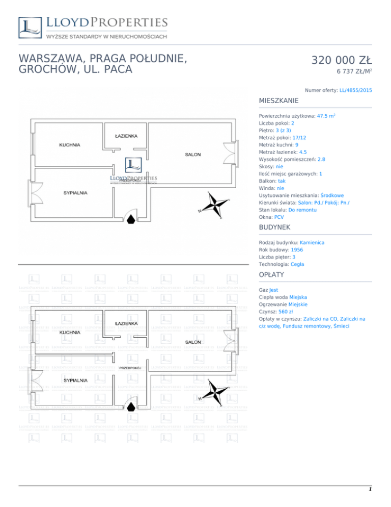 WARSZAWA, PRAGA POŁUDNIE, GROCHÓW, UL. PACA 320 000 ZŁ 6 737 ZŁ/M2 Numer oferty: LL/4855/2015 MIESZKANIE Powierzchnia użytkowa: 47.5 m2 Liczba pokoi: 2 Piętro: 3 (z 3) Metraż pokoi: 17/12 Metraż kuchni: 9 Metraż łazienek: 4.5 Wysokość pomieszczeń: 2.8 Skosy: nie Ilość miejsc garażowych: 1 Balkon: tak Winda: nie Usytuowanie mieszkania: Środkowe Kierunki świata: Salon: Pd./ Pokój: Pn./ Stan lokalu: Do remontu Okna: PCV BUDYNEK Rodzaj budynku: Kamienica Rok budowy: 1956 Liczba pięter: 3 Technologia: Cegła OPŁATY Gaz Jest Ciepła woda Miejska Ogrzewanie Miejskie Czynsz: 560 zł Opłaty w czynszu: Zaliczki na CO, Zaliczki na c/z wodę, Fundusz remontowy, Śmieci 1 Robert Altewęgier Senior Property Advisor + 48 533 300 905 [email protected] OPIS Mieszkanie które prezentuję składa się z 2 pokoi (17/13m2), oddzielnej kuchni (9 m2) oraz łazienki (4,5m2). Okna z salonu wychodzą na południe a z kuchni i sypialni na północ przez co mieszkanie jest dobrze doświetlone prze cały dzień. Mieszkanie znajduje się na 3 piętrze w 3 piętrowym budynku. Jest możliwość aranżacji wnętrza poprzez połączenie kuchni i mniejszego pokoju. Wszystkie media miejskie Cena do negocjacji Budynek został gruntownie wyremontowany, wymieniono instalacje wodno-kanalizacyjną oraz wody ciepłej. Został on docieplony a elewacje zostały odnowione. Dzięki położeniu w centrum osiedla nieszukanie jest bardzo ciche a bezpośrednie okolica otoczona jest zielenią. W odległości 5 minut od budynku znajduje się Rondo Wiatraczna które jest dobrym węzłem komunikacyjnym. Po przeciwnej stronie ronda zlokalizowany jest Uniwersam Grochów, z szeroką gamą punktów usługowych oraz bazar. 2