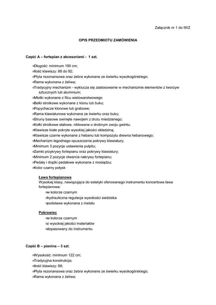Załącznik nr 1 do IWZ OPIS PRZEDMIOTU ZAMÓWIENIA Część A – fortepian z akcesoriami - 1 szt. •Długość: minimum 190 cm; •Ilość klawiszy: 88 do 92; •Płyta rezonansowa oraz żebra wykonane ze świerku wysokogórskiego; •Rama wykonana z żeliwa; •Tradycyjny mechanizm - wyklucza się zastosowanie w mechanizmie elementów z tworzyw sztucznych lub aluminium; •Młotki wykonane z filcu wielowarstwowego •Belki stroikowe wykonane z klonu lub buku; •Popychacze klonowe lub grabowe; •Rama klawiaturowa wykonana ze świerku oraz buku; •Struny basowe owinięte nawojem z drutu miedzianego; •Kołki stroikowe stalowe, niklowane o drobnym zwoju gwintu; •Klawisze białe pokryte wysokiej jakości okładziną; •Klawisze czarne wykonane z hebanu lub kompozytu drewna hebanowego; •Mechanizm łagodnego opuszczania pokrywy klawiatury; •Minimum 3 pozycje ustawienia pulpitu; •Zamki przykrywy fortepianu oraz pokrywy klawiatury; •Minimum 2 pozycje otwarcia nakrywy fortepianu; •Pedały i drążki pedałowe wykonane z mosiądzu; •Kolor czarny połysk Ława fortepianowa Wysokiej klasy, nawiązująca do estetyki oferowanego instrumentu koncertowa ława fortepianowa: •w kolorze czarnym •hydrauliczna regulacja wysokości siedziska •podstawa wykonana z metalu Pokrowiec •w kolorze czarnym •z wysokiej jakości materiałów •dopasowany do instrumentu Część B – pianina – 3 szt. •Wysokość: minimum 122 cm; •Tradycyjna konstrukcja; •Ilość klawiszy: 88; •Płyta rezonansowa oraz żebra wykonane ze świerku wysokogórskiego; •Rama wykonana z żeliwa; •Tradycyjny mechanizm - wyklucza się zastosowanie w mechanizmie elementów z tworzyw sztucznych lub aluminium; •Młotki wykonane z filcu wielowarstwowego •Belki stroikowe wykonane z klonu lub buku; •Popychacze klonowe lub grabowe; •Agrafy dla wszystkich dźwięków: 1-88, wyklucza się sztaby dociskowe; •Struny basowe owinięte nawojem z drutu miedzianego; •Kołki stroikowe stalowe, niklowane o drobnym zwoju gwintu; •Klawisze białe pokryte wysokiej jakości okładziną; •Klawisze czarne wykonane z wysokiej jakości materiału; •Pedały i okucia mosiężne lub chromowane; •Kolor czarny połysk Ława pianinowa Wysokiej klasy, nawiązująca do estetyki oferowanego instrumentu: •w kolorze czarny połysk •płynna regulacja wysokości siedziska •stabilna konstrukcja •nogi wklejane w korpus, wyklucza się połączenia śrubowe Pokrowiec •w kolorze czarnym •z wysokiej jakości materiałów •dopasowany do instrumentu Część C – organy z akcesoriami – 1 szt. - Organy kościelne elektroniczne wraz z ławą i klawiaturą nożną prostą, - 2 manuały ręczne – /twardość klawiatury zbliżona do organów tradycyjnych/ z wychwytem i regulowaną dynamiką dla głosów orkiestry i midi, - Głosy posiadające standardowe rejestry, - Manuał pedałowy – minimum 30 nut / budowa wklęsła/, - wzmacniacze wewnętrzne – 2 minimum po 60 Watt plus trzeci minimum 100 Watt, - 5 głośników, - 1 pedał ekspresji, - Crescendo minimum 16 stopni, - Manuał pedałowy – minimum 10 rejestrów, - Manuał I – minimum 12 rejestrów, - Manuał II – minimum 13 rejestrów, - Intonacja w instrumencie powinna posiadać minimum 4 intonacje fabryczne plus minimum 4 dla dowolnej intonacji z możliwością zapisu innych intonacji dzięki pamięci wewnętrznej i pamięci USB, - Instrument powinien posiadać dodatkowe głosy alternatywne dla każdego rejestru, - Dodatkowo instrument powinien posiadać minimum 8 generalnych pistonów kciukowych, minimum 16 banków pamięci, sekwenser dla kombinacji - /plus i minus/ dla pistonów kciukowych, pedał automatyczny, możliwość łączenia manuałów. - Transpozycja- minus 6 do plus 5 / półtonowo /, - Głośność generalna i pogłos regulowana pokrętłami, - Włącznik midi, - Wyświetlacz z manu- podświetlany z możliwością ustawienia parametrów głosów dla każdego rejestru osobno, regulację każdego manuału i pedału, tremolo regulowane, minimum 8 różnych pogłosów, regulowany efekt całokształtu głosu, minimum 16 temperacji z programowanym tonem podstawowym, efekt klawiatury dynamicznej ustawianej dla głosów, orkiestry i midi, możliwość ustawienia symulacji każdego rodzaju wiatrownic dla każdego rejestru, regulacja głośności nagłośnienia zewnętrznego / minimum 5 kanałów osobno regulowanych poprzez wyświetlacz, 5taśmowy equalizer dla wyjść audio i wewnętrznego nagłośnienia. - Ponadto instrument powinien posiadać MIDI In, Out, Thru, wyjście na słuchawki, Stereo Aux In, minimum 5 wyjść audio, wejście USB, - Instrument powinien posiadać podświetlany nutnik i roletę zamykaną na klawiatury, - Waga instrumentu nie powinna przekraczać 125 kg. - ława do instrumentu, - skrzynia transportowa typu: HARD CASE z płaskim dnem i zdejmowanym wiekiem, jedna ściana niezdejmowana / stanowiąca szerokość instrumentu, połączona z dnem skrzyni, 3 ściany zdejmowane, 4 kółka z blokadami kasetony z uchwytami do transportu, zamki typu motylkowego. Część D – fagot z akcesoriami – 1 szt. - Instrument profesjonalny solistyczny klasy mistrzowskiej, - Korpus grubościenny kompaktowy wykonany z długo sezonowanego drewna klonowego, - Dzielona część górna, - Mechanika systemu Heckla wkonana ze srebra niklowego, - Cała mechanika posrebrzana, - Standardowo posiada następujące klapy dodatkowe i rolki: klapa wysokiego C, klapa wysokiego D, rolki na przyciskach 6 klap: rolka na przycisku klapy niskiego Cis, rolka na przycisku klap niskiego Es, niskiego Fis, As dla małego palca, As dla kciuka oraz rolka na przycisku klapy F, - Posiada osłonę klapy B, - Klapy trylowe: F-G, E-Fis, - Balancer. - Rolka na przycisku górnej klapy Fis do prawej ręki, - Rolki na przycisku klapy kciukowego Fis do prawej ręki, - Rolka na przycisku klapy B do prawej ręki, - Rolki na przyciskach klap Cis i piano mechaniki, - Rolki na przy
