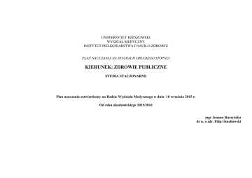 UNIWERSYTET RZESZOWSKI WYDZIAŁ MEDYCZNY INSTYTUT PIELĘGNIARSTWA I NAUK O ZDROWIU PLAN NAUCZANIA NA STUDIACH DRUGIEGO STOPNIA KIERUNEK: ZDROWIE PUBLICZNE STUDIA STACJONARNE Plan nauczania zatwierdzony na Radzie Wydziału Medycznego w dniu 10 września 2015 r. Od roku akademickiego 2015/2016 mgr Joanna Burzyńska dr n. o zdr. Filip Osuchowski Zdrowie Publiczne Studia Stacjonarne Stopień II Rok I 1 sem Nazwa przedmiotu 1 sem 1 sem 1 sem zajęcia wykład ćwiczenia kontaktowe 1 sem 2 sem. samogodziny kształcenie ogółem wykład 2 sem. 2 sem. 2 sem. 2 sem. 1 sem. zajęcia samogodziny Punkty ćwiczenia kontaktowe kształcenie ogółem ECTS 2 sem. Forma Punkty zaliczenia ECTS Język obcy Wychowanie fizyczne Szkolenie BHP 30 30 30 5 20 50 30 30 30 30 30 30 5 5 20 50 2 2 zal oc/egz 30 1 1 zal oc. zal Prawo medyczne 25 35 60 25 85 3 egz. Socjologia zdrowia 15 25 40 35 75 3 egz. 15 25 40 25 65 2 zal oc. Metodologia badań w zdrowiu publicznym Biostatystyka 15 25 40 20 60 15 25 40 20 60 2 2 Elementy zdrowia publicznego 15 25 40 15 55 15 25 40 35 75 2 3 zal oc/egz Promocja zdrowia i profilaktyka chorób 15 25 40 35 75 15 25 40 35 75 3 3 zal oc/egz Epidemiologia i nadzór sanitarnoepidemiologiczny 15 25 40 15 55 20 30 50 30 80 2 3 zal oc/egz Polityka społeczna i zdrowotna 10 25 35 25 60 2 zal oc. zal oc. 1 sem Nazwa przedmiotu Międzynarodowe problemy zdrowia publicznego 1 sem 1 sem 1 sem zajęcia wykład ćwiczenia kontaktowe 1 sem 2 sem. samogodziny kształcenie ogółem wykład 2 sem. 2 sem. 2 sem. 2 sem. 1 sem. 2 sem. zajęcia samogodziny Punkty ćwiczenia kontaktowe kształcenie ogółem ECTS Punkty ECTS 10 10 20 10 30 15 15 30 25 55 1 2 zal oc. 15 25 40 15 55 15 25 40 20 60 2 2 zal oc. 25 35 60 40 100 Żywienie człowieka Patologie społeczne 4 egz. Zarządzanie zasobami ludzkimi 10 20 30 25 55 10 30 40 25 65 Rozwój naukowy i zawodowy w zdrowiu publicznym 10 25 35 20 Zdrowie środowiskowe 15 15 30 Patofizjologia chorób cywilizacyjnych 10 20 Technologie i systemy informacyjne w ochronie zdrowia 10 30 40 25 65 Praktyka zawodowa OGÓŁEM I ROK 190 370 560 305 865 150 2 zal oc. 2 zal oc. 55 2 zal oc. 20 50 2 zal oc. 30 20 50 2 zal oc. 80 80 5 85 3 zal oc. 395 545 300 845 2 31 31 Zdrowie Publiczne Studia Stacjonarne Stopień II Rok II 1 sem Nazwa przedmiotu 1 sem 1 sem 1 sem zajęcia wykład ćwiczenia kontaktowe 1 sem samogodziny kształcenie ogółem wykład Rynek usług farmaceutycznych 10 Programy zdrowotne 10 Przedmiot ogólnouczelniany 30 Wybrane elementy POZ 10 25 20 30 2 sem. 2 sem. 2 sem. 1 sem. zajęcia samogodziny Punkty ćwiczenia kontaktowe kształcenie ogółem ECTS 25 35 20 55 2 sem. Forma Punkty zaliczenia ECTS 2 zal oc. 20 55 2 zal oc. 30 20 50 2 zal oc. 30 20 50 2 zal oc. 15 15 2 sem. 35 Ekonomika i finansowanie w ochronie zdrowia Marketing usług zdrowotnych 2 sem. 45 30 20 35 20 55 75 Zdrowie ludzi starszych 2 3 10 25 35 25 60 zal oc. egz 2 zal oc. Choroby Cywilizacyjne 15 15 30 20 50 2 zal oc. Organizacja i zarządzanie w służbie zdrowia 15 30 45 30 75 3 egz Praktyka zawodowa Seminarium magisterskie praca magisterska i egzamin OGÓŁEM przedmioty obowiązkowe II ROK 95 30 30 240 270 150 245 380 625 35 80 80 5 85 30 30 300 330 180 215 370 585 3 zal oc. 5 12 zal oc. 19 21 1 sem Nazwa przedmiotu 1 sem 1 sem 1 sem zajęcia wykład ćwiczenia kontaktowe 1 sem 2 sem. samogodziny kształcenie ogółem wykład 2 sem. 2 sem. 2 sem. 2 sem. 1 sem. 2 sem. zajęcia samogodziny Punkty ćwiczenia kontaktowe kształcenie ogółem ECTS Punkty ECTS Z PONIŻEJ PRZEDSTAWIONYCH SPECJALNOŚCI STUDENT WYBIERA JEDNĄ. SPECJALNOŚĆ I Promocja zdrowia Socjologia medycyny 20 40 60 40 100 4 egz Metodyka edukacji zdrowotnej 20 40 60 40 100 4 egz Wellnes 20 30 50 30 80 3 zal oc. Teoria i praktyka aktywności fizycznej Psychologia zdrowia 20 15 30 20 50 35 30 20 80 55 3 2 20 40 60 40 100 20 40 60 40 100 20 40 60 40 100 zal oc. 4 zal oc/egz SPECJALNOŚĆ II Organizacja i zarządzanie w opiece zdrowotnej Ustawodawstwo żywnościowożywnieniowe 4 egz Kontraktowanie świadczeń zdrowotnych 15 20 35 20 55 Planowanie i zarządzanie strategiczne 20 30 50 30 80 3 zal oc. Podstawy rachunkowości 20 30 50 30 80 3 zal oc. Ubezpieczenia społeczne i zdrowotne 20 40 60 40 100 4 egz 2 4 zal oc/egz 1 sem Nazwa przedmiotu SPECJALNOŚĆ III 1 sem 1 sem 1 sem zajęcia wykład ćwiczenia kontaktowe 1 sem 2 sem. samogodziny kształcenie ogółem wykład 2 sem. 2 sem. 2 sem. 2 sem. 1 sem. 2 sem. zajęcia samogodziny Punkty ćwiczenia kontaktowe kształcenie ogółem ECTS Punkty ECTS Telemedycyna Zdalne monitorowanie funkcji życiowych 20 30 50 30 80 3 zal oc. Usługi sieciowe i bazy danych w ochronie zdrowia 20 30 50 30 80 3 zal oc. Teleopieka medyczna nad e-pacjentem 15 20 35 30 65 Źródła informacji o zdrowiu 20 40 60 40 100 Zdrowie społeczeństwa informacyjnego OGÓŁEM specjalności do wyboru II ROK 225 360 585 370 955 20 40 60 40 162 Liczba punktów ECTS uzyskana przez studenta w trakcie toku studiówstudiów 122 Ogólna liczba godzin dydaktycznych zrealizowanych przez studenta 3435 2 4 zal oc/egz 4 20 40 60 40 80 120 40 100 915 1035 Punkty ECTS, które student zrealizuje po wyborze specjalności Ogólna liczba punktów ECTS 100 egz 4 36 24 31 29 egz