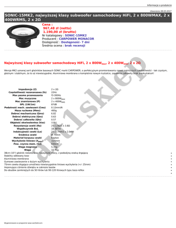Informacje o produkcie Utworzono 08-03-2017 SONIC-15MK2, najwyższej klasy subwoofer samochodowy HiFi, 2 x 800WMAX, 2 x 400WRMS, 2 x 2Ω Cena : 967,48 zł (netto) 1.190,00 zł (brutto) Nr katalogowy : SONIC-15MK2 Producent : CARPOWER MONACOR Dostępność : Dostępność- 7 dni Średnia ocena : brak recenzji le p Najwyższej klasy subwoofer samochodowy HiFi, 2 x 800WMAX, 2 x 400WRMS, 2 x 2Ω Wersja MK2 uznanej serii głośników basowych SONIC marki CARPOWER, o perfekcyjnym promieniowaniu nawet najniższych częstotliwości - tak czystym, głośnym i stabilnym, że to aż niewiarygodne. Aluminiowa membrana o kompletnie nowym kształcie, zapewnia całkowity brak zniekształceń! ar t1 sk Impedancja (Z) 2 x 2Ω Częstotliwość rezonansowa (fs) 22Hz Max pasmo przenoszenia f3-300Hz Moc muzyczna 2 x 800WMAX Moc znamionowa (P) 2 x 400WRMS SPL (1W/1m) 87dB Podatność mech. zawieszeń (Cms) 0.12mm/N Masa ruchoma (Mms) 400g Dobroć mechaniczna (Qms) 6.82 Dobroć elektryczna (Qes) 0.63 Dobroć całkowita (Qts) 0.57 Objętość ekwiwalentna (Vas) 119 l Rezystancja cewki (Re) 2 x 1.9Ω/1 x 3.8Ω Współczynnik BxL 18.88Tm Indukcyjność cewki (Le) 2 x 0.7mH/1 x 2.8mH Średnica cewki Ø 75mm Materiał korpusu cewki Kapton Wychylenie liniowe (XMAX) ±25mm 2 Pow. czynna mem. (Sd) 830cm Waga magnesu 5.1kg Waga 15.7kg 38cm (15") głośnik niskotonowy najwyższej mocy, z podwójną cewką drgającą Stabilny odlewany kosz Aluminiowa membrana Gumowe zawieszenie o dużym wychyleniu 75mm cewka drgająca umożliwia niewiarygodnie liniowe wychylenia (+/- 25mm) Imponujące ciśnienie dźwięku w zakresie basów Do obudów zamkniętych do 50 litrów lub 90-120 litrowych typu bass-reflex ● ● ● ● ● ● ● ● Wygenerowano w programie www.oscGold.com
