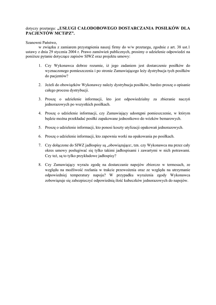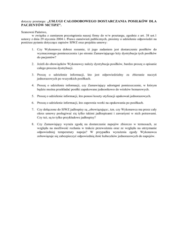 dotyczy przetargu: ,,USŁUGI CAŁODOBOWEGO DOSTARCZANIA POSIŁKÓW DLA PACJENTÓW MCTiPZ”. Szanowni Państwo, w związku z zamiarem przystąpienia naszej firmy do w/w przetargu, zgodnie z art. 38 ust.1 ustawy z dnia 29 stycznia 2004 r. Prawo zamówień publicznych, prosimy o udzielenie odpowiedzi na poniższe pytanie dotyczące zapisów SIWZ oraz projektu umowy: 1. Czy Wykonawca dobrze rozumie, iż jego zadaniem jest dostarczenie posiłków do wyznaczonego pomieszczenia i po stronie Zamawiającego leży dystrybucja tych posiłków do pacjentów? 2. Jeżeli do obowiązków Wykonawcy należy dystrybucja posiłków, bardzo proszę o opisanie całego procesu dystrybucji. 3. Proszę o udzielenie informacji, kto jest odpowiedzialny za zbieranie naczyń jednorazowych po wszystkich posiłkach. 4. Proszę o udzielenie informacji, czy Zamawiający udostępni pomieszczenie, w którym będzie można przekładać posiłki zapakowane jednostkowo do wózków bemarowych. 5. Proszę o udzielenie informacji, kto ponosi koszty utylizacji opakowań jednorazowych. 6. Proszę o udzielenie informacji, kto zapewnia worki na opakowania po posiłkach. 7. Czy dołączone do SIWZ jadłospisy są „obowiązujące:, tzn. czy Wykonawca ma przez cały okres umowy posługiwać się tylko takimi jadłospisami i zawartymi w nich potrawami. Czy też, są to tylko przykładowe jadłospisy? 8. Czy Zamawiający wyraża zgodę na dostarczanie napojów zbiorczo w termosach, ze względu na możliwość rozlania w trakcie przewożenia oraz ze względu na utrzymanie odpowiedniej temperatury napoju? W przypadku wyrażenia zgody Wykonawca zobowiązuje się zabezpieczyć odpowiednią ilość kubeczków jednorazowych do napojów.