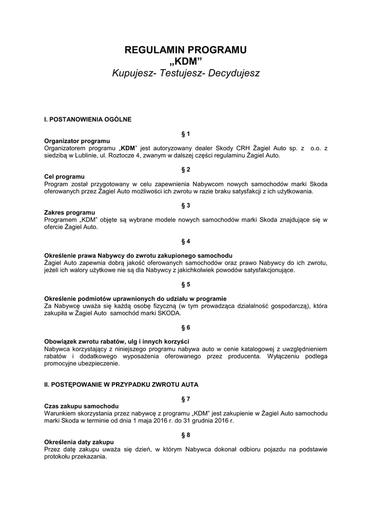 REGULAMIN PROGRAMU „KDM” Kupujesz- Testujesz- Decydujesz I. POSTANOWIENIA OGÓLNE §1 Organizator programu Organizatorem programu „KDM” jest autoryzowany dealer Skody CRH Żagiel Auto sp. z siedzibą w Lublinie, ul. Roztocze 4, zwanym w dalszej części regulaminu Żagiel Auto. o.o. z §2 Cel programu Program został przygotowany w celu zapewnienia Nabywcom nowych samochodów marki Skoda oferowanych przez Żagiel Auto możliwości ich zwrotu w razie braku satysfakcji z ich użytkowania. §3 Zakres programu Programem „KDM” objęte są wybrane modele nowych samochodów marki Skoda znajdujące się w ofercie Żagiel Auto. §4 Określenie prawa Nabywcy do zwrotu zakupionego samochodu Żagiel Auto zapewnia dobrą jakość oferowanych samochodów oraz prawo Nabywcy do ich zwrotu, jeżeli ich walory użytkowe nie są dla Nabywcy z jakichkolwiek powodów satysfakcjonujące. §5 Określenie podmiotów uprawnionych do udziału w programie Za Nabywcę uważa się każdą osobę fizyczną (w tym prowadząca działalność gospodarczą), która zakupiła w Żagiel Auto samochód marki SKODA. §6 Obowiązek zwrotu rabatów, ulg i innych korzyści Nabywca korzystający z niniejszego programu nabywa auto w cenie katalogowej z uwzględnieniem rabatów i dodatkowego wyposażenia oferowanego przez producenta. Wyłączeniu podlega promocyjne ubezpieczenie. II. POSTĘPOWANIE W PRZYPADKU ZWROTU AUTA §7 Czas zakupu samochodu Warunkiem skorzystania przez nabywcę z programu „KDM” jest zakupienie w Żagiel Auto samochodu marki Skoda w terminie od dnia 1 maja 2016 r. do 31 grudnia 2016 r. §8 Określenia daty zakupu Przez datę zakupu uważa się dzień, w którym Nabywca dokonał odbioru pojazdu na podstawie protokołu przekazania. §9 Termin i miejsce zwrotu samochodu Nabywca, aby skorzystać z prawa o jakim mowa w § 4 regulaminu dostarcza na własny koszt samochód z przebiegiem nie większym niż 1500 km oraz nie później niż do 7 dnia roboczego od daty jego wydania. § 10 Stan zwracanego samochodu Nabywca zwraca auto w stanie nieuszkodzonym, bez zarysowań i śladów zniszczeń wraz ze wszystkimi akcesoriami będącymi na wyposażeniu oryginalnie zakupionego samochodu. W zwracanym samochodzie obowiązuje podczas jego użytkowania całkowity zakaz palenia tytoniu. § 11 Opis przyczyny zwrotu Do zwracanego samochodu Skoda Nabywca może dołączyć własnoręczny opis przyczyn braku satysfakcji z produktu. § 12 Brak negatywnych skutków przy braku opisu przyczyny zwrotu Brak dołączonego opisu przyczyny zwrotu samochodu nie pozbawia Nabywcy możliwości skorzystania z uprawnienia określonego w §4 regulaminu, jak też nie rodzi jego innych zobowiązań. § 13 Koszty zwrotu samochodu Nabywca zobowiązuje się do pokrycia ryczałtowych kosztów w wysokości 500 zł netto + VAT za usługę doprowadzenia auta do stanu pierwotnego. W przypadku stwierdzenia jakichkolwiek wad w zwracanym samochodzie (np. zarysowań lakieru, wgnieceń w karoserii, zabrudzenia tapicerki itp.) Żagiel Auto ma prawo odmówić przyjęcia zwrotu auta bądź wycenić wartość usługi przywrócenia auta do stanu pierwotnego, przy czym koszty z tym związane ponosi Nabywca dokonujący zwrotu samochodu. Żagiel Auto nie zwraca Nabywcy kosztów poniesionych za rejestrację i ubezpieczenie samochodu oraz ewentualnych kosztów dodatkowych poniesionych przez nabywcę w związku z montażem i demontażem dodatkowego wyposażenia oraz z eksploatacją samochodu. § 14 Termin zwrotu ceny zakupu samochodu Żagiel Auto zwróci Nabywcy kwotę zakupu samochodu, widniejącą na fakturze sprzedaży w terminie 3 dni roboczych od dnia zwrotu samochodu. Żagiel Auto nie jest zobowiązaną do odkupu w cenach sprzedaży widniejących na fakturze dodatkowych akcesoriów (dodatkowego wyposażenia) zakupionych przed nabywcę samochodu. § 15 Określenie sposobu zwrotu i ceny zakupu Zwrot auta następuje na podstawie umowy sprzedaży zawartej między Nabywcą a Żagiel Auto. Nabywca korzystając z uprawnienia określonego w § 4 ma obowiązek wskazać sposób zwrotu pieniędzy – podać numer konta w banku, na który ma być dokonany zwrot pieniędzy. § 16 Cel zbierania informacji o przyczynie zwrotu W wypadku dołączenia przez nabywcę opisu przyczyny zwrotu samochodu do zwróconego produktu, informacje w nim zawarte będą wykorzystywane przez Żagiel Auto przede wszystkim celem przekazania ich Importerowi i Producentowi marki Skoda. § 17 Odmowa przyjęcia zwrotu samochodu Żagiel Auto może odmówić Nabywcy zwrotu zakupionego samochodu w przypadku niespełnienia przez nabywcę postanowień § 10 lub § 13 § 18 Wyłączenie odpowiedzialności organizatora za niestaranność Nabywcy Żagiel Auto nie ponosi jakiejkolwiek odpowiedzialności odszkodowawczej w wypadku przesłania pieniędzy za zwrócony towar na źle podany przez nabywcę numer konta. III. POSTANOWIENIA KOŃCOWE § 19 Zmiany w regulaminie CRH Żagiel Auto sp. z o.o. z siedzibą w Lublinie, ul .Roztocze 4 zastrzega sobie możliwość dokonywania w każdym czasie zmian w postanowieniach niniejszego regulaminu. § 20 Prawo do ostatecznej interpretacji regulaminu W wypadku jakichkolwiek wątpliwości związanych ze stosowaniem niniejszego regulaminu Żagiel Auto zastrzega sobie prawo do ostatecznej interpretacji jego postanowień. W wypadku wątpliwości co do stosowania regulaminu Nabywca ma w każdym czasie prawo zwrócić się do Żagiel Auto o dokonanie właściwej wykładni jego postanowień. § 21 Miejsce udostępnienia nowej wersji regulaminu W wypadku zmiany regulaminu jego nowa wersja zostanie niezwłocznie udostępniona na witrynie internetowej pod adresem www.auto.zagie.pl IV. Formularz zwrotu samochodu Imię: …………………………………………………………………………………………………...…………… Nazwisko: …………………………………………………………………………………………………….……