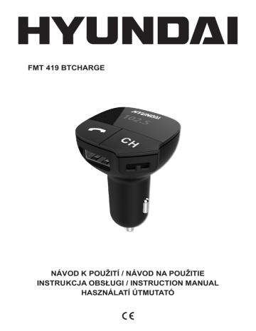 FMT 419 BTCHARGE NÁVOD K POUŽITÍ / NÁVOD NA POUŽITIE INSTRUKCJA OBSŁUGI / INSTRUCTION MANUAL HASZNÁLATÍ ÚTMUTATÓ DŮLEŽITÉ: Přečtěte si prosím před použitím návod a uschovejte jej k pozdějšímu využití. ÚVOD • Děkujeme vám za zakoupení tohoto výrobku. Nyní máte kompletní sadu bezdrátového hudebního systému, takže vy a vaše rodina či přátelé si můžete užívat poslechu hudby v autě. • Přečtěte si prosím tento návod k použití, abyste se dozvěděli, jak správně s přístrojem zacházet. Po přečtení návodu k použití jej uložte na bezpečné místo k možnému pozdějšímu využití. UPOZORNĚNÍ: • Používejte napětí 12 V stejnosměrného proud. Vyšší napětí může způsobit, že přístroj nebude správně fungovat nebo dojde k jeho poškození. • Nezapojujte přístroj do zdířky zapalovače automobilu, když jej startujete, jinak může dojít k poškození přístroje. • Pokud vysílač FM delší dobu nepoužíváte, odpojte jej. • Při volbě frekvence se snažte maximálně vyhýbat silným místním rozhlasovým signálům, aby nedošlo k vzájemnému rušení na úkor kvality. • Pokud nelze vyhledat hudbu, zkontrolujte, zda je nastavení frekvence v automobilu a na přístroji stejné nebo zkuste dlouhým stisknutím tlačítka pro zvýšení hlasitosti zvýšit hlasitost výstupu. • Nenabíjejte pomocí přístroje více zařízení najednou, aby nedošlo k překročení proudové kapacity a poškození přístroje. • Pokud pomocí tohoto přístroje nabíjíte mobilní telefon nebo tablet, nepoužívejte je dlouhodobě. VYOBRAZENÍ VÝROBKU 1. Pozitivní pól kolíku 2. Negativní pól kolíku 3. Digitální panel LED – červené světlo 4. Otvor mikrofonu 5. Tlačítko kanálu FM / přijetí hovoru 6. Tlačítko přijetí hovoru / volání 7. Nahoru / dolů / přehrávání / pauza / hlasitost 8. Konektor USB (2,1 A) pro nabíjení CZ - 2 CZ FUNKCE 1) Poskytuje maximální nabíjecí proud 5 V / 2,1 A, lze použít pro všechny mobilní telefony a tablety. 2) Velmi malá velikost, nastavitelný úhel pro přizpůsobení jakémukoliv typu automobilu, neruší při řízení. 3) Displej LED, snadné ovládání. 4) Automatická paměť pro frekvence. 5) Vysoce kvalitní telefonování přes Bluetooth. 6) Podpora přehrávání hudby přes Bluetooth. 7) Tlačítka ovládají volání pomocí Bluetooth a přehrávání hudby. 8) Úplný frekvenční rozsah 87,6 – 107,90 MHz, zvolit lze libovolnou frekvenci (pokud je frekvence stejná jako u autorádia). OVLÁDÁNÍ TLAČÍTKY 1) Tlačítko " " slouží pro zavěšení a přijetí hovoru, krátkým stisknutím můžete přijmout hovor nebo zavěsit. V režimu zařízení USB má krátký stisk funkci přehrávání a pauzy. 2) Tlačítko “CH”: chcete-li změnit frekvenci, krátce stiskněte tlačítko „CH“ a poté pomocí knoflíku 7 změňte vysílací frekvenci. Dlouhým stisknutím tlačítka „CH“ změníte režim. Dlouhým stisknutím po dobu 2 až 3 vteřin přepnete mezi režimy nastavení frekvence a Bluetooth. V režimu Bluetooth můžete při telefonování krátkým stisknutím tlačítka "CH" přepnout na soukromé volání. 3) Tlačítko 7 je dynamické multifunkční tlačítko. Při přehrávání hudby můžete jedním zatlačením doprava přejít na další skladbu; delším zatlačení zvýšíte hlasitost. Krátkým zatlačením doleva přejdete na předchozí skladbu. Delším zatlačení snížíte hlasitost. V režimu přehrávání USB přepnete dlouhým stisknutím po dobu 2 až 3 vteřin do režimu přehrávání ve smyčce. PŘIPOJENÍ POMOCÍ FUNKCE BLUETOOTH 1) Zapojte vysílač BT FM do otvoru pro zapalovač svého automobilu. Přístroj se zapne s upozorněním na připojení prostřednictvím funkce Bluetooth. Telefon začne vyhledávat zařízení s funkcí Bluetooth. Najděte zařízení pod názvem „HYUNDAI FMT419BT“ a kliknutím jej připojte. Po připojení zařízení se zobrazí hudební tipy (zařízení s funkcí Bluetooth je připojeno) (Poznámka: v různém režimu se zobrazují různá hudební oznámení). 2) Když je vysílač připojen k mobilnímu telefonu, můžete přehrávat hudbu z telefonu. Tlačítky lze ovládat režim přehrávání Bluetooth. NABÍJENÍ USB Maximální výstup USB je 5 V a 2,1 A střídavého proudu. Zařízení je kompatibilní s mobilními telefony a tablety. V případě potřeby nabití připojte do vstupu USB mobilní telefon nebo tablet. PARAMETRY VÝROBKU Vstupní napětí: stejnosměrný proud 12 V Provozní proud: < 100 mA (pokud se nenabíjí mobilní telefon nebo jiné zařízení) Přenosová rychlost: 32 Kbps 320K Frekvence FM: 87,6 – 107,90 MHz; 0,1 MHz jako krok Velikost zkreslení frekvence: < 1 % Dosah vysílání FM: ≤ 3 m Bluetooth verze: V2.1+EDR Podporované protokoly Bluetooth: A2DP/AVRCP/HSP/HFP Výstupní proud USB: ≤ 2,1 A Výstupní napětí USB: ≤ 5,2 V CZ - 3 Poznámka: Specifikace se mění v důsledku neustálých inovací. Vyhrazujeme si právo na jejich změnu bez předchozího upozornění. Informace o ochraně životního prostředí Udělali jsme to nejlepší pro snížení množství obalů a zajistili jsme jejich snadné rozdělení na 3 materiály: lepenka, papírová drť a roztažený polyetylén. Tento přístroj obsahuje materiály, které mohou být po demontáži specializovanou společností recyklovány. Dodržujte prosím místní nařízení týkající se nakládání s balícími materiály, vybitými bateriemi a starým zařízením. Likvidace starého elektrozařízení a použitých baterií a akumulátorů Tento symbol na výrobku, jeho příslušenství nebo na jeho obalu označuje, že s výrobkem nesmí být nakládáno jako s domácím odpadem. Po ukončení životnosti odevzdejte prosím výrobek nebo baterii (pokud je přiložena) v příslušném místě zpětného odběru, kde bude pr
