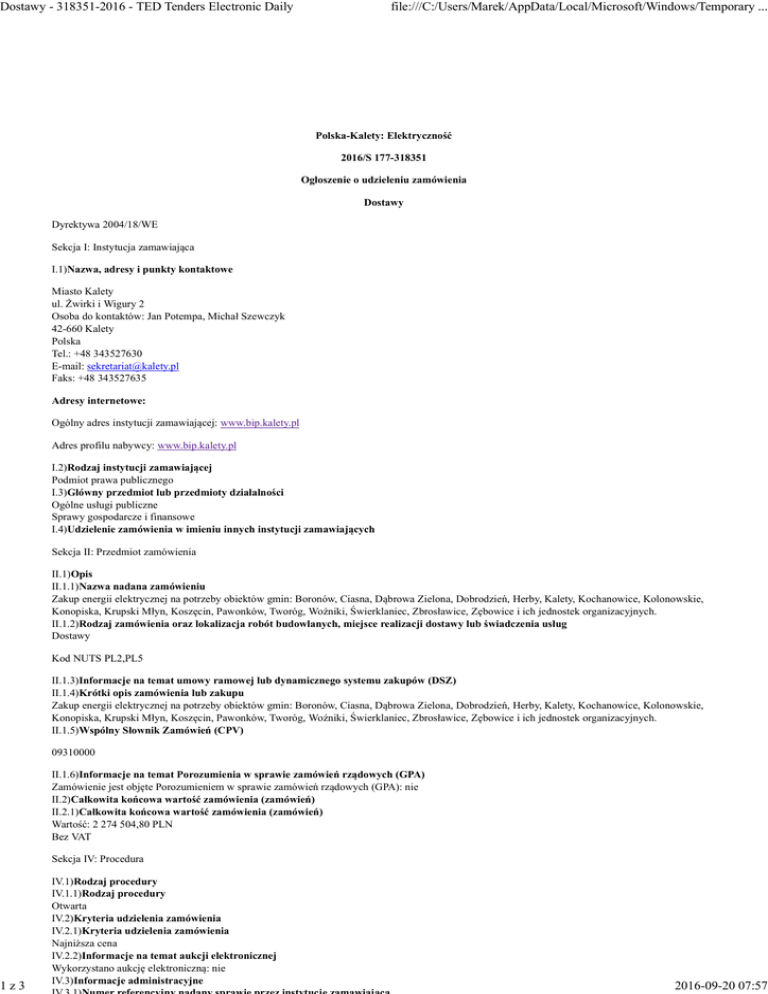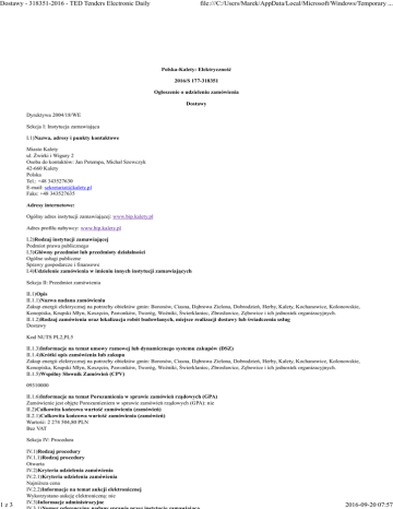 Dostawy - 318351-2016 - TED Tenders Electronic Daily 1z3 file:///C:/Users/Marek/AppData/Local/Microsoft/Windows/Temporary ... Polska-Kalety: Elektryczność 2016/S 177-318351 Ogłoszenie o udzieleniu zamówienia Dostawy Dyrektywa 2004/18/WE Sekcja I: Instytucja zamawiająca I.1)Nazwa, adresy i punkty kontaktowe Miasto Kalety ul. Żwirki i Wigury 2 Osoba do kontaktów: Jan Potempa, Michał Szewczyk 42-660 Kalety Polska Tel.: +48 343527630 E-mail: [email protected] Faks: +48 343527635 Adresy internetowe: Ogólny adres instytucji zamawiającej: www.bip.kalety.pl Adres profilu nabywcy: www.bip.kalety.pl I.2)Rodzaj instytucji zamawiającej Podmiot prawa publicznego I.3)Główny przedmiot lub przedmioty działalności Ogólne usługi publiczne Sprawy gospodarcze i finansowe I.4)Udzielenie zamówienia w imieniu innych instytucji zamawiających Sekcja II: Przedmiot zamówienia II.1)Opis II.1.1)Nazwa nadana zamówieniu Zakup energii elektrycznej na potrzeby obiektów gmin: Boronów, Ciasna, Dąbrowa Zielona, Dobrodzień, Herby, Kalety, Kochanowice, Kolonowskie, Konopiska, Krupski Młyn, Koszęcin, Pawonków, Tworóg, Woźniki, Świerklaniec, Zbrosławice, Zębowice i ich jednostek organizacyjnych. II.1.2)Rodzaj zamówienia oraz lokalizacja robót budowlanych, miejsce realizacji dostawy lub świadczenia usług Dostawy Kod NUTS PL2,PL5 II.1.3)Informacje na temat umowy ramowej lub dynamicznego systemu zakupów (DSZ) II.1.4)Krótki opis zamówienia lub zakupu Zakup energii elektrycznej na potrzeby obiektów gmin: Boronów, Ciasna, Dąbrowa Zielona, Dobrodzień, Herby, Kalety, Kochanowice, Kolonowskie, Konopiska, Krupski Młyn, Koszęcin, Pawonków, Tworóg, Woźniki, Świerklaniec, Zbrosławice, Zębowice i ich jednostek organizacyjnych. II.1.5)Wspólny Słownik Zamówień (CPV) 09310000 II.1.6)Informacje na temat Porozumienia w sprawie zamówień rządowych (GPA) Zamówienie jest objęte Porozumieniem w sprawie zamówień rządowych (GPA): nie II.2)Całkowita końcowa wartość zamówienia (zamówień) II.2.1)Całkowita końcowa wartość zamówienia (zamówień) Wartość: 2 274 504,80 PLN Bez VAT Sekcja IV: Procedura IV.1)Rodzaj procedury IV.1.1)Rodzaj procedury Otwarta IV.2)Kryteria udzielenia zamówienia IV.2.1)Kryteria udzielenia zamówienia Najniższa cena IV.2.2)Informacje na temat aukcji elektronicznej Wykorzystano aukcję elektroniczną: nie IV.3)Informacje administracyjne 2016-09-20 07:57 Dostawy - 318351-2016 - TED Tenders Electronic Daily 2z3 file:///C:/Users/Marek/AppData/Local/Microsoft/Windows/Temporary ... IV.2.2)Informacje na temat aukcji elektronicznej Wykorzystano aukcję elektroniczną: nie IV.3)Informacje administracyjne IV.3.1)Numer referencyjny nadany sprawie przez instytucję zamawiającą WSiRG.700.ZE.OK.2016 IV.3.2)Poprzednie publikacje dotyczące tego samego zamówienia Ogłoszenie o zamówieniu Numer ogłoszenia w Dz.U.: 2016/S 127-228401 z dnia 5.7.2016 Sekcja V: Udzielenie zamówienia Zamówienie nr: WSiRG.700.ZE.OK.2016 Nazwa: Zakup energii elektrycznej na potrzeby obiektów gmin: Boronów, Ciasna, Dąbrowa Zielona, Dobrodzień, Herby, Kalety, Kochanowice, Kolonowskie, Konopiska, Krupski Młyn, Koszęcin, Pawonków, Tworóg, Woźniki, Świerklaniec, Zbrosławice, Zębowice i ich jednostek organizacyjnych. V.1)Data decyzji o udzieleniu zamówienia: 6.9.2016 V.2)Informacje o ofertach Liczba otrzymanych ofert: 5 Liczba ofert otrzymanych środkami elektronicznymi: 0 V.3)Nazwa i adres wykonawcy, na rzecz którego została wydana decyzja o udzieleniu zamówienia GOEE Energia Sp. z o.o. Gwiaździsta 7c/2 01-651 Warszawa Polska E-mail: [email protected] Tel.: +48 224631819 Adres internetowy: www.goee.eu Faks: +48 224631819 V.4)Informacje na temat wartości zamówienia Początkowa szacunkowa całkowita wartość zamówienia: Wartość: 2 555 691,20 PLN Bez VAT Całkowita końcowa wartość zamówienia: Wartość: 2 274 504,80 PLN Bez VAT Jeżeli jest to wartość roczna lub miesięczna,: liczbę lat: 1 V.5)Informacje na temat podwykonawstwa Przewidywane jest zlecenie podwykonawstwa w ramach zamówienia: nie Sekcja VI: Informacje uzupełniające VI.1)Informacje o funduszach Unii Europejskiej Zamówienie dotyczy projektu/programu finansowanego ze środków Unii Europejskiej: nie VI.2)Informacje dodatkowe: Zakup energii elektrycznej odbywać się będzie na podstawie umów pomiędzy Wykonawcą a Odbiorcami: Lp. Nazwa firmy Adres firmy 1 Gmina Boronów 42-283 Boronów ul. Dolna 2 2 Gmina Ciasna 42-793 Ciasna ul. Nowa 1a 3 Gmina Dąbrowa Zielona 42-265 Dąbrowa Zielona, Pl. Kościuszki 31, 4 Gmina Dobrodzień 46-380 Dobrodzień Plac Wolności 1 5 Gmina Herby 42-284 Herby ul. Lubliniecka 33 6 Miasto Kalety 42-660 Kalety ul. Żwirki i Wigury 2 7 Gmina Kochanowice 42-713 Kochanowice Wolności 5 8 Gmina Kolonowskie 47-110 Kolonowskie Ks. Czerwionki 39 9 Gmina Konopiska 42-274 Konopiska, Lipowa 5 10 Gmina Koszęcin 42-286 Koszęcin, Powstańców Śląskich 10 11 Gmina Krupski Młyn 42-693 Krupski Młyn, Krasickiego 9 12 Gmina Pawonków 42-772 Pawonków Zawadzkiego 7 13 Gmina Świerklaniec 42-622 Świerklaniec, Młyńska 3 14 Gmina Tworóg 42-690 Tworóg, Zamkowa 1 15 Gmina Woźniki 42-289 Woźniki, Rynek 11 16 Gmina Zbrosławice 42-674 Zbrosławice, Oświęcimska 2 17 Gmina Zębowice 46-048 Zębowice Murka 2 18 Zakład Gospodarki Komunalnej i Mieszkaniowej w Zbrosławicach 42-674 Zbrosławice, Oświęcimska 6 19 Gminny Ośrodek Pomocy Społecznej w Zbrosławicach 42-674 kamieniec, Tarnogórska 4a 20 Gminny Zespół Obsługi Placówek Oświatowych 42-674 Zbrosławice, Wolności 108 21 Szkoła Podstawowa w Ziemięcicach 42-677 Ziemięcice, Szkolna 6 22 Szkoła Podstawowa w Czekanowie 42-677 Czekanów, Szkolna 26 23 Gminne Przedszkole nr 8 w Przezchlebiu 42-674 Przezchlebie, Mikulczycka 11 24 Gminne Przedszkole nr 1 w Zbrosławicach 42-674 Zbrosławice, Batorego 6 25 Gminne Przedszkole nr 4 w Świętoszowicach 42-675 Świętoszowice, Mikulczycka 89 26 Gminne Przedszkole nr 3 w Kamieńcu 42-