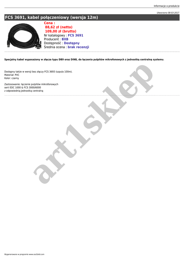 Informacje o produkcie Utworzono 08-03-2017 FCS 3691, kabel połączeniowy (wersja 12m) Cena : 88,62 zł (netto) 109,00 zł (brutto) Nr katalogowy : FCS 3691 Producent : BXB Dostępność : Dostępny Średnia ocena : brak recenzji Dostępny także w wersji bez złączy FCS 3693 (szpula 100m). Materiał: PVC Kolor: czarny ar t1 sk Zastosowanie: łączenie pulpitów mikrofonowych serii EDC 1000 & FCS 3000/6000 z odpowiednią jednostką centralną le p Specjalny kabel wyposażony w złącza typu DB9 oraz DIN8, do łączenia pulpitów mikrofonowych z jednostką centralną systemu. Wygenerowano w programie www.oscGold.com