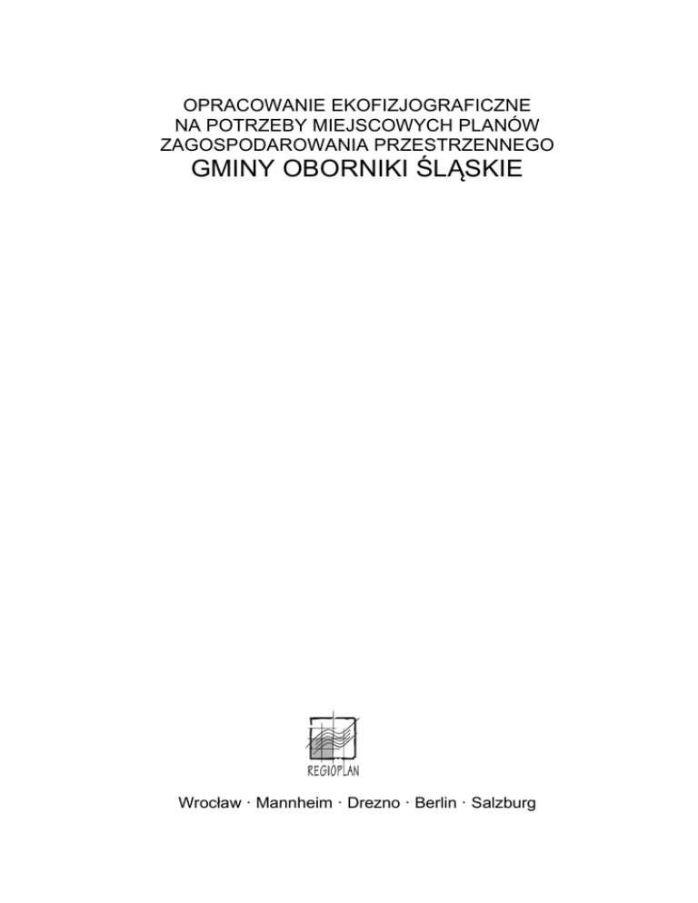 OPRACOWANIE EKOFIZJOGRAFICZNE NA POTRZEBY MIEJSCOWYCH PLANÓW ZAGOSPODAROWANIA PRZESTRZENNEGO GMINY OBORNIKI ŚLĄSKIE Wrocław · Mannheim · Drezno · Berlin · Salzburg Opracowanie ekofizjograficzne na potrzeby miejscowych planów zagospodarowania przestrzennego gminy Oborniki Śl. REGIOPLAN sp. z.o.o. Wrocław Opracowanie ekofizjograficzne na potrzeby miejscowych planów zagospodarowania przestrzennego gminy Oborniki Śląskie Zleceniodawca: Urząd Miasta i Gminy Oborniki Śl. Opracowanie: dr Roman Michalik mgr Jacek Koźma mgr Izabela Boczar Sylwia Wieczorek REGIOPLAN sp. z o. o. ul. Wolbromska 7 53-148 Wrocław tel./fax. (071) 33 80 253 e-mail [email protected] Strona 2 styczeń 2003 Opracowanie ekofizjograficzne na potrzeby miejscowych planów zagospodarowania przestrzennego gminy Oborniki Śl. REGIOPLAN sp. z.o.o. Wrocław Strona 3 styczeń 2003 SPIS TREŚCI: 1. CEL OPRACOWANIA I PODSTAWY PRAWNE .................................................................................... 4 2. ROZPOZNANIE I ANALIZA STANU ŚRODOWISKA PRZYRODNICZEGO ......................................... 7 2.1. CHARAKTERYSTYKA ELEMENTÓW ŚRODOWISKA ..................................................................................... 7 Położenie............................................................................................................................................... 7 Rzeźba terenu ....................................................................................................................................... 7 Budowa geologiczna ............................................................................................................................. 7 Surowce mineralne................................................................................................................................ 8 Wody powierzchniowe......................................................................................................................... 10 Wody podziemne................................................................................................................................. 11 Gleby ................................................................................................................................................... 12 Klimat .................................................................................................................................................. 13 Świat roślin .......................................................................................................................................... 13 Świat zwierząt ..................................................................................................................................... 15 2.2. FUNKCJONOWANIE ŚRODOWISKA I POWIĄZANIA PRZYRODNICZE ............................................................ 17 Procesy geodynamiczne ..................................................................................................................... 17 Procesy hydrologiczne. ....................................................................................................................... 17 Dynamika klimatu i lokalne warunki klimatyczne ................................................................................ 18 Zachowanie i ochrona procesów biologicznych. ................................................................................. 18 Odporność i zdolność środowiska do regeneracji............................................................................... 19 2.3. STAN OCHRONY ŚRODOWISKA I ZASOBÓW............................................................................................ 20 2.3.1. Obszary i obiekty chronione...................................................................................................... 20 2.3.2. Obszary i obiekty proponowane do objęcia ochroną ................................................................ 21 2.3.3. Pozostałe elementy środowiska przyrodniczego podlegające ochronie................................... 22 2.3.4. Ochrona konserwatorska .......................................................................................................... 23 3. OCENA STANU ŚRODOWISKA........................................................................................................... 28 3.1. ZAGROŻENIA ŚRODOWISKA I ICH ŹRÓDŁA ............................................................................................. 28 Zagrożenia i degradacja środowiska................................................................................................... 28 Zanieczyszczenie wód powierzchniowych .......................................................................................... 28 Zanieczyszczenie wód podziemnych .................................................................................................. 30 Zanieczyszczenie powietrza atmosferycznego ................................................................................... 31 Zanieczyszczenie gleb ........................................................................................................................ 33 Hałas ................................................................................................................................................... 34 3.2. W STĘPNA PROGNOZA ZMIAN ZACHODZĄCYCH W ŚRODOWISKU .............................................................. 35 4. OKREŚLENIE UWARUNKOWAŃ EKOFIZJOGRAFICZNYCH ........................................................... 36 4.1 TERENY O FUNKCJACH PRZYRODNICZYCH ............................................................................................. 37 4.2 PRZYDATNOŚĆ TERENÓW DLA ZABUDOWY ............................................................................................ 38 4.3. OGRANICZENIA ZAGOSPODAROWANIA .................................................................................................. 40 Strefy ujęć