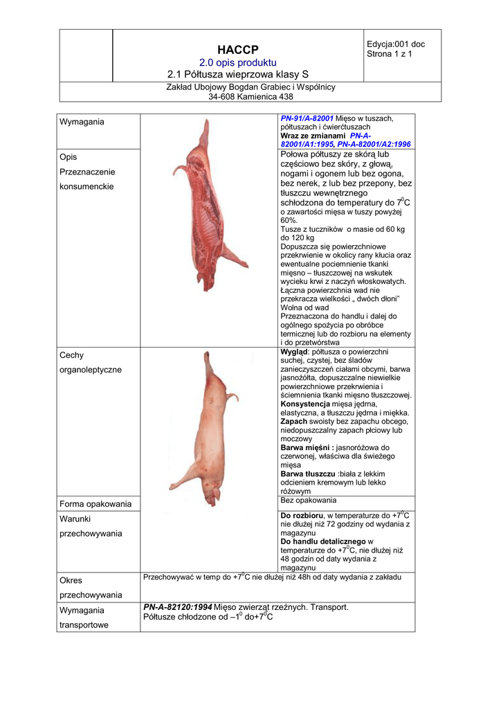 2.0 opis produktu 2.1 Półtusza wieprzowa klasy S