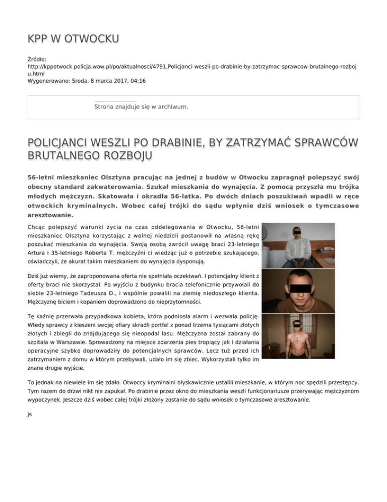 KPP W OTWOCKU Źródło: http://kppotwock.policja.waw.pl/po/aktualnosci/4791,Policjanci-weszli-po-drabinie-by-zatrzymac-sprawcow-brutalnego-rozboj u.html Wygenerowano: Środa, 8 marca 2017, 04:16 Strona znajduje się w archiwum. POLICJANCI WESZLI PO DRABINIE, BY ZATRZYMAĆ SPRAWCÓW BRUTALNEGO ROZBOJU 56-letni mieszkaniec Olsztyna pracując na jednej z budów w Otwocku zapragnął polepszyć swój obecny standard zakwaterowania. Szukał mieszkania do wynajęcia. Z pomocą przyszła mu trójka młodych mężczyzn. Skatowała i okradła 56-latka. Po dwóch dniach poszukiwań wpadli w ręce otwockich kryminalnych. Wobec całej trójki do sądu wpłynie dziś wniosek o tymczasowe aresztowanie. Chcąc polepszyć warunki życia na czas oddelegowania w Otwocku, 56-letni mieszkaniec Olsztyna korzystając z wolnej niedzieli postanowił na własną rękę poszukać mieszkania do wynajęcia. Swoją osobą zwrócił uwagę braci 23-letniego Artura i 35-letniego Roberta T. mężczyźni ci wiedząc już o potrzebie szukającego, oświadczyli, że akurat takim mieszkaniem do wynajęcia dysponują. Dziś już wiemy, że zaproponowana oferta nie spełniała oczekiwań. I potencjalny klient z oferty braci nie skorzystał. Po wyjściu z budynku bracia telefonicznie przywołali do siebie 23-letniego Tadeusza D., i wspólnie powalili na ziemię niedoszłego klienta. Mężczyznę biciem i kopaniem doprowadzono do nieprzytomności. Tę kaźnię przerwała przypadkowa kobieta, która podniosła alarm i wezwała policję. Wtedy sprawcy z kieszeni swojej ofiary skradli portfel z ponad trzema tysiącami złotych złotych i zbiegli do znajdującego się nieopodal lasu. Mężczyzna został zabrany do szpitala w Warszawie. Sprowadzony na miejsce zdarzenia pies tropiący jak i działania operacyjne szybko doprowadziły do potencjalnych sprawców. Lecz tuż przed ich zatrzymaniem z domu w którym przebywali, udało im się zbiec. Wykorzystali tylko im znane drugie wyjście. To jednak na niewiele im się zdało. Otwoccy kryminalni błyskawicznie ustalili mieszkanie, w którym noc spędzili przestępcy. Tym razem do drzwi nikt nie zapukał. Po drabinie przez okno do mieszkania weszli funkcjonariusze przerywając mężczyznom wypoczynek. Jeszcze dziś wobec całej trójki złożony zostanie do sądu wniosek o tymczasowe aresztowanie. js Ocena: 0/5 (0) Tweetnij