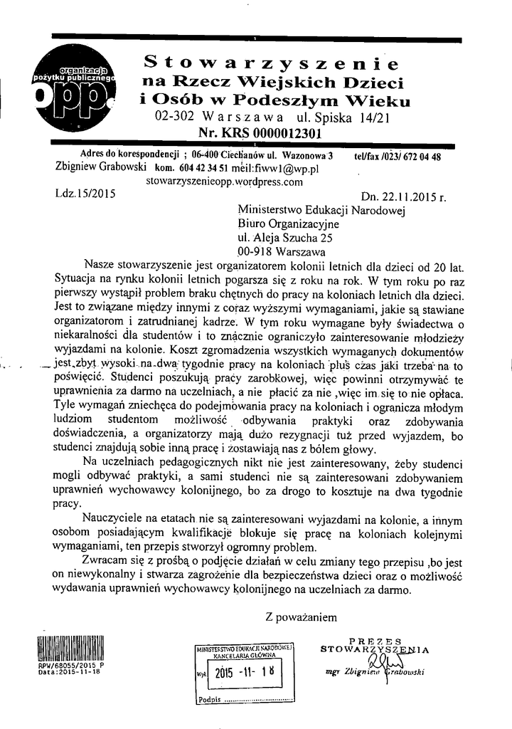 Stowarzyszenie na Rzecz Wiejskich Dzieci i Osob w Podeszlym Wieku 02-302 W a r s z a w a ul. Spiska 14/21 Nr. KRS 0000012301 Adresdo korespondencji ; 06-400 Ciech'anow ul. Wazonowa 3 tel/fax/023/672 04 48 Zbigniew Grabowski kom. 604 42 34 51 meil:fiw\vl@\vp.pl stowarzyszenieopp.wordpress.com Ldz. 15/2015 Dn. 22.11.2015 r, Ministerstwo Edukacji Narodowej Biuro Organizacyjne ul. Aleja Szucha 25 00-918 Warszawa Nasze stowarzyszenie jest organizatorem kolonii ietnich dla dzieci od 20 lat. Sytuacja na rynku kolonii Ietnich pogarsza si? z roku na rok. W tym roku po raz pierwszy w y s t ^ i l problem braku ch^tnych do pracy na koloniach Ietnich dla dzieci. Jest to zwi^zane mi^dzy innymi z coraz wyzszymi wymaganiami, jakie s^ stawiane organizatorom i zatrudnianej kadrze. W tym roku wymagane byb/ swiadectwa o niekaralnosci dla studentow i to znacznie ograniczylo zainteresowanie mtodziezy wyjazdami na kolonie. Koszt zgromadzenia wszystkich wymaganych dokumentow jest.zbyt wysoki na.dwa tygodnie pracy na koloniach plus czas jaki trzeba na to poswi^cic. Studenci poszukuj^ pracy zarobkowej, wi?c powinni otrzymywac te uprawnienia za darmo na uczelniach, a nie placic za nie ,wi?c im si? to nie oplaca. Tyle wymagan zniech^ca do podejmbwania pracy na koloniach i ogranicza mlodym ludziom studentom mozliwosc odbywania praktyki oraz zdobywania doswiadczenia, a organizatorzy maj^^ duzo rezygnacji tuz przed wyjazdem, bo studenci znajduj^sobie inn^prac? i zostawiaj^nas z bolem gtowy. Na uczelniach pedagogicznych nikt nie jest zainteresowany, zeby studenci mogli odbywac praktyki, a sami studenci nie s^^ zainteresowani zdobywaniem uprawnien wychowawcy kolonijnego, bo za drogo to kosztuje na dwa tygodnie pracy. Nauczyciele na etatach nie s^ zainteresowani wyjazdami na kolonie, a innym osobom posiadaj^cym kwalifikacje blokuje si? prac? na koloniach kolejnymi wymaganiami, ten przepis stworzyl ogromny problem. Zwracam si? z prosb^o podj?cie dziakn w celu zmiany tego przepisu ,bo jest on niewykonalny i stwarza zagrozehie dla bezpieczenstwa dzieci oraz o mozliwosc wydawania uprawnien wychowawcy kolonijnego na uczelniach za darmo. Z powazaniem MiNISTEKSBW EDUKACJI KASODOV. tJ VANrFiARlAGlOWNA RPW/68055/2015 P Oata:2015-tl-18 2015 -11- 1 » PRE ZES STOWARZYSZEKIA mgr ZOignieiii 'CraOoiuski