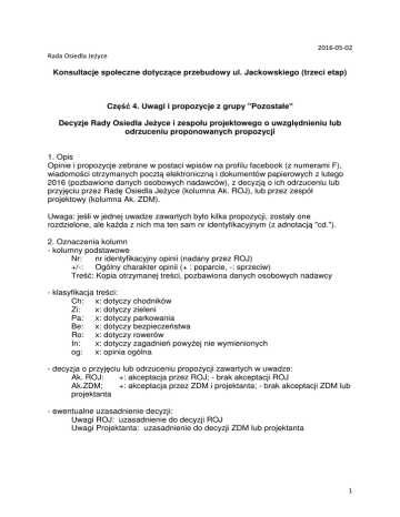 2016-05-02 Rada Osiedla Jeżyce Konsultacje społeczne dotyczące przebudowy ul. Jackowskiego (trzeci etap) Część 4. Uwagi i propozycje z grupy "Pozostałe" Decyzje Rady Osiedla Jeżyce i zespołu projektowego o uwzględnieniu lub odrzuceniu proponowanych propozycji 1. Opis Opinie i propozycje zebrane w postaci wpisów na profilu facebook (z numerami F), wiadomości otrzymanych pocztą elektroniczną i dokumentów papierowych z lutego 2016 (pozbawione danych osobowych nadawców), z decyzją o ich odrzuceniu lub przyjęciu przez Radę Osiedla Jeżyce (kolumna Ak. ROJ), lub przez zespół projektowy (kolumna Ak. ZDM). Uwaga: jeśli w jednej uwadze zawartych było kilka propozycji, zostały one rozdzielone, ale każda z nich ma ten sam nr identyfikacyjnym (z adnotacją "cd."). 2. Oznaczenia kolumn - kolumny podstawowe Nr: nr identyfikacyjny opinii (nadany przez ROJ) +/-: Ogólny charakter opinii (+ : poparcie, -: sprzeciw) Treść: Kopia otrzymanej treści, pozbawiona danych osobowych nadawcy - klasyfikacja treści: Ch: x: dotyczy chodników Zi: x: dotyczy zieleni Pa: x: dotyczy parkowania Be: x: dotyczy bezpieczeństwa Ro: x: dotyczy rowerów In: x: dotyczy zagadnień powyżej nie wymienionych og: x: opinia ogólna - decyzja o przyjęciu lub odrzuceniu propozycji zawartych w uwadze: Ak. ROJ: +: akceptacja przez ROJ; - brak akceptacji ROJ Ak.ZDM: +: akceptacja przez ZDM i projektanta; - brak akceptacji ZDM lub projektanta - ewentualne uzasadnienie decyzji: Uwagi ROJ: uzasadnienie do decyzji ROJ Uwagi Projektanta: uzasadnienie do decyzji ZDM lub projektanta 1 Nr +/- F4 + F8 4 + - Treść Jeśli rzeczywiście powstanie taka przestrzeń jak na wizkach to będę wniebowzięty bo mam już dosć przeciskania się między autami, a scianami kamienic. Bardzo ładnie. Zyska na tym ulica moich wspomnień. cd. 1 C h Z i P a B e R o I n o g A k . R O J 5 jest cd. cd.1 Uwagi ROJ Uwagi Projektanta x x x + Na projekcie przedstawiono jedynie koncepcję ogólną, kosze na śmieci będą projektowane szczegółowo w następnej fazie. x + Przekazano do uwzględnienia na poziomie projektu szczegółowego. 2. Kosze na śmieci Na projekcie znalazłem 7 koszy na śmieci, czy to nie trochę za mało ? zwłaszcza patrząc na to, że niektóre znajdują się obok siebie... (chyba. że nie są uwzględnione kosze istniejące, to ok, będzie ich więcej) + A k . Z D M 2. Wnoszę o dodanie dodatkowych koszy na śmieci na odcinku ulicy od ul. Dłuogsza do Gorczyczewskiego. Zakładam że istniejące kosze na śmiecu zostaną w swojej lokalizacji utrzymane. Na moim planie oznaczyłem kolorem czerwonym proponowaną loklalizację dwóch dodatkowych koszy. Uzasadnienie: dziś istnieją kosze na śmieci na narożniku Jackowskiego i Gorcyczewskiego i potem daleko w połowie odcinka ul. Długosza. Ul. Jackowskiego w tym rejonie jest regularnie zaśmiecona. Dotyczy to zwykłych śmieci a także ogromnej ilości niesprzątanych psich kup. Trudno w mieście 2 uzyskać czystość jeśli jest zbyt mało koszy na śmieci. !!! Nie analizowałem pod tym kątem pozostałej części ul. Jackowskiego ale uważam z zasady porównując do rozwiązań w takich miastach jak np. Warszawa, że kosze są po prostu zbyt rzadko. 5 + jest cd. cd. 3 4. Wnoszę o to aby wykonać nawierzchnię chodników z nowoczesnych płyt betonowych. Uzasadnienie: Nie jest mi znany projekt szczegółowy przebudowy. Konsultacjom poddano koncepcję więc zakładam, że tego rodzaju decyzje zapadną później. Apeluję więc aby uniknąć wszechobecnego „poz-bruku” („kostki Bauma”) jako nawierzchni najniższej jakości i standardu. Ulica Jackowskiego w rejonie do ul. Polnej jest zabudowana starymi kamienicami i nawierzchnia jest w złym stanie ale jednak są to w części przynajmnie kamienne granitowe płyty. Czyli po prostu porządne miejskie rozwiązanie godne europejskiego miasta. Zakładam więc że nawierzchnia na tym odcinku nie będzie gorsza i inaczej sobie tego nie wyobrażam i myślę że stanowisko Miejskiego Konserwatora Zabytków będzie podobne. Za to w rejonie od Polnej do Długosza niawierzchnie chodników są równie zniszczone ale wykonane z płytek chodnikowych kwadratowych słabej jakości. Zamiana tego na „pozbruk” będzie także uważam błędem oraz po prostu degradacją jakościową. Nawierzchnia z pozbruku niezależznie od kolorystyki po prostu źle się starzeje, po krótszym czasie podlega odkształceniu geometrii, przerasta trawą w większym stopniu, jest hałaśliwa (rower, wózek i ciągnięta walizka na kółkach, jazda na rolkach) i po prostu odstaje wizualnie od pięknych miejskich chodników. Dbająć o jakość wizualną i architektoniczną oraz o komfrot x + Nawierzchnia chodników będzie zgodna z katalogiem nawierzchni chodnikowych Miasta Poznania (uzgodnionego ostatecznie w tym roku), gdzie dla poszczególnych części Jeżyc przewidziano odpowiednie, ogólnie obowiązujące typy nawierzchni. 3 życia mieszkańców apeluję o wykluczenie z rozważań nad nawierzchnią ul. Jackowskiego w każdym zakresie kostki typu „pozbruk”niezależnie od wykończenia i koloru. Apeluję by były to wielkoformatowe płyty granitowe lub wielkoformatowe płyty chodnikowe betonowe (np. 60x60cm) wykonane w nowoczesnej technologii, o dużej grubości i nośności oraz ułożone na odpowiednio przygotowanym podkładzie. 5 + jest cd. cd. 6 x + 7. Wnoszę o wymianę latarń na ulicy na metalowe, miejskie, o starannie wybranym wzorze i kolorze, zgodnym ze wzorem uzgodnionym i stosowanym w całym Poznaniu oraz o tym aby miały odpowiedni kolor światła – jasny, biały o ciepłym odcieniu (rozwiązanie i standard już znany i stosowany w Poznaniu np. Stary Rynek) + Rada Osiedla zawarła już ten postulat w wytycznych do projektu. Mam nadzieję na uwzględnienie moich uwag do koncepcji w dalszych etapach projektu oraz w realizacji. 11 + W razie pytań i wątpliwości pozostaję do dyspozcyji z racji żywego zainteresowania tematem. Po