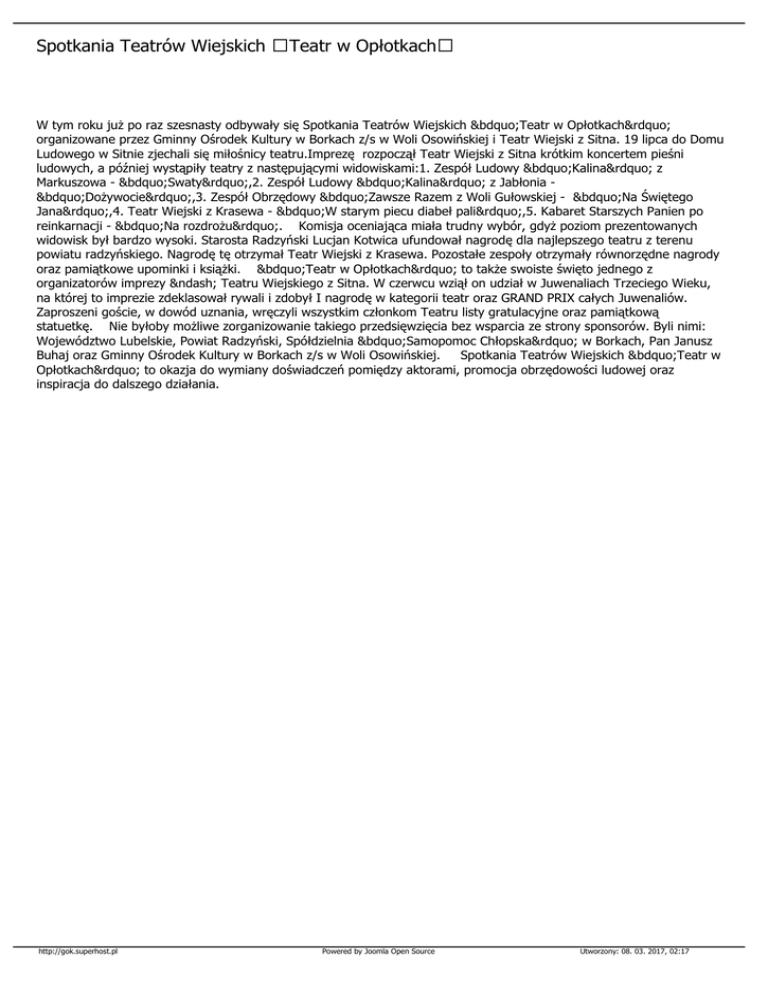 Spotkania Teatrów Wiejskich Teatr w Opłotkach W tym roku już po raz szesnasty odbywały się Spotkania Teatrów Wiejskich „Teatr w Opłotkach” organizowane przez Gminny Ośrodek Kultury w Borkach z/s w Woli Osowińskiej i Teatr Wiejski z Sitna. 19 lipca do Domu Ludowego w Sitnie zjechali się miłośnicy teatru.Imprezę rozpoczął Teatr Wiejski z Sitna krótkim koncertem pieśni ludowych, a później wystąpiły teatry z następującymi widowiskami:1. Zespół Ludowy „Kalina” z Markuszowa - „Swaty”,2. Zespół Ludowy „Kalina” z Jabłonia „Dożywocie”,3. Zespół Obrzędowy „Zawsze Razem z Woli Gułowskiej - „Na Świętego Jana”,4. Teatr Wiejski z Krasewa - „W starym piecu diabeł pali”,5. Kabaret Starszych Panien po reinkarnacji - „Na rozdrożu”. Komisja oceniająca miała trudny wybór, gdyż poziom prezentowanych widowisk był bardzo wysoki. Starosta Radzyński Lucjan Kotwica ufundował nagrodę dla najlepszego teatru z terenu powiatu radzyńskiego. Nagrodę tę otrzymał Teatr Wiejski z Krasewa. Pozostałe zespoły otrzymały równorzędne nagrody oraz pamiątkowe upominki i książki. „Teatr w Opłotkach” to także swoiste święto jednego z organizatorów imprezy – Teatru Wiejskiego z Sitna. W czerwcu wziął on udział w Juwenaliach Trzeciego Wieku, na której to imprezie zdeklasował rywali i zdobył I nagrodę w kategorii teatr oraz GRAND PRIX całych Juwenaliów. Zaproszeni goście, w dowód uznania, wręczyli wszystkim członkom Teatru listy gratulacyjne oraz pamiątkową statuetkę. Nie byłoby możliwe zorganizowanie takiego przedsięwzięcia bez wsparcia ze strony sponsorów. Byli nimi: Województwo Lubelskie, Powiat Radzyński, Spółdzielnia „Samopomoc Chłopska” w Borkach, Pan Janusz Buhaj oraz Gminny Ośrodek Kultury w Borkach z/s w Woli Osowińskiej. Spotkania Teatrów Wiejskich „Teatr w Opłotkach” to okazja do wymiany doświadczeń pomiędzy aktorami, promocja obrzędowości ludowej oraz inspiracja do dalszego działania. http://gok.superhost.pl Powered by Joomla Open Source Utworzony: 08. 03. 2017, 02:17