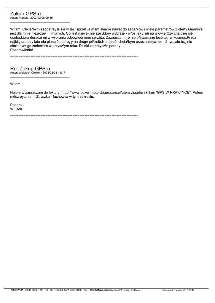 Zakup GPS-u Autor: Franek - 2003/02/08 09:35 _____________________________________ Witam! Chcia³bym zaopatrzyæ siê w taki sprzêt ,a mam alergiê nawet do zegarków i wiele parametrów z oferty Garmin'a jest dla mnie niezrozu- mia³ych. Co jest najwa¿niejsze ,który wybraæ - w³os je¿y siê na g³owie.Czy znajdzie siê osoba,która doradzi mi w wybraniu odpowiedniego sprzêta. Zaznaczam,¿e nie p³ywam,nie lecê te¿ w kosmos.Przez najbli¿sze trzy lata nie planujê podró¿y na drug± pó³kulê.Na sprzêt chcia³bym przeznaczyæ do 2-tys.,ale te¿ nie chcialbym go zmieniaæ w przysz³ym roku. Dzieki za przysz³e porady. Pozdrowienia! ============================================================================ Re: Zakup GPS-u Autor: Wojciech Olejnik - 2003/02/08 19:17 _____________________________________ Witam Najpierw zapraszam do lektury : http://www.boxer-motor.triger.com.pl/utensylia.php i kliknij "GPS W PRAKTYCE". Potem mêcz pytaniami Zbyszka - fachowca w tym zakresie. Pozdro.. WOjtek ============================================================================ ARCHIWUM FoRUM BOXER-MOTOR - MOTOCYKLE BMW sklep BOXER-PARTS.eu MamboBoard czê¶ci i akcesoria Forum Component version: 1.4 Stable Generated: 8 March, 2017, 04:17