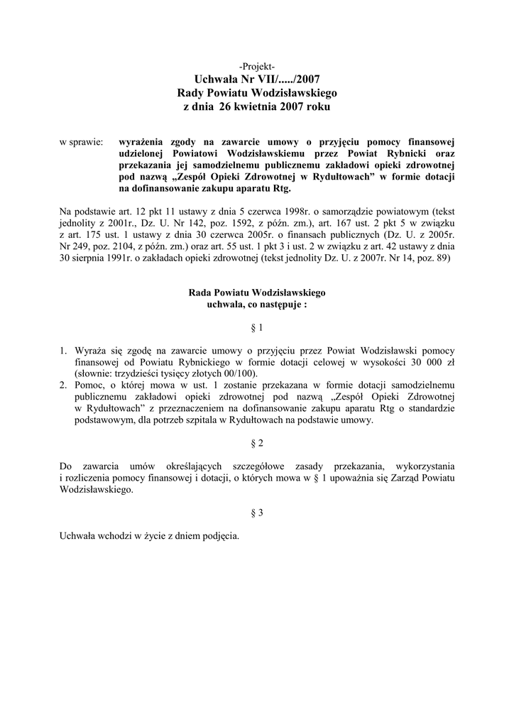 -Projekt- Uchwała Nr VII/...../2007 Rady Powiatu Wodzisławskiego z dnia 26 kwietnia 2007 roku w sprawie: wyraŜenia zgody na zawarcie umowy o przyjęciu pomocy finansowej udzielonej Powiatowi Wodzisławskiemu przez Powiat Rybnicki oraz przekazania jej samodzielnemu publicznemu zakładowi opieki zdrowotnej pod nazwą „Zespół Opieki Zdrowotnej w Rydułtowach” w formie dotacji na dofinansowanie zakupu aparatu Rtg. Na podstawie art. 12 pkt 11 ustawy z dnia 5 czerwca 1998r. o samorządzie powiatowym (tekst jednolity z 2001r., Dz. U. Nr 142, poz. 1592, z późn. zm.), art. 167 ust. 2 pkt 5 w związku z art. 175 ust. 1 ustawy z dnia 30 czerwca 2005r. o finansach publicznych (Dz. U. z 2005r. Nr 249, poz. 2104, z późn. zm.) oraz art. 55 ust. 1 pkt 3 i ust. 2 w związku z art. 42 ustawy z dnia 30 sierpnia 1991r. o zakładach opieki zdrowotnej (tekst jednolity Dz. U. z 2007r. Nr 14, poz. 89) Rada Powiatu Wodzisławskiego uchwala, co następuje : §1 1. WyraŜa się zgodę na zawarcie umowy o przyjęciu przez Powiat Wodzisławski pomocy finansowej od Powiatu Rybnickiego w formie dotacji celowej w wysokości 30 000 zł (słownie: trzydzieści tysięcy złotych 00/100). 2. Pomoc, o której mowa w ust. 1 zostanie przekazana w formie dotacji samodzielnemu publicznemu zakładowi opieki zdrowotnej pod nazwą „Zespół Opieki Zdrowotnej w Rydułtowach” z przeznaczeniem na dofinansowanie zakupu aparatu Rtg o standardzie podstawowym, dla potrzeb szpitala w Rydułtowach na podstawie umowy. §2 Do zawarcia umów określających szczegółowe zasady przekazania, wykorzystania i rozliczenia pomocy finansowej i dotacji, o których mowa w § 1 upowaŜnia się Zarząd Powiatu Wodzisławskiego. §3 Uchwała wchodzi w Ŝycie z dniem podjęcia. UZASADNIENIE do projektu uchwały Nr VII/...../2007 Rady Powiatu Wodzisławskiego z dnia 26 kwietnia 2007 roku w sprawie: wyraŜenia zgody na zawarcie umowy o przyjęciu pomocy finansowej udzielonej Powiatowi Wodzisławskiemu przez Powiat Rybnicki oraz przekazania jej samodzielnemu publicznemu zakładowi opieki zdrowotnej pod nazwą „Zespół Opieki Zdrowotnej w Rydułtowach” w formie dotacji na dofinansowanie zakupu aparatu Rtg. Rada Powiatu w Rybniku podjęła uchwałę w sprawie udzielenia pomocy finansowej Powiatowi Wodzisławskiemu w wysokości 30 000 zł, z przeznaczeniem na zakup aparatu Rtg dla potrzeb szpitala w Rydułtowach. MoŜliwość udzielenia takiej pomocy Powiatowi Wodzisławskiemu stwarza zapis art. 167 ust. 2 ustawy z dnia 30 czerwca 2005r. o finansach publicznych, który stanowi, iŜ wydatki budŜetów jednostek samorządu terytorialnego przeznaczone są na realizację zadań określonych w odrębnych przepisach, w tym w szczególności na pomoc finansową dla innych jednostek samorządu terytorialnego. Natomiast zgodnie z zapisami art. 175 ust. 2 ww. ustawy podstawą przekazania środków na realizację pomocy finansowej dla innej jednostki samorządu terytorialnego jest umowa określająca przeznaczenie i zasady rozliczania tych środków. Dlatego teŜ konieczne jest podjęcie przez Radę Powiatu Wodzisławskiego stosownej uchwały o wyraŜeniu zgody na zawarcie umowy o przyjęciu przez Powiat Wodzisławski niniejszej pomocy. Jednocześnie zaznaczyć naleŜy, iŜ art. 55 ust. 2 ustawy z dnia 30 sierpnia 1991r. o zakładach opieki zdrowotnej stanowi, iŜ dotacje dla zakładu przyznaje organ, który zakład utworzył. Z tego względu koniecznym jest wskazanie w uchwale, iŜ niniejsza pomoc finansowa zostanie przekazana przez Powiat Wodzisławski w formie dotacji Zespołowi Opieki Zdrowotnej w Rydułtowach. Mając na uwadze powyŜsze, wnoszę jak w sentencji przedłoŜonego projektu uchwały. Naczelnik Wydziału Zdrowia i Polityki Społecznej /-/ Iwona Koczy